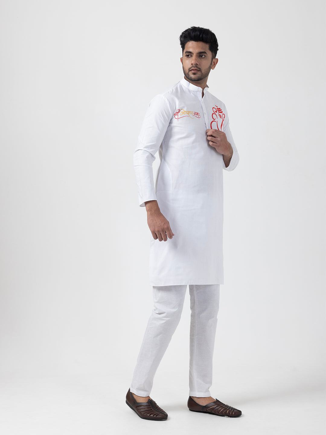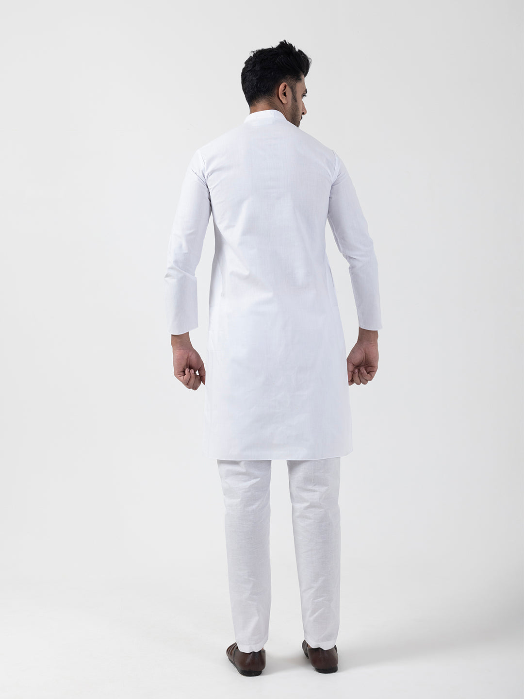 Pair this White kurta with white churidar or slim-fit trousers for a timeless ethnic look. Complete the outfit with leather loafers or traditional juttis to make a bold style statement.