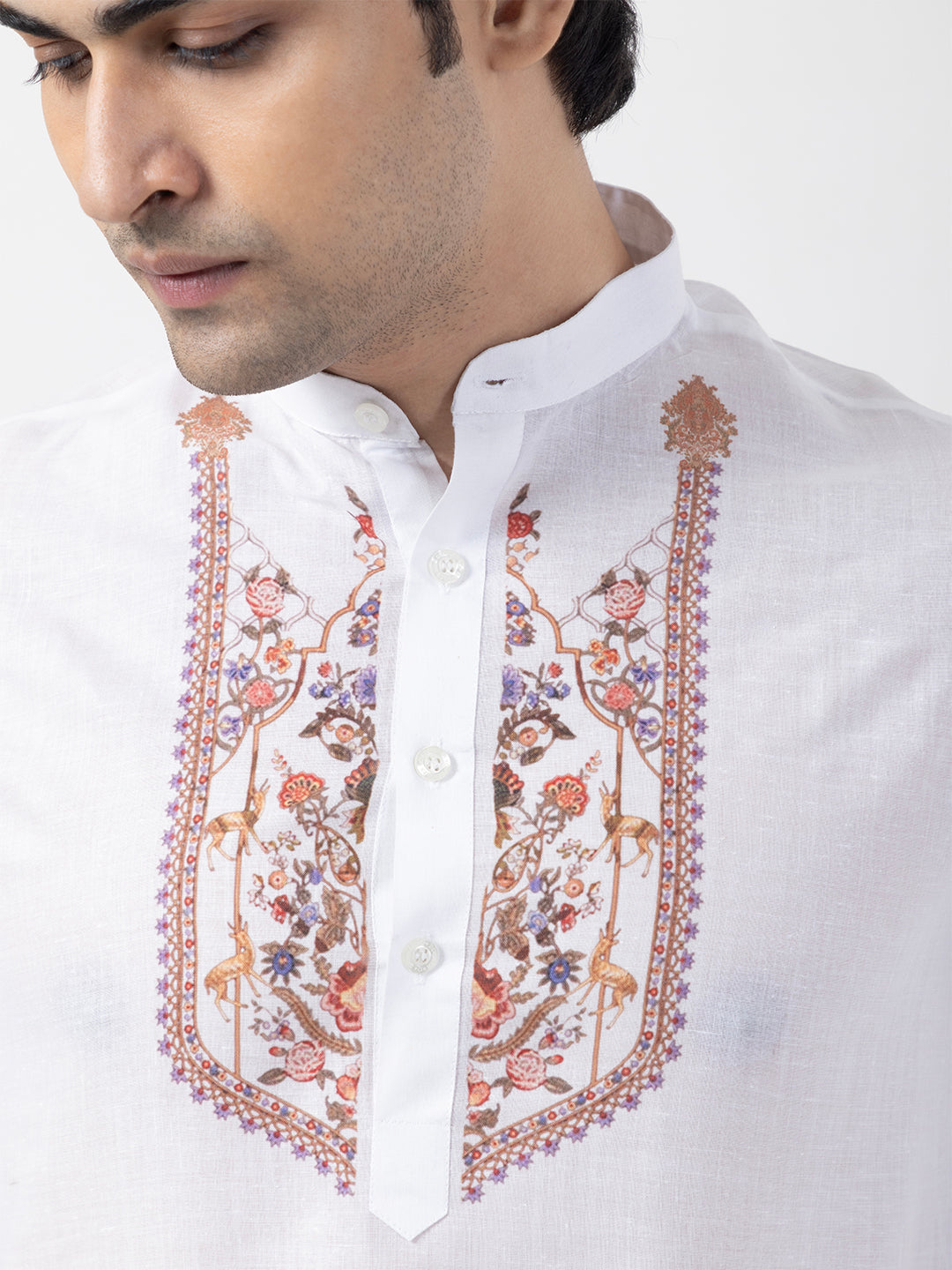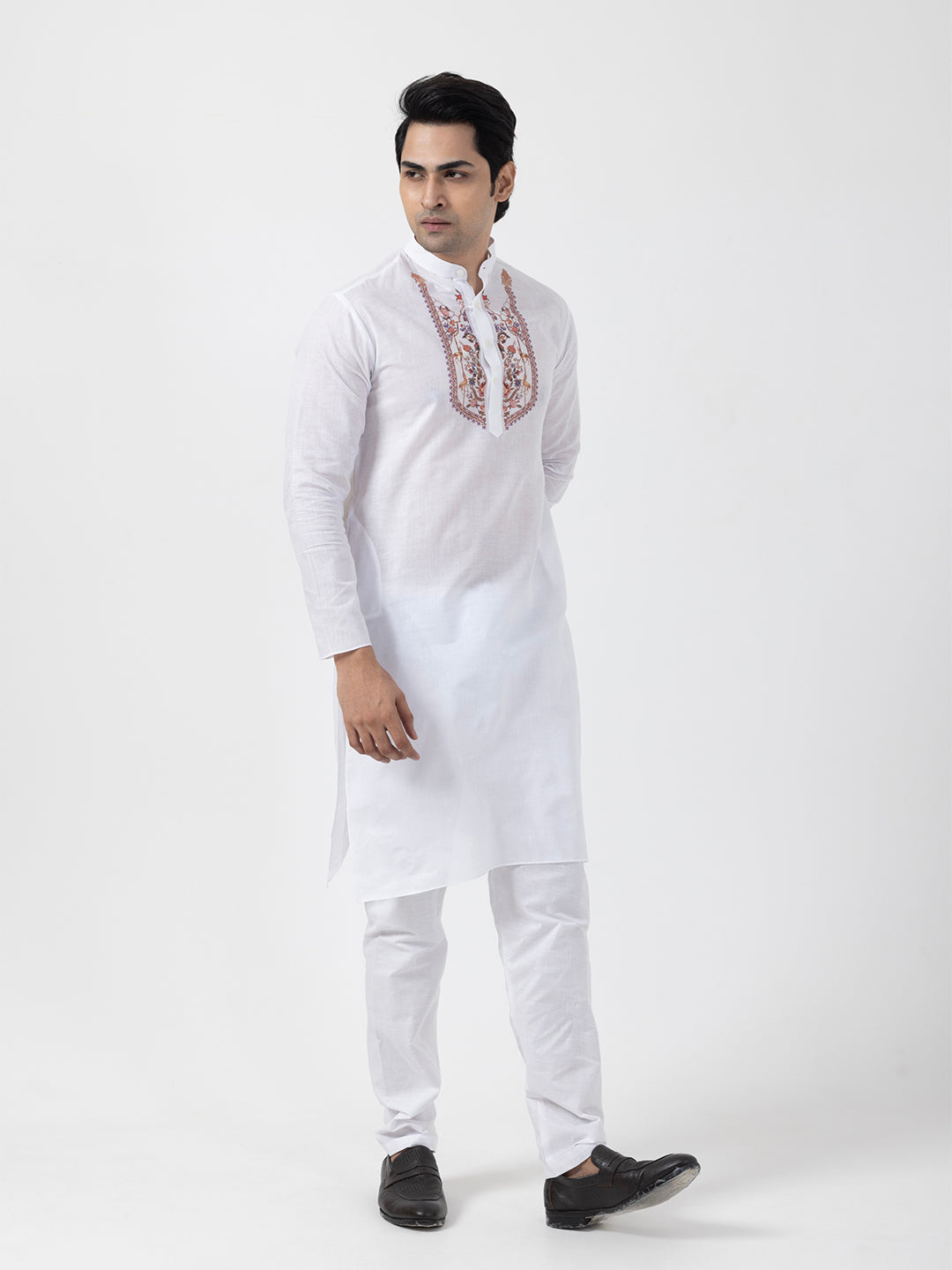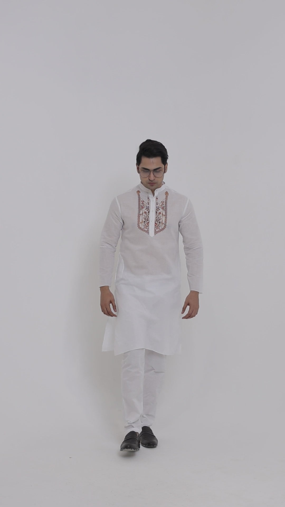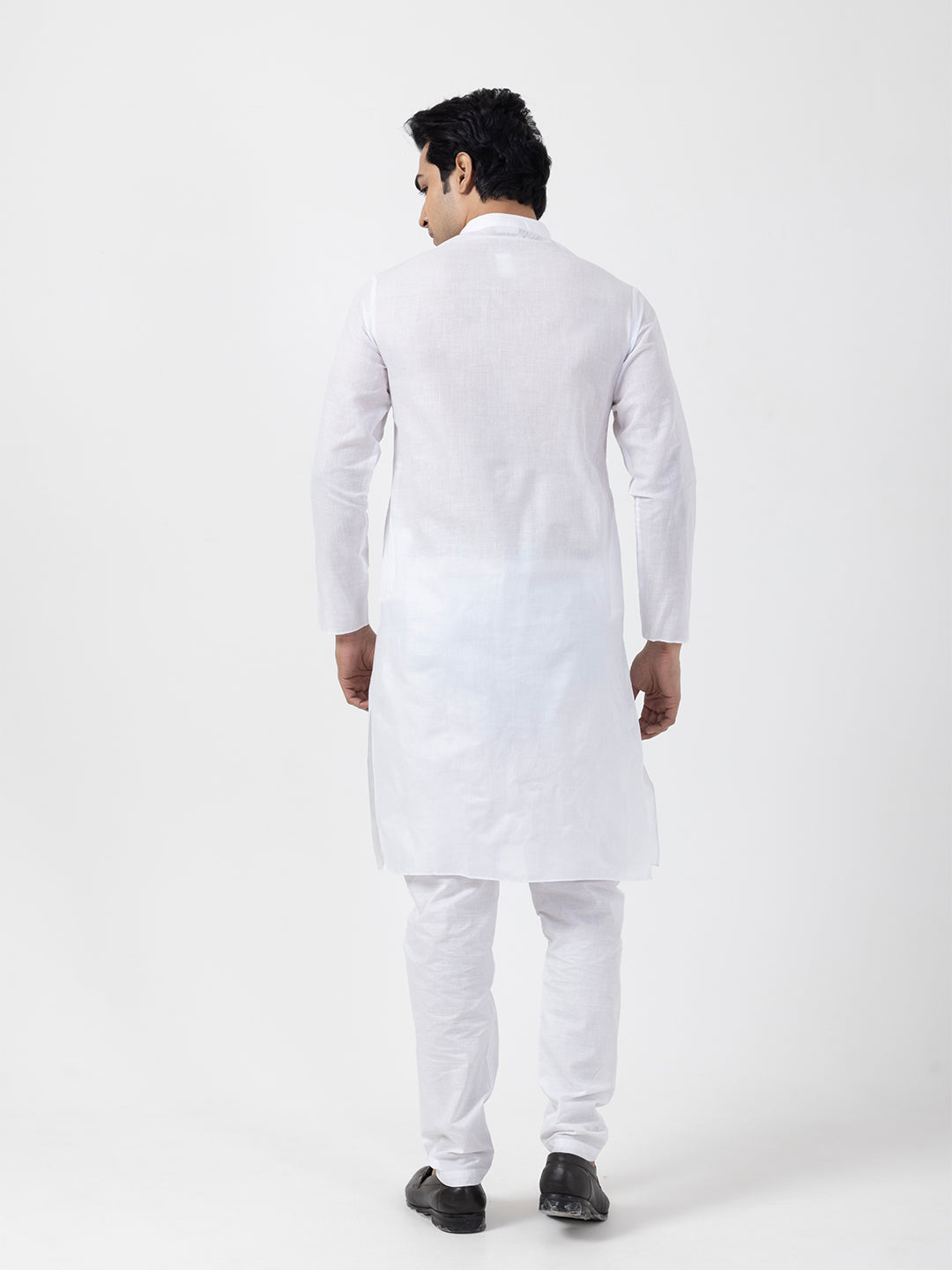 "Elevate your ethnic style with this White cotton kurta and white pyjama set. Designed for comfort and elegance, it features a subtle print and a mandarin collar, perfect for festive and cultural occasions."