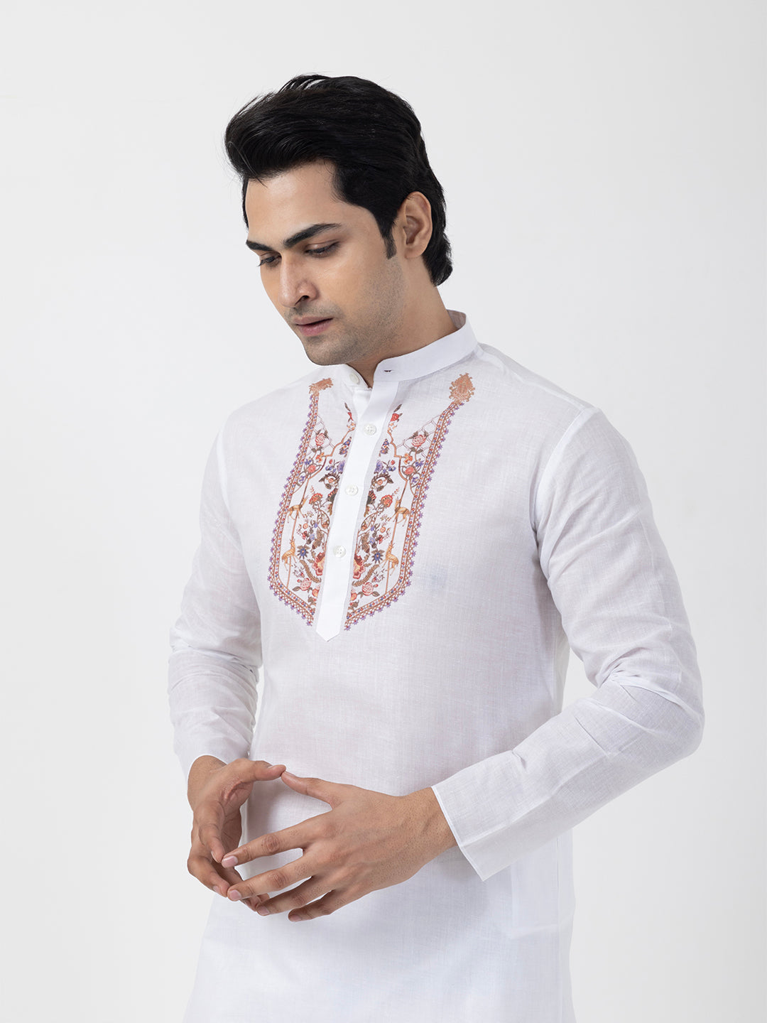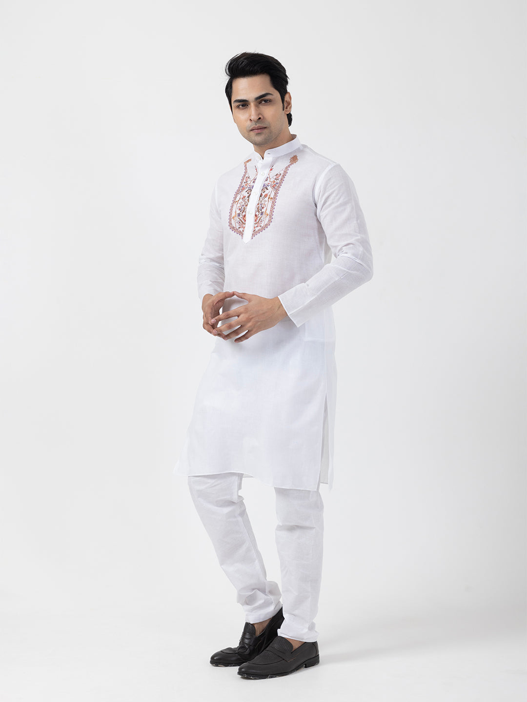 Pair this White kurta with white churidar or slim-fit trousers for a timeless ethnic look. Complete the outfit with leather loafers or traditional juttis to make a bold style statement.