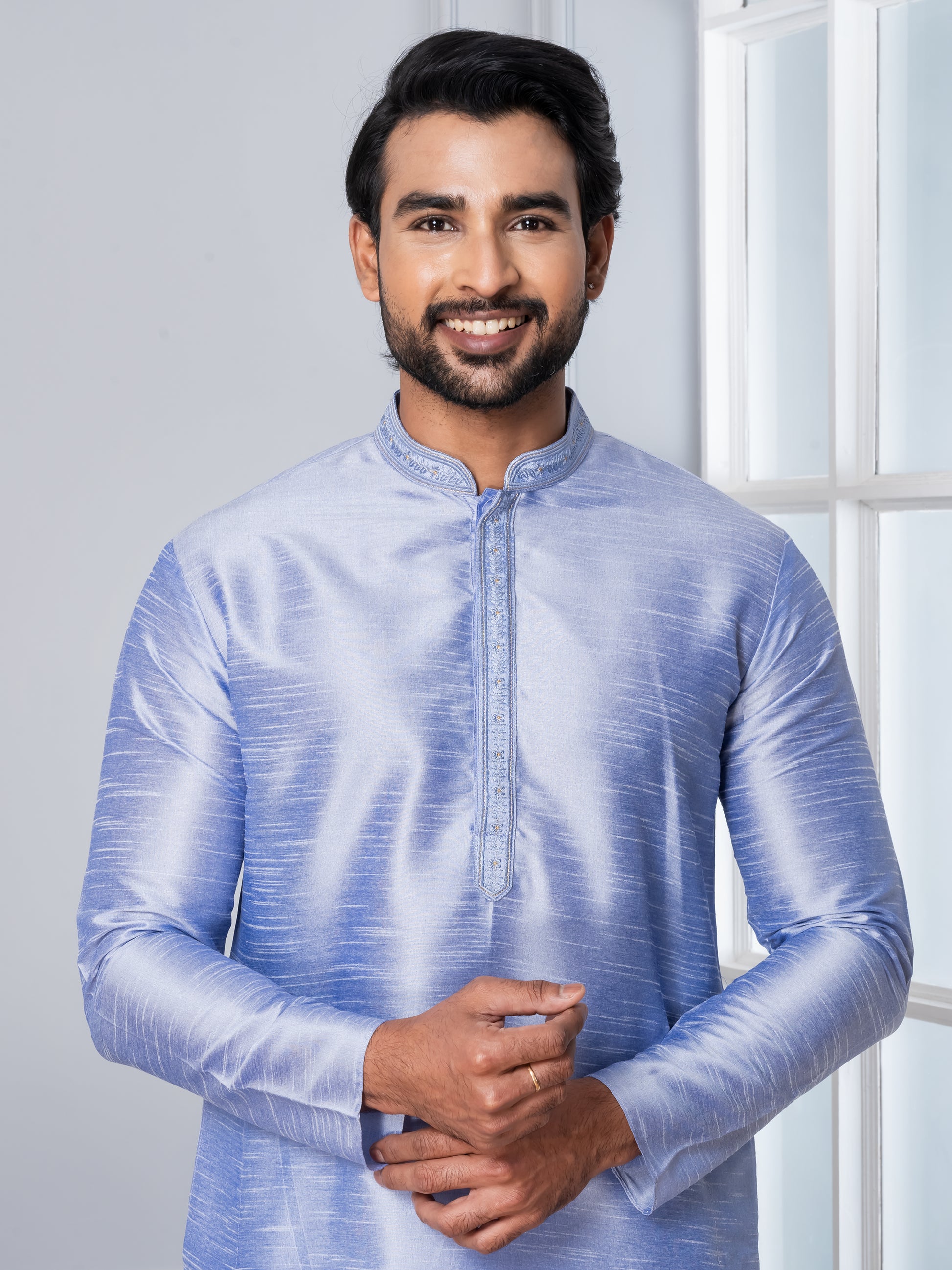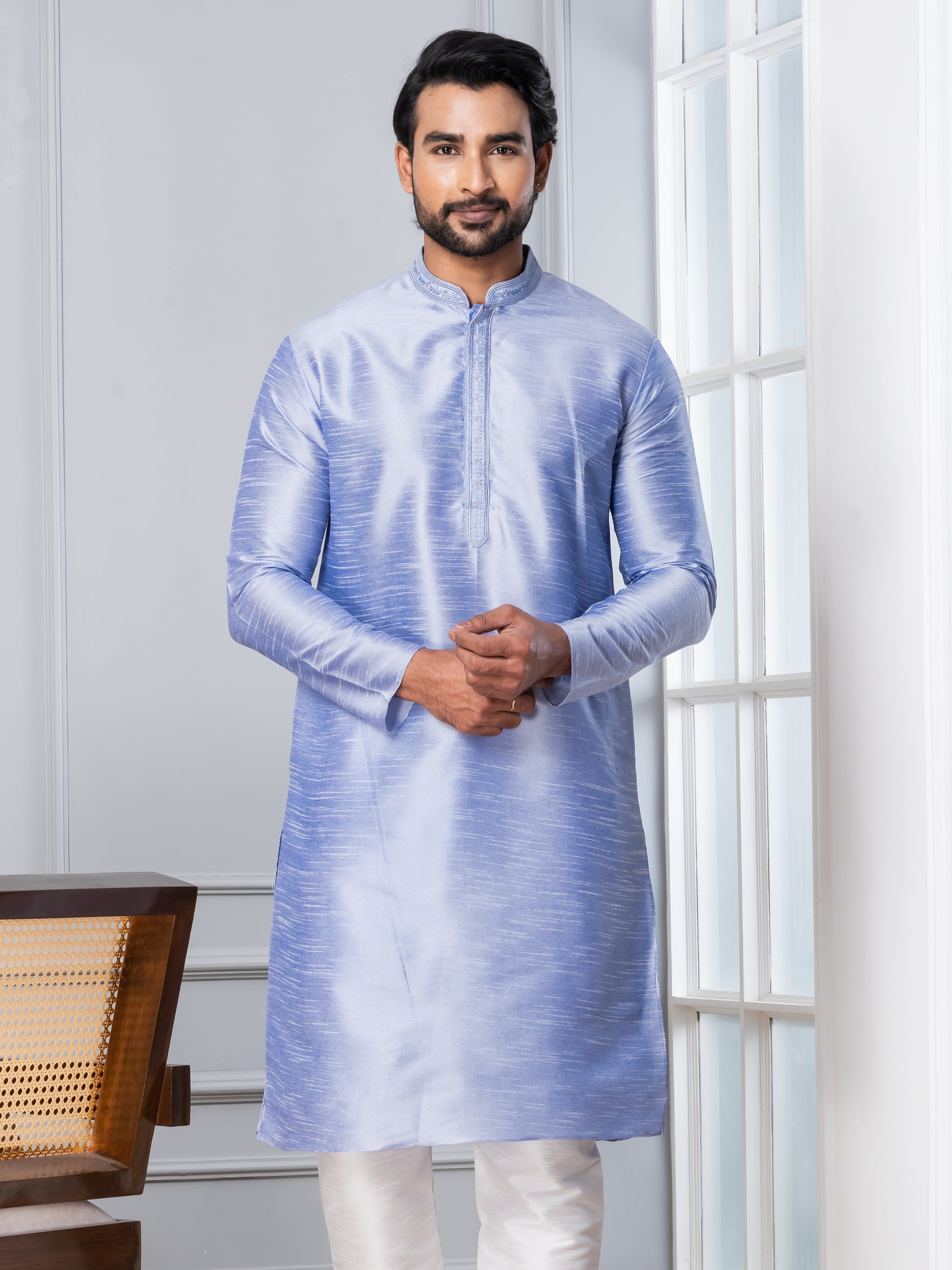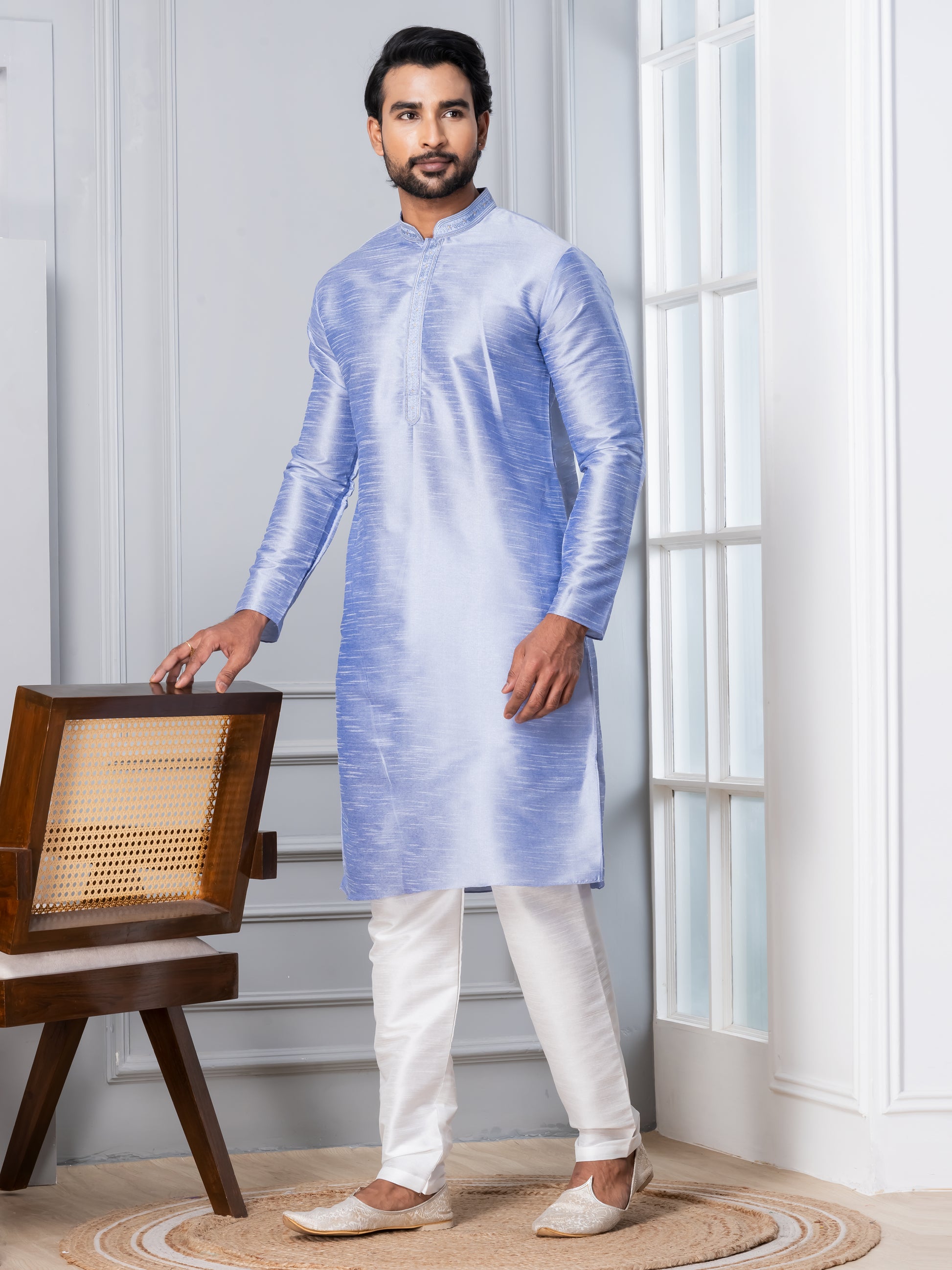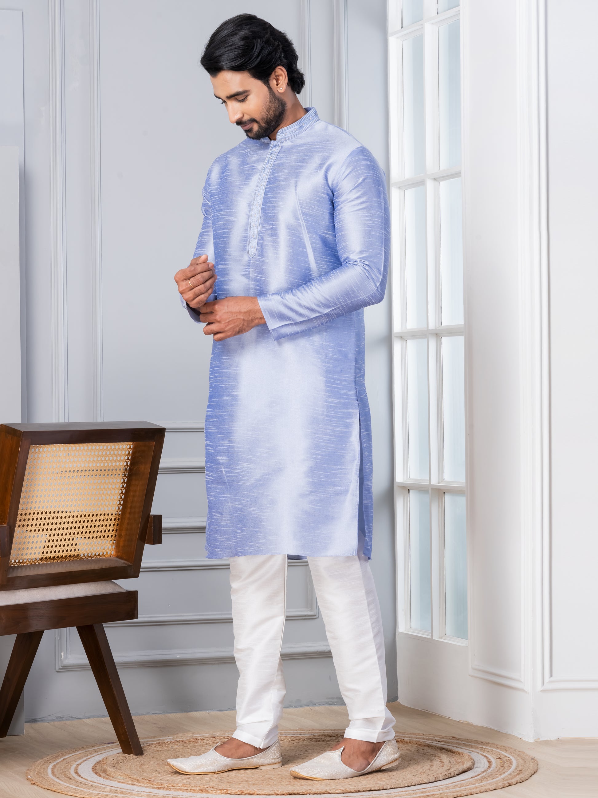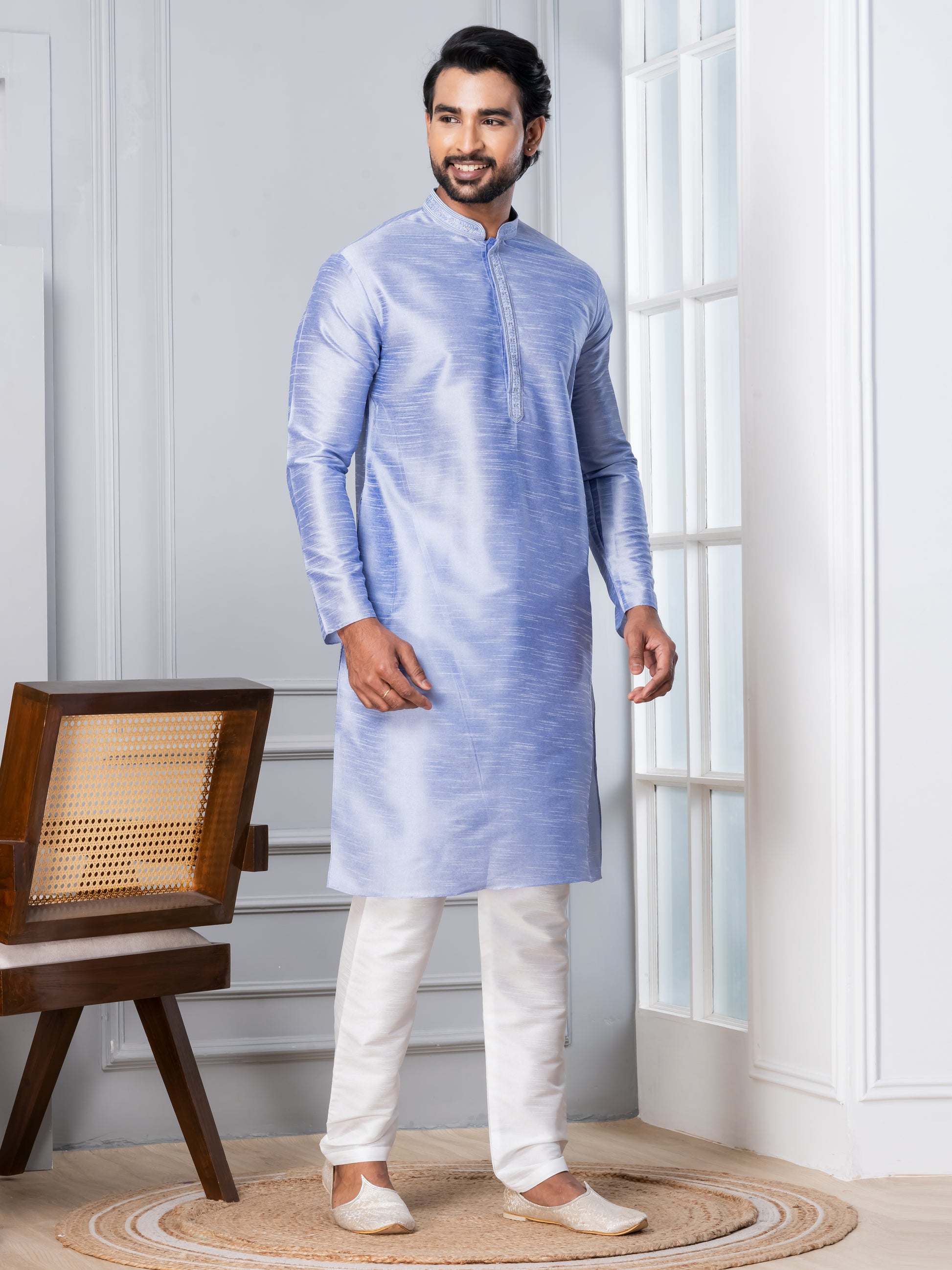 Pair this Lavender kurta with a White churidar or slim-fit trousers for a sophisticated ethnic look. Complete the ensemble with traditional mojris or leather loafers to exude elegance and charm.