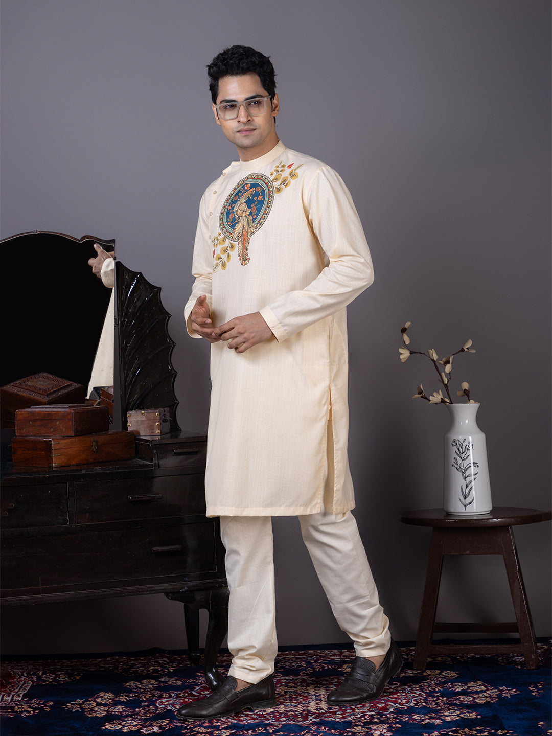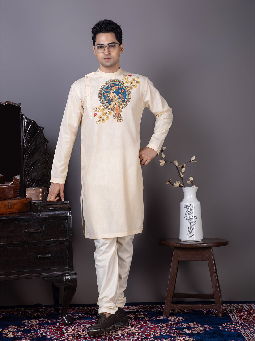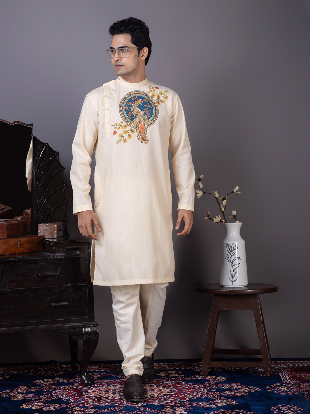 Pair this classic beige kurta with traditional mojaris or embroidered juttis for a royal look. Add a contrasting stole or a statement watch to enhance your festive attire effortlessly.
