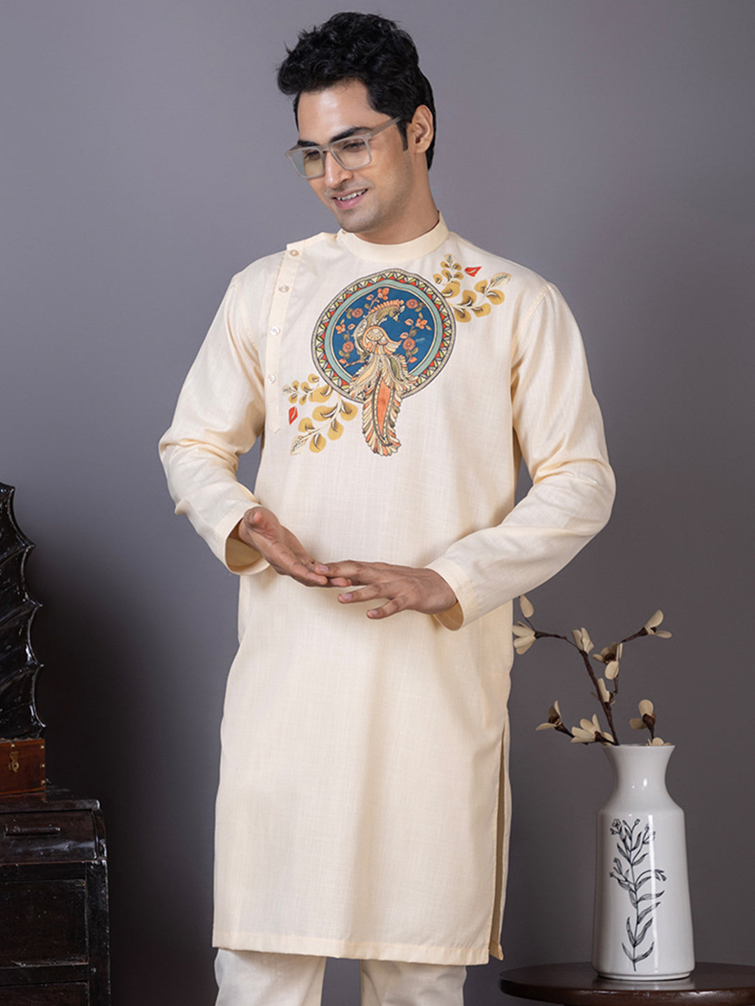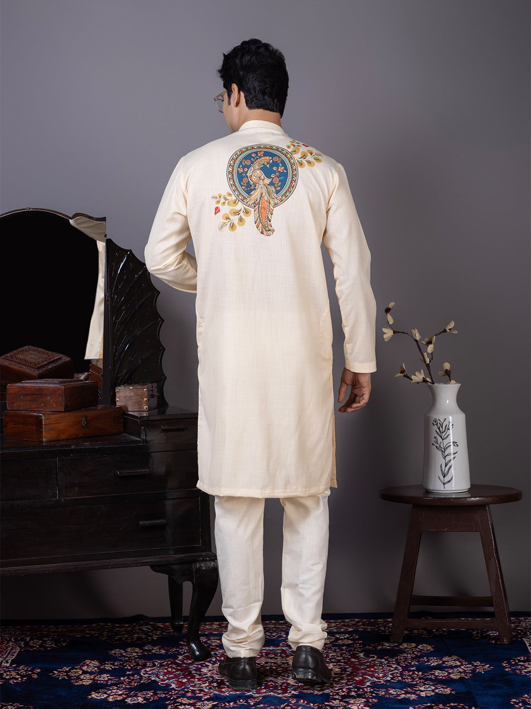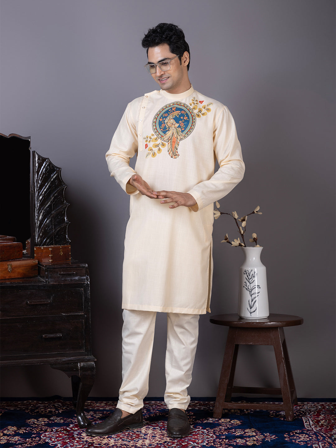 Pair this classic beige kurta with traditional mojaris or embroidered juttis for a royal look. Add a contrasting stole or a statement watch to enhance your festive attire effortlessly.