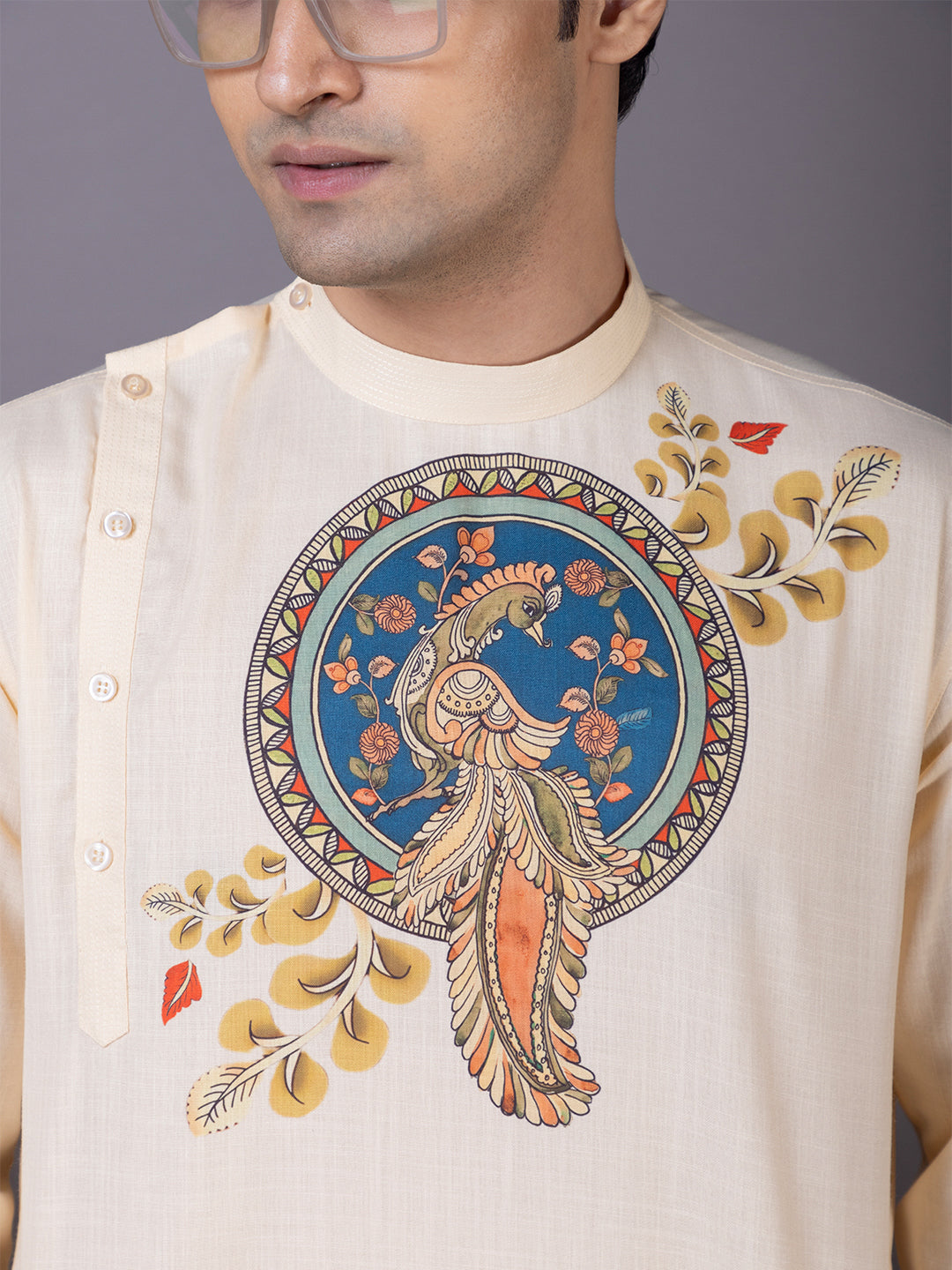Men's Beige Cotton Kurta With Print Pyjama Set