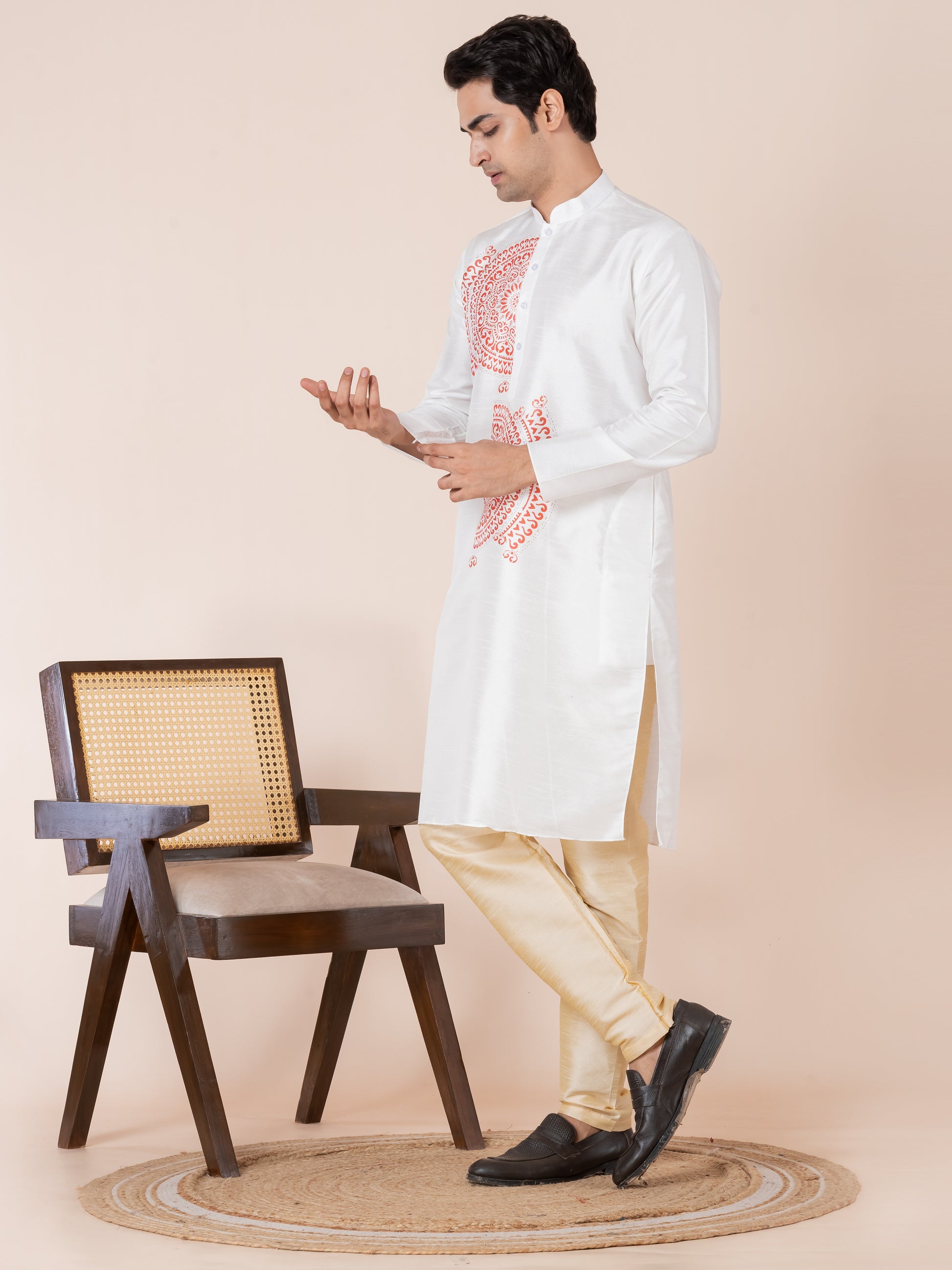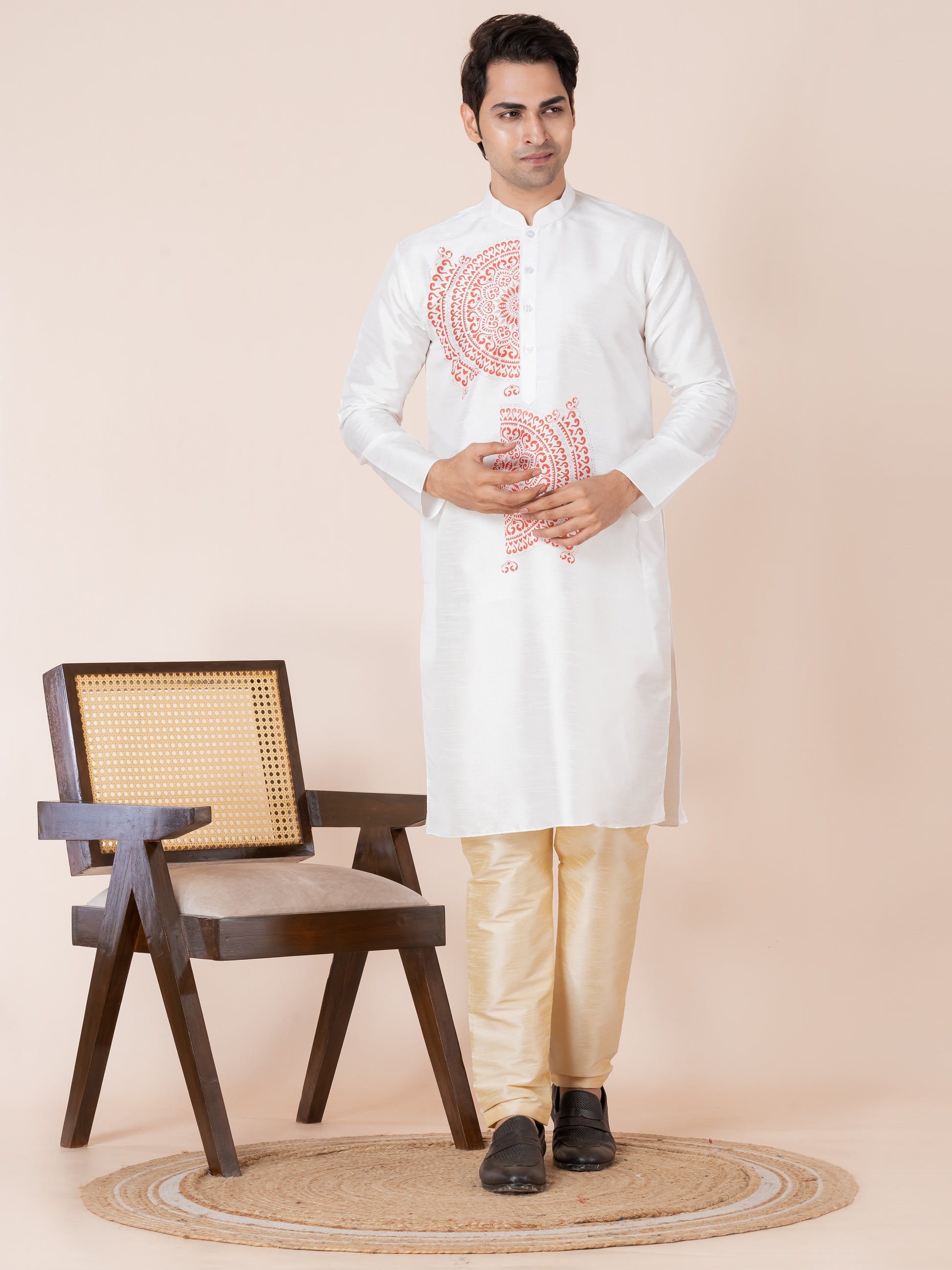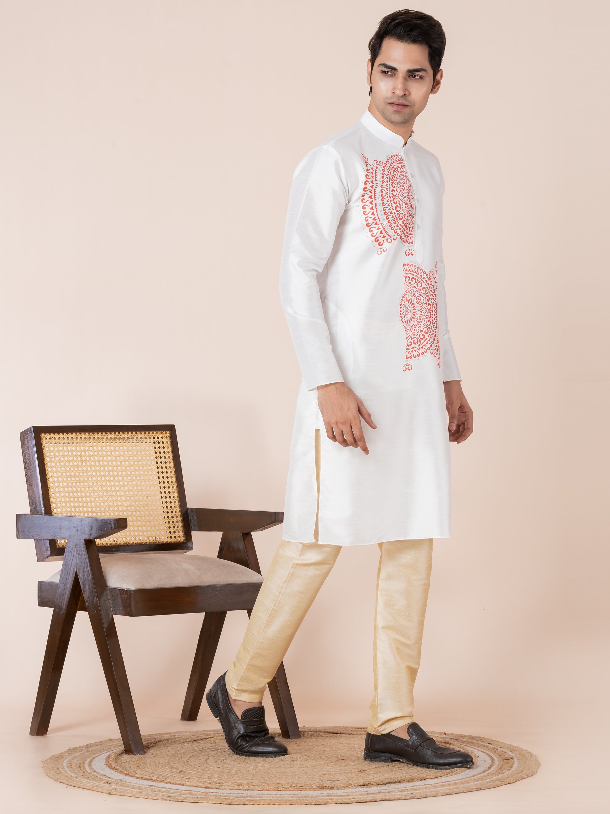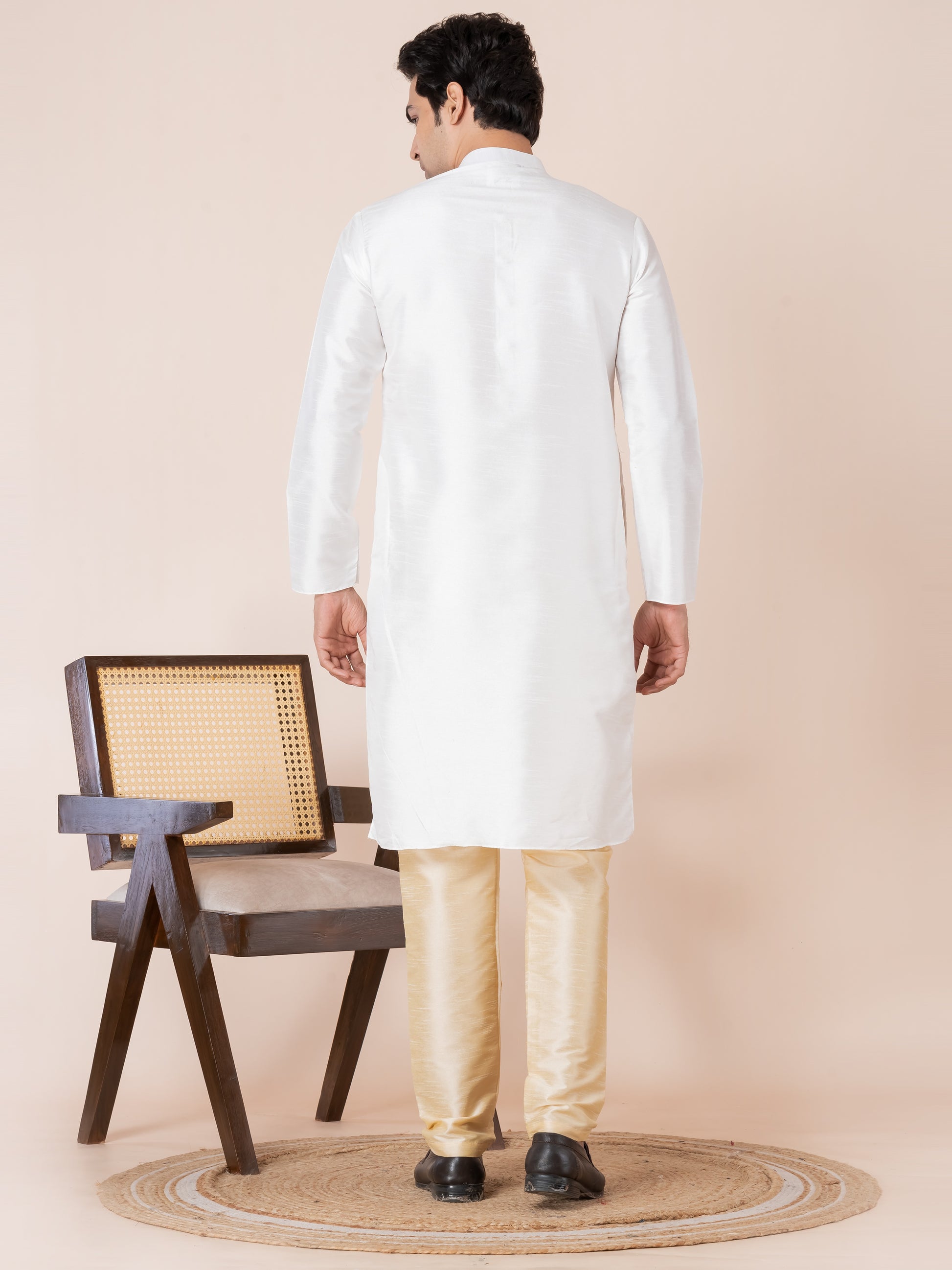 Elevate your ethnic style with this White Dupion Silk Kurta and Beige pyjama set. Crafted from premium fabric, it offers a regal look with a refined finish. Perfect for festive occasions and celebrations.
