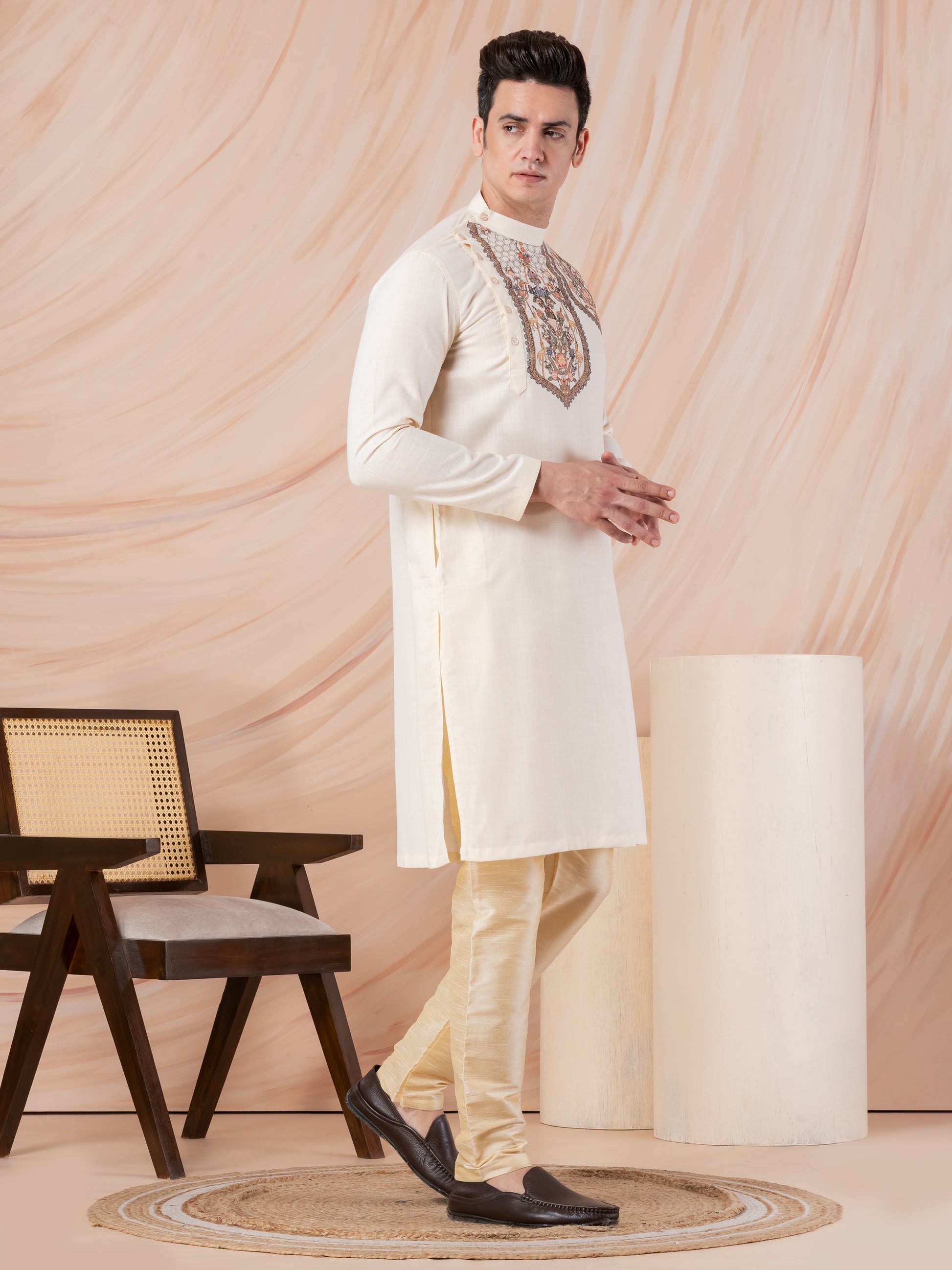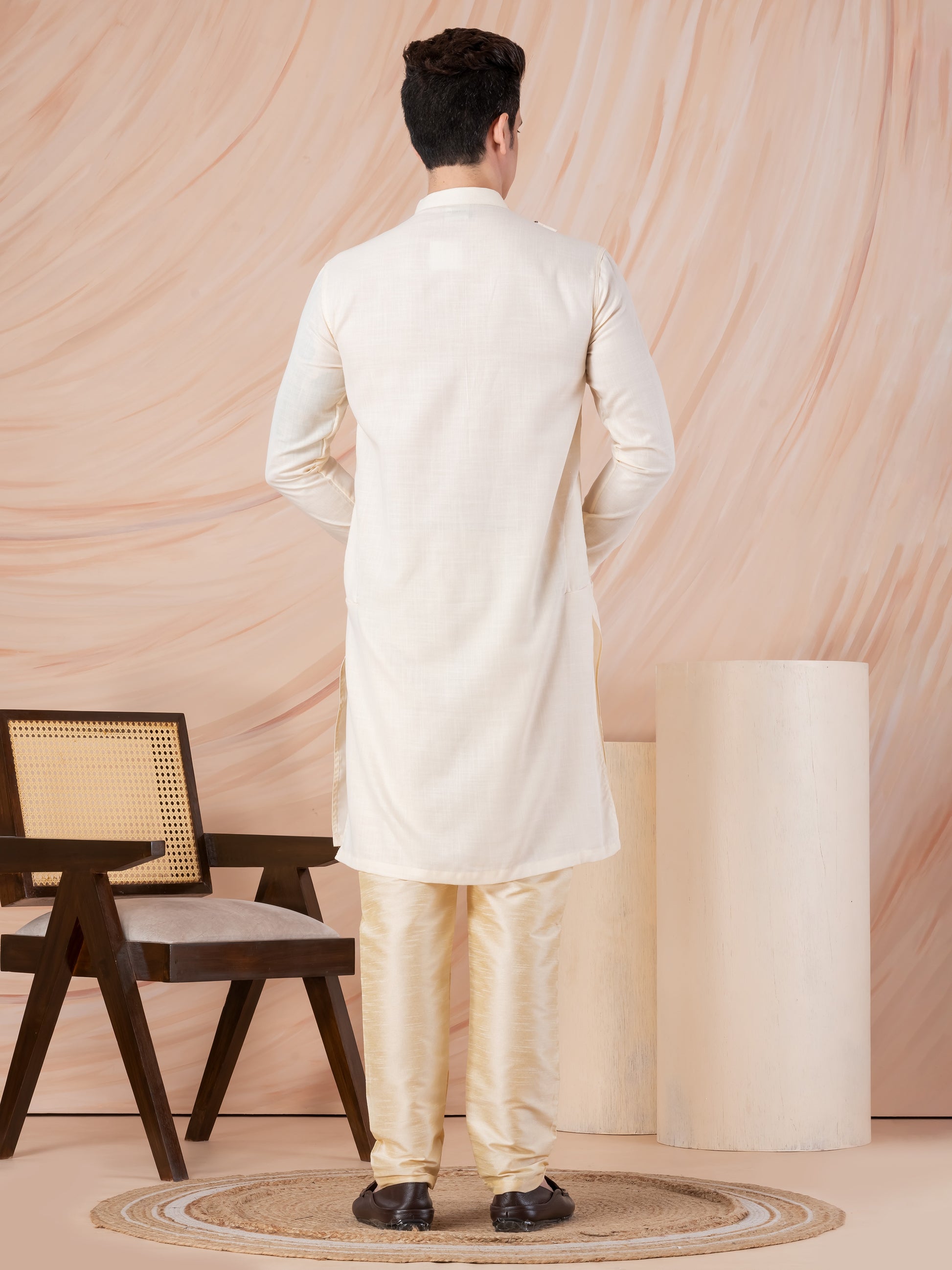 Pair this Beige Cotton Kurta with a contrasting churidar or straight-fit pyjama to achieve a refined ethnic look. Complete the outfit with classic mojaris or leather sandals.