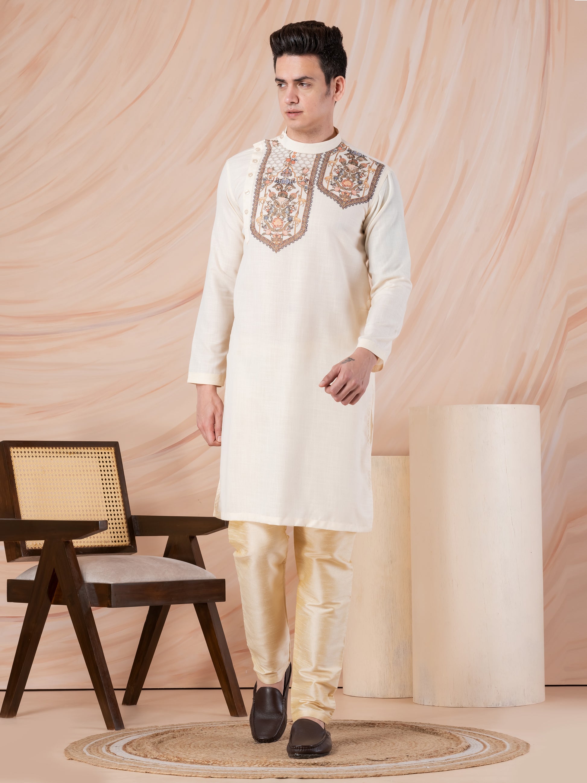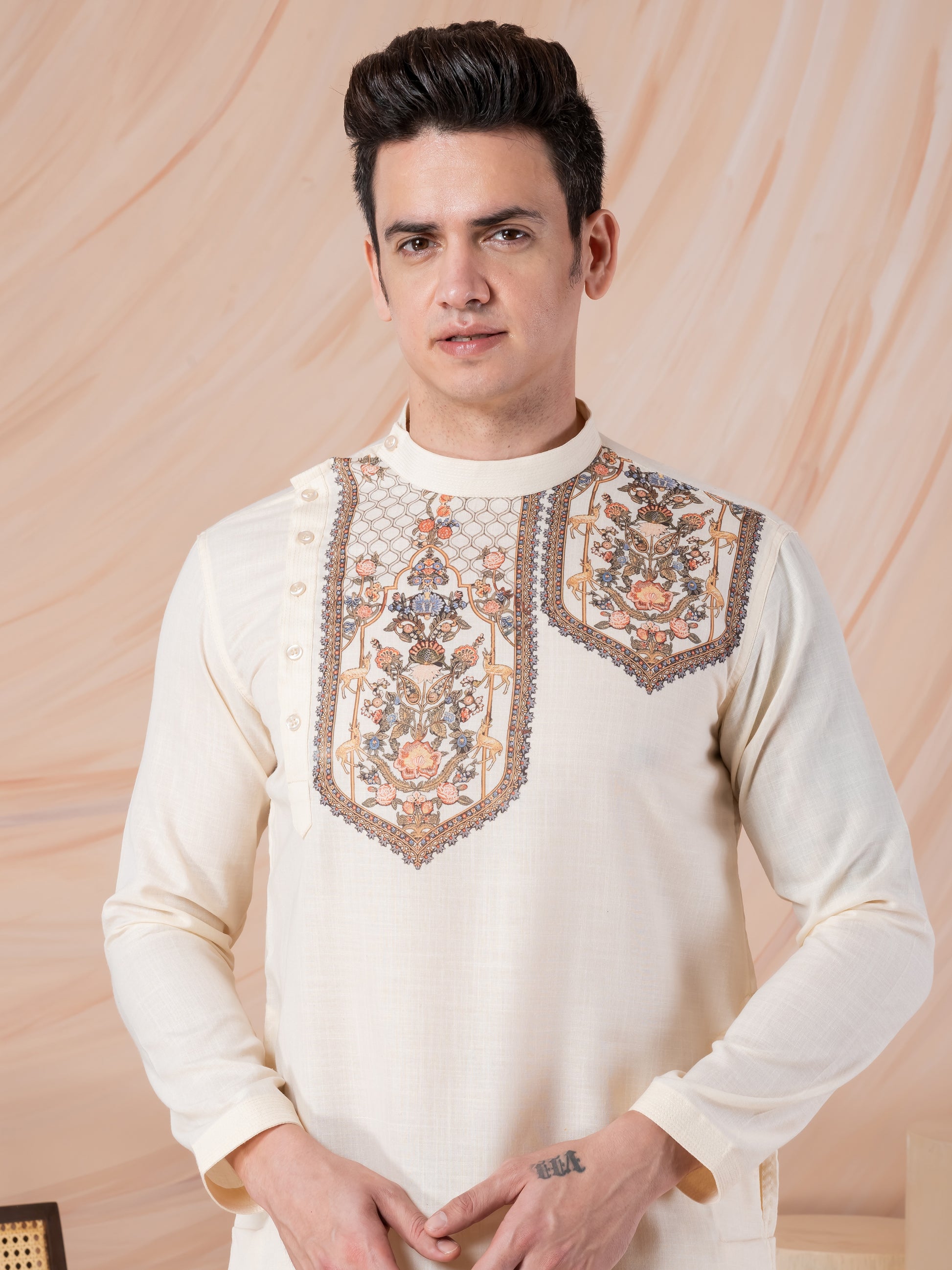 Exude elegance and tradition with this Beige Cotton Kurta With Pyjama Set, featuring an exquisite ethnic motif print that enhances its regal appeal. Designed for comfort and style, this kurta is perfect for festive occasions, weddings, and cultural celebrations.