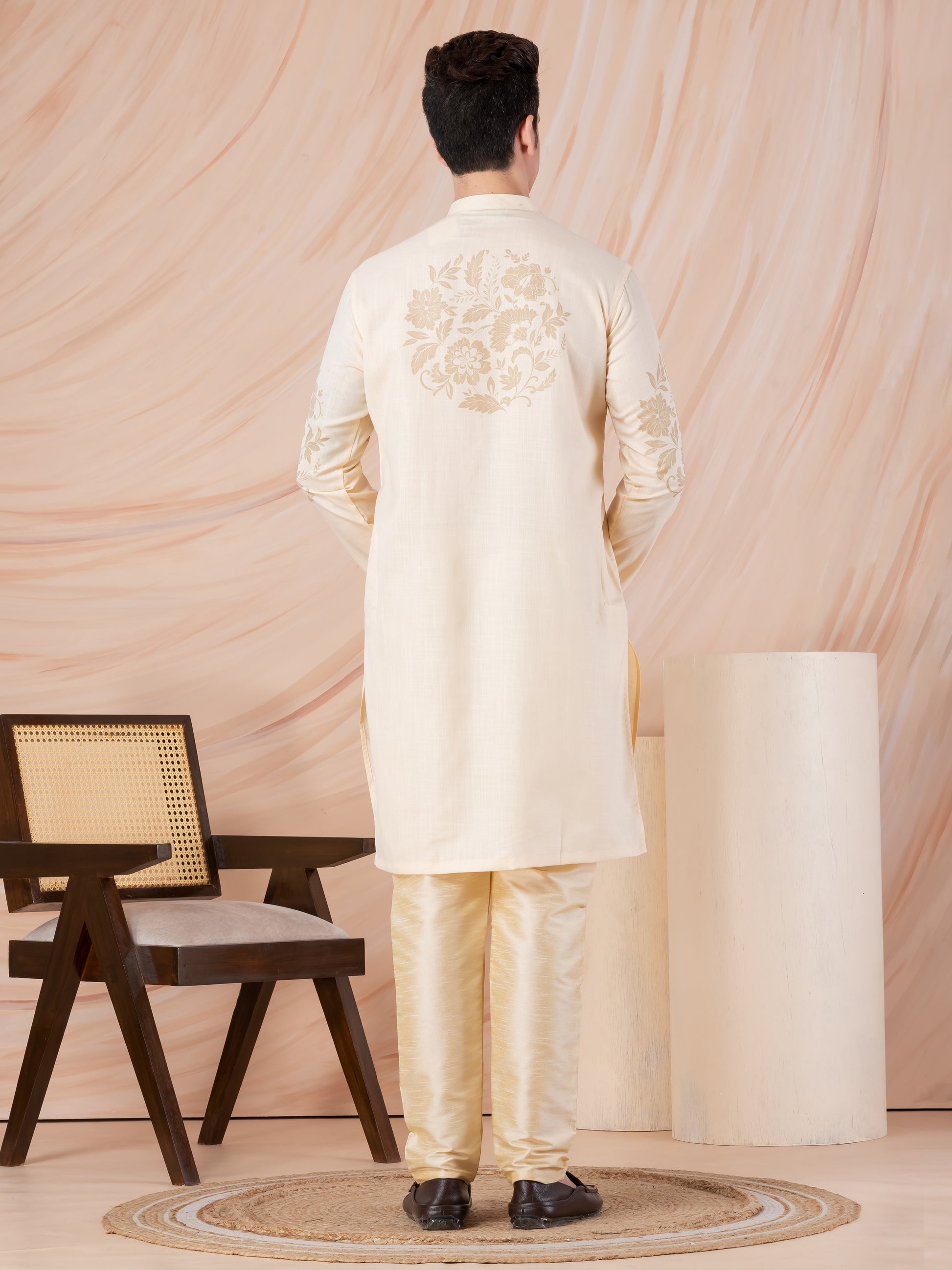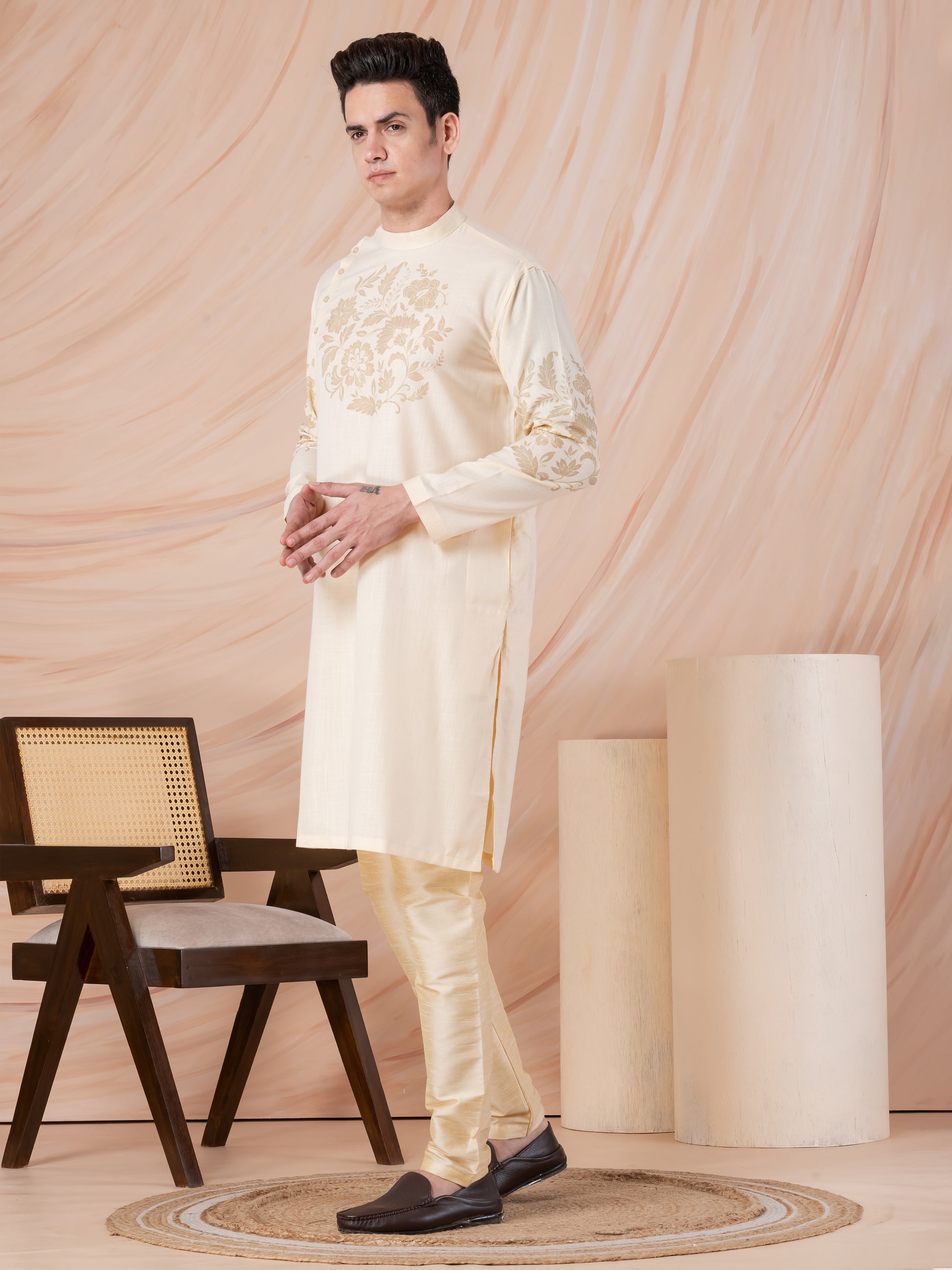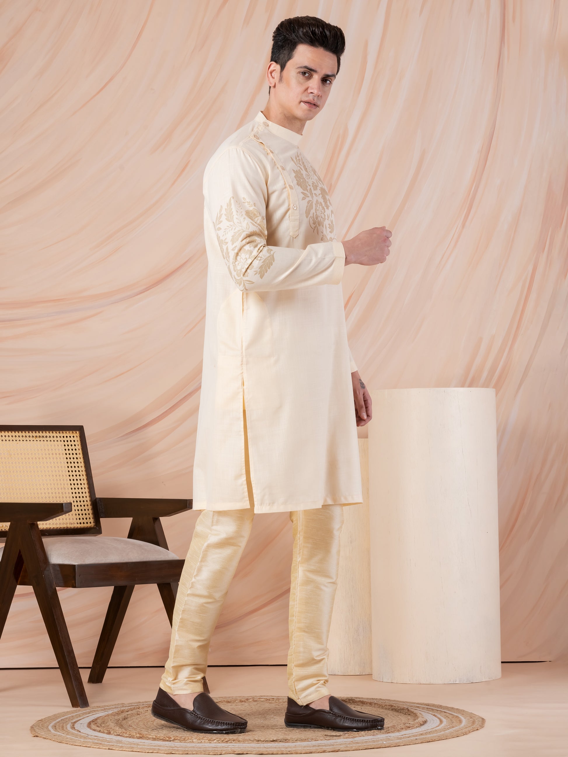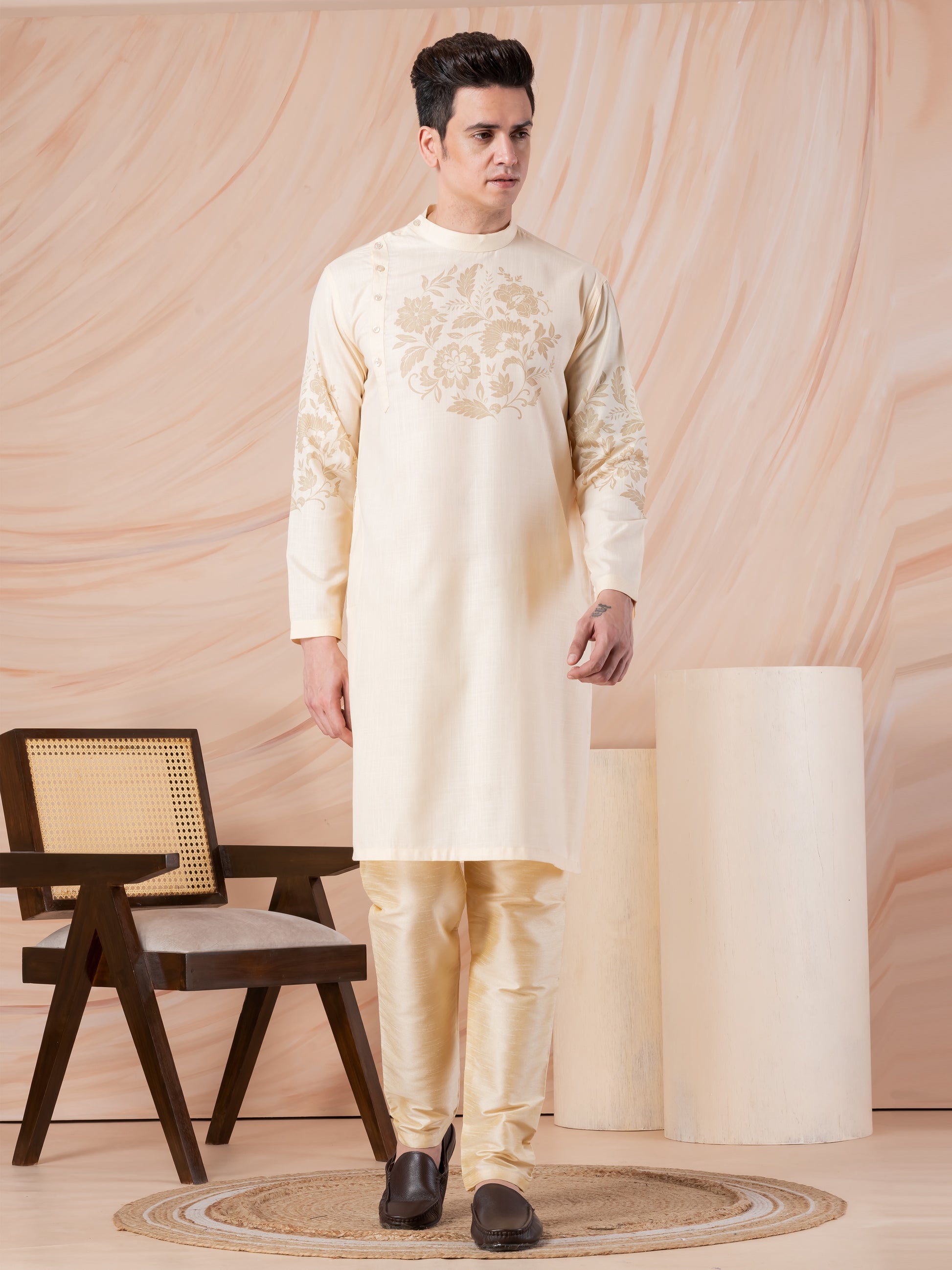 Exude elegance and tradition with this Beige Cotton Kurta With Pyjama Set, featuring an exquisite ethnic motif print that enhances its regal appeal. Designed for comfort and style, this kurta is perfect for festive occasions, weddings, and cultural celebrations.