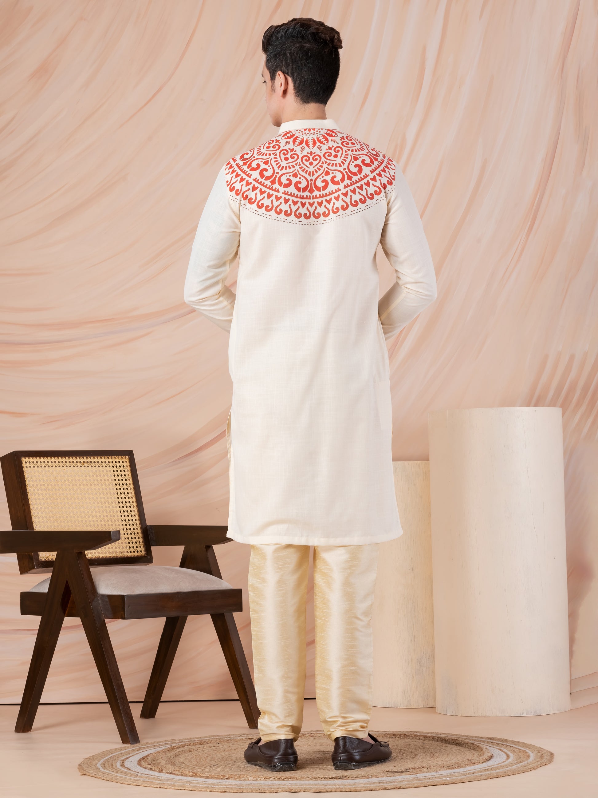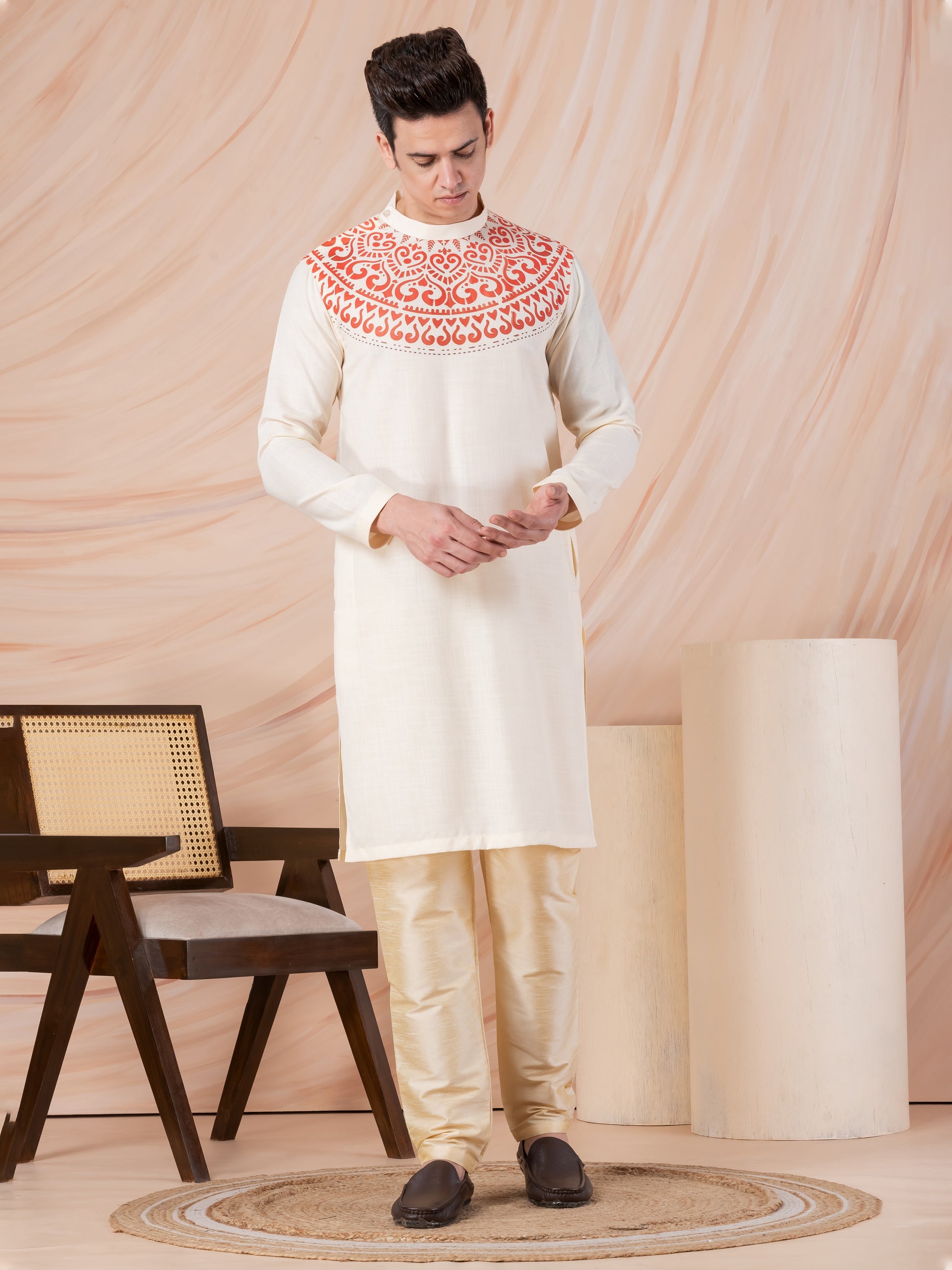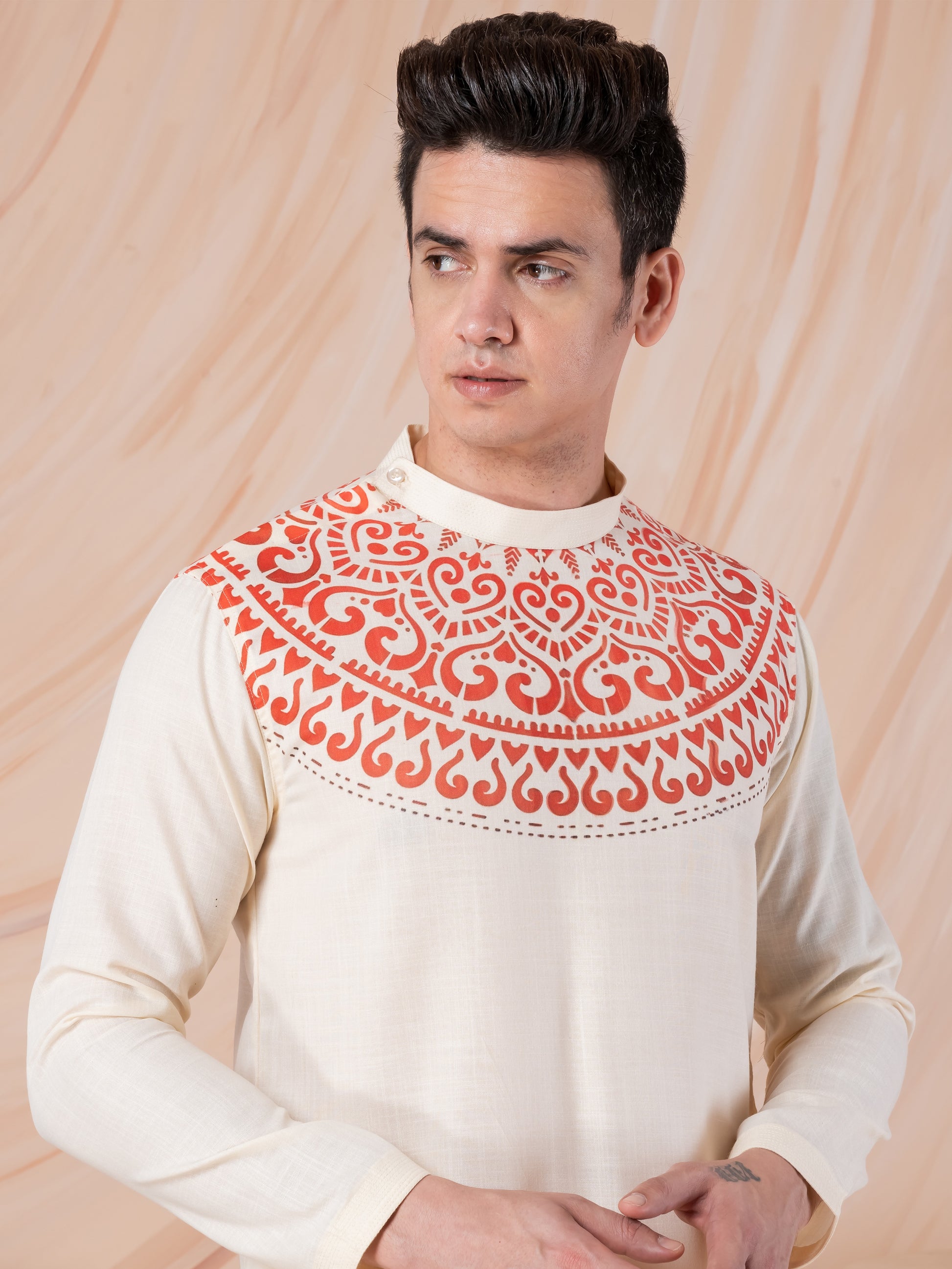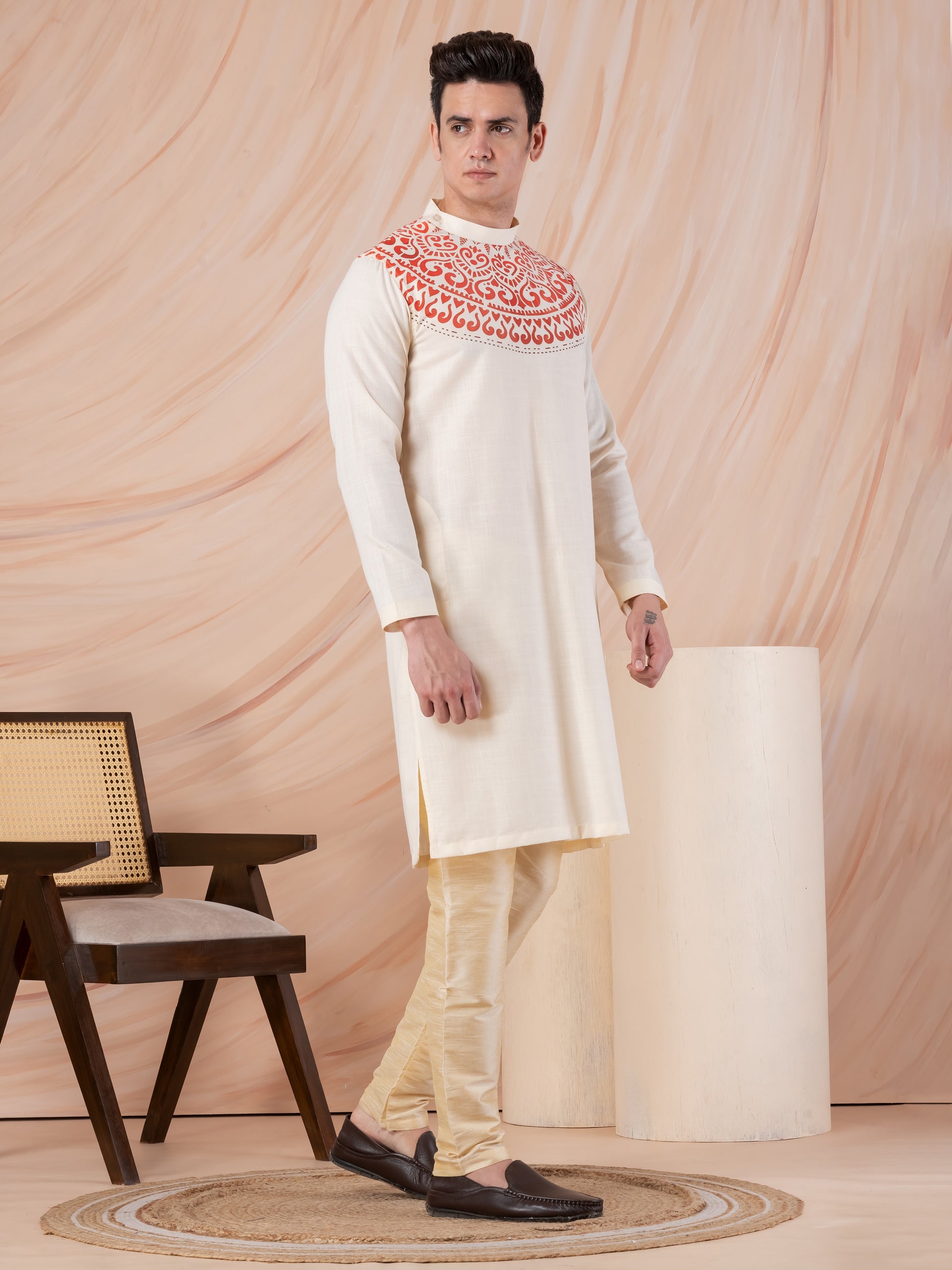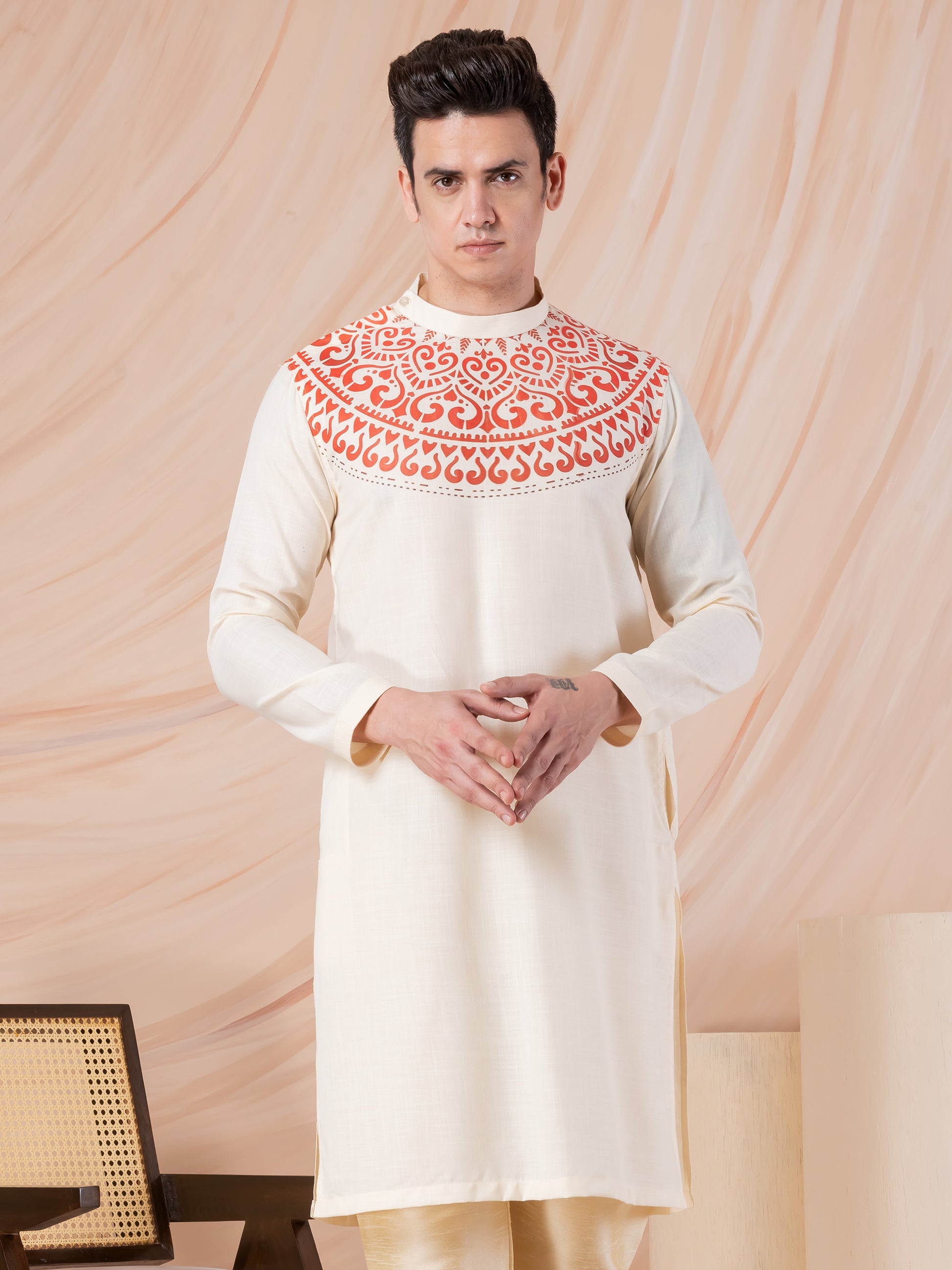 Exude elegance and tradition with this Beige Cotton Kurta With Pyjama Set, featuring an exquisite ethnic motif print that enhances its regal appeal. Designed for comfort and style, this kurta is perfect for festive occasions, weddings, and cultural celebrations.