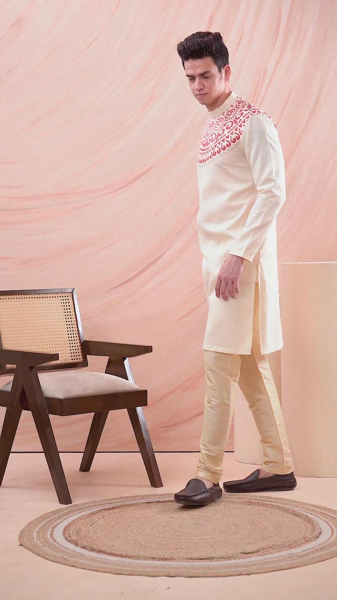 Pair this Beige Cotton Kurta with a contrasting churidar or straight-fit pyjama to achieve a refined ethnic look. Complete the outfit with classic mojaris or leather sandals.