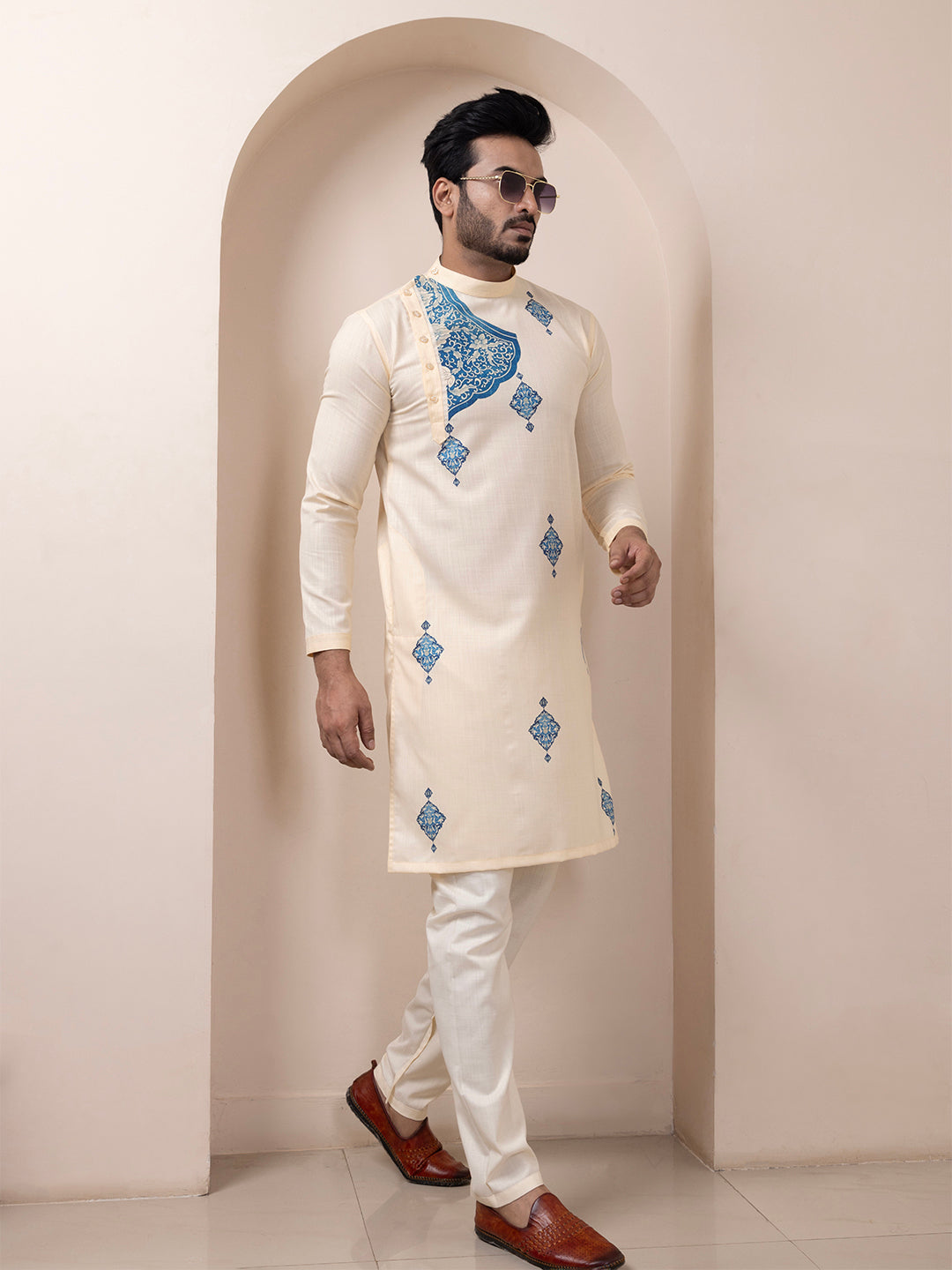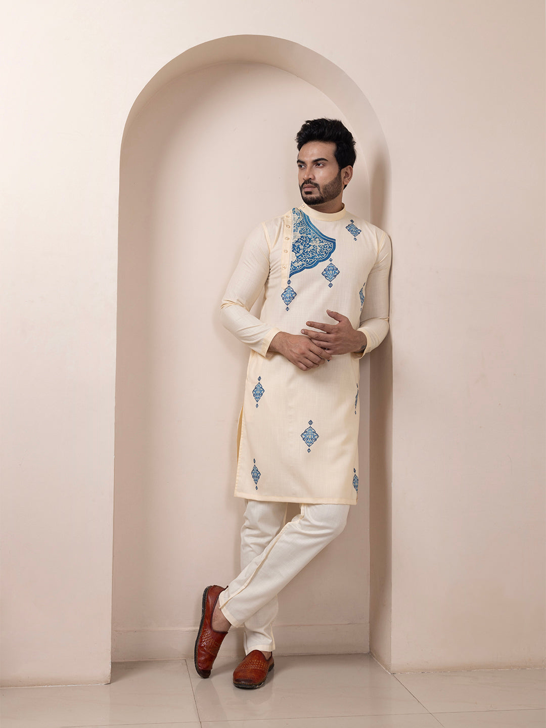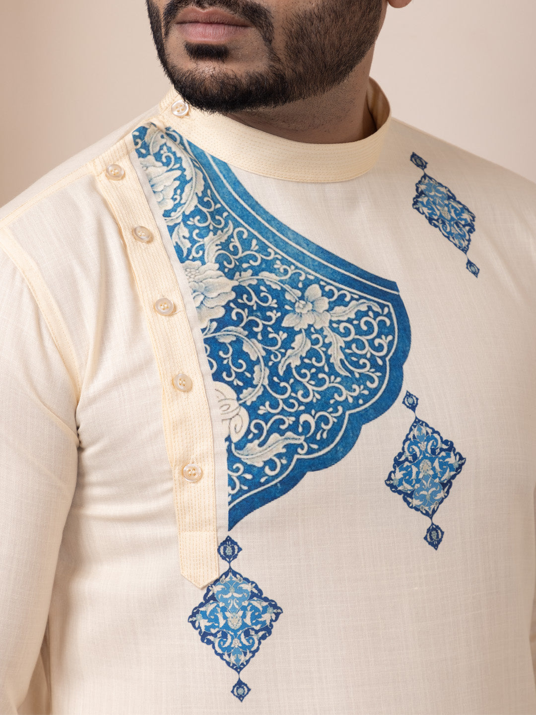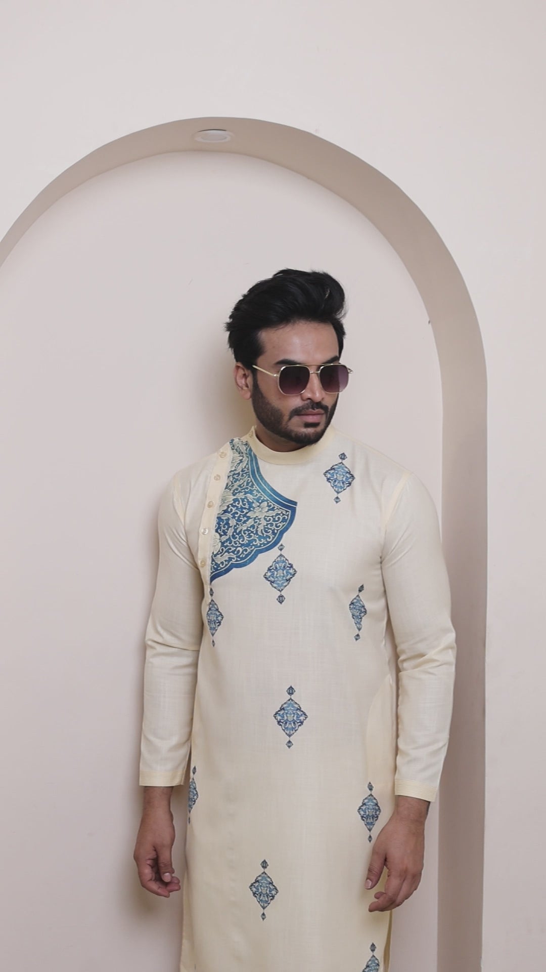 Exude elegance and tradition with this Beige Cotton Kurta With Pyjama Set, featuring an exquisite ethnic motif print that enhances its regal appeal. Designed for comfort and style, this kurta is perfect for festive occasions, weddings, and cultural celebrations.