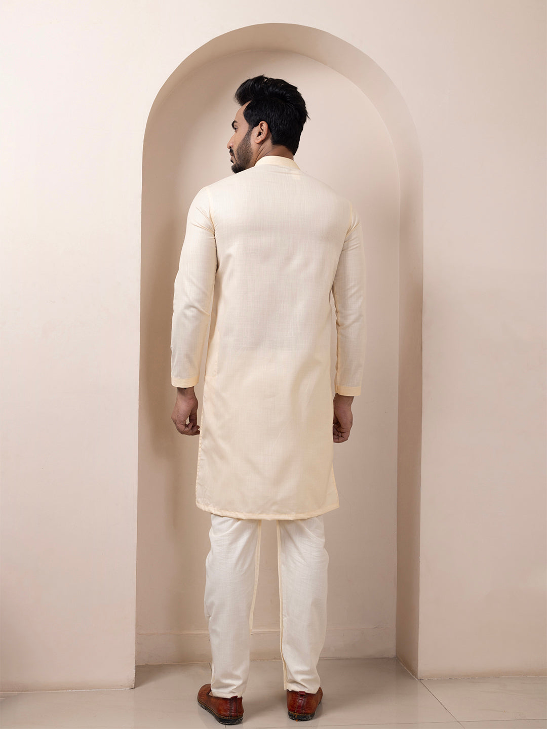 Pair this Beige Cotton Kurta with a contrasting churidar or straight-fit pyjama to achieve a refined ethnic look. Complete the outfit with classic mojaris or leather sandals.