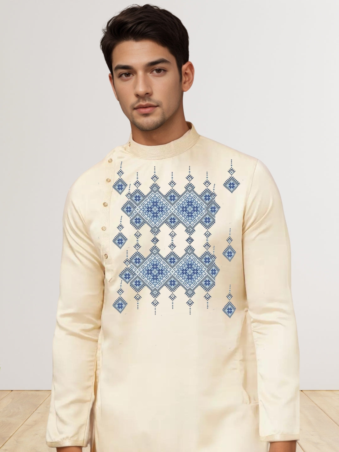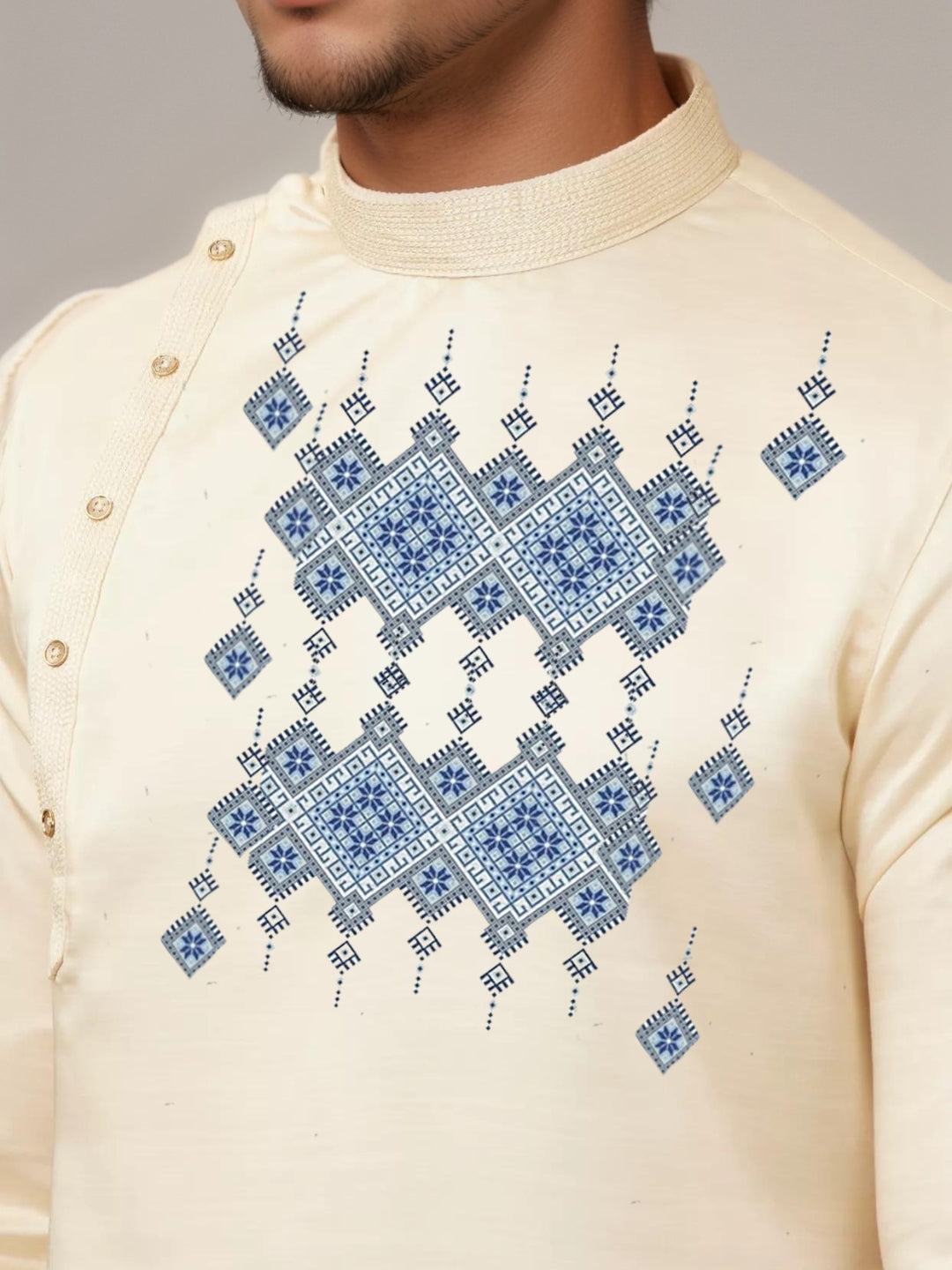 Exude elegance and tradition with this Beige Cotton Kurta With Pyjama Set, featuring an exquisite ethnic motif print that enhances its regal appeal. Designed for comfort and style, this kurta is perfect for festive occasions, weddings, and cultural celebrations.