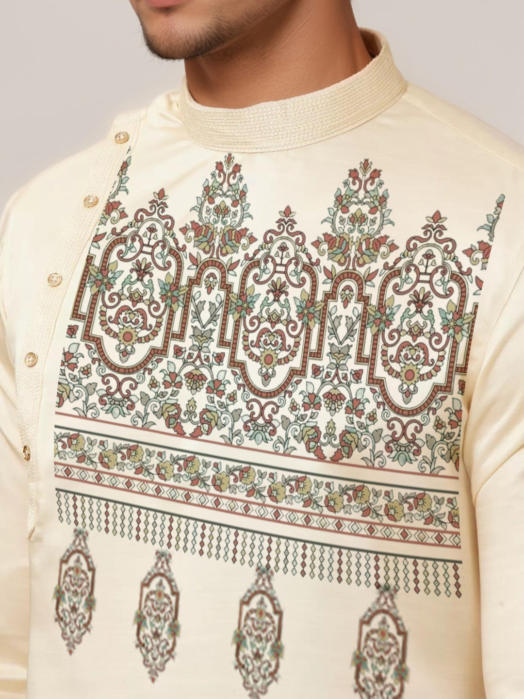 Mens Beige Side Placket Printed Kurta With Pyjama Set