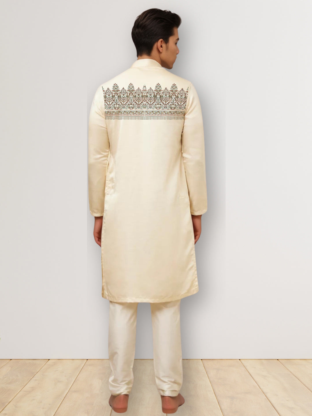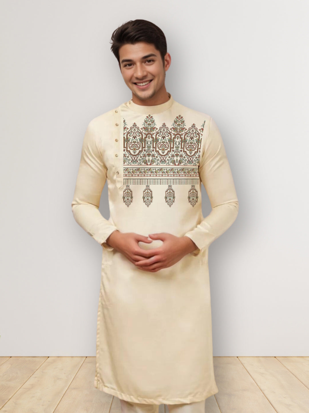 Exude elegance and tradition with this Beige Cotton Kurta With Pyjama Set, featuring an exquisite ethnic motif print that enhances its regal appeal. Designed for comfort and style, this kurta is perfect for festive occasions, weddings, and cultural celebrations.
