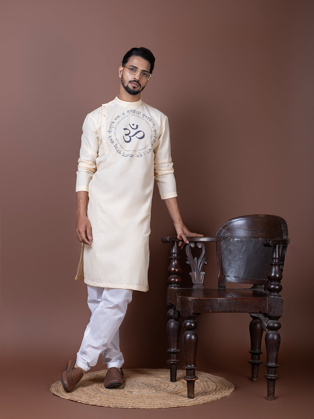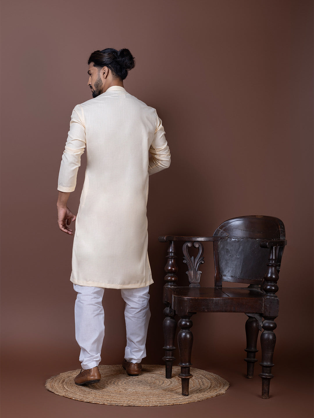 Pair this Beige Cotton Kurta with a contrasting churidar or straight-fit pyjama to achieve a refined ethnic look. Complete the outfit with classic mojaris or leather sandals.