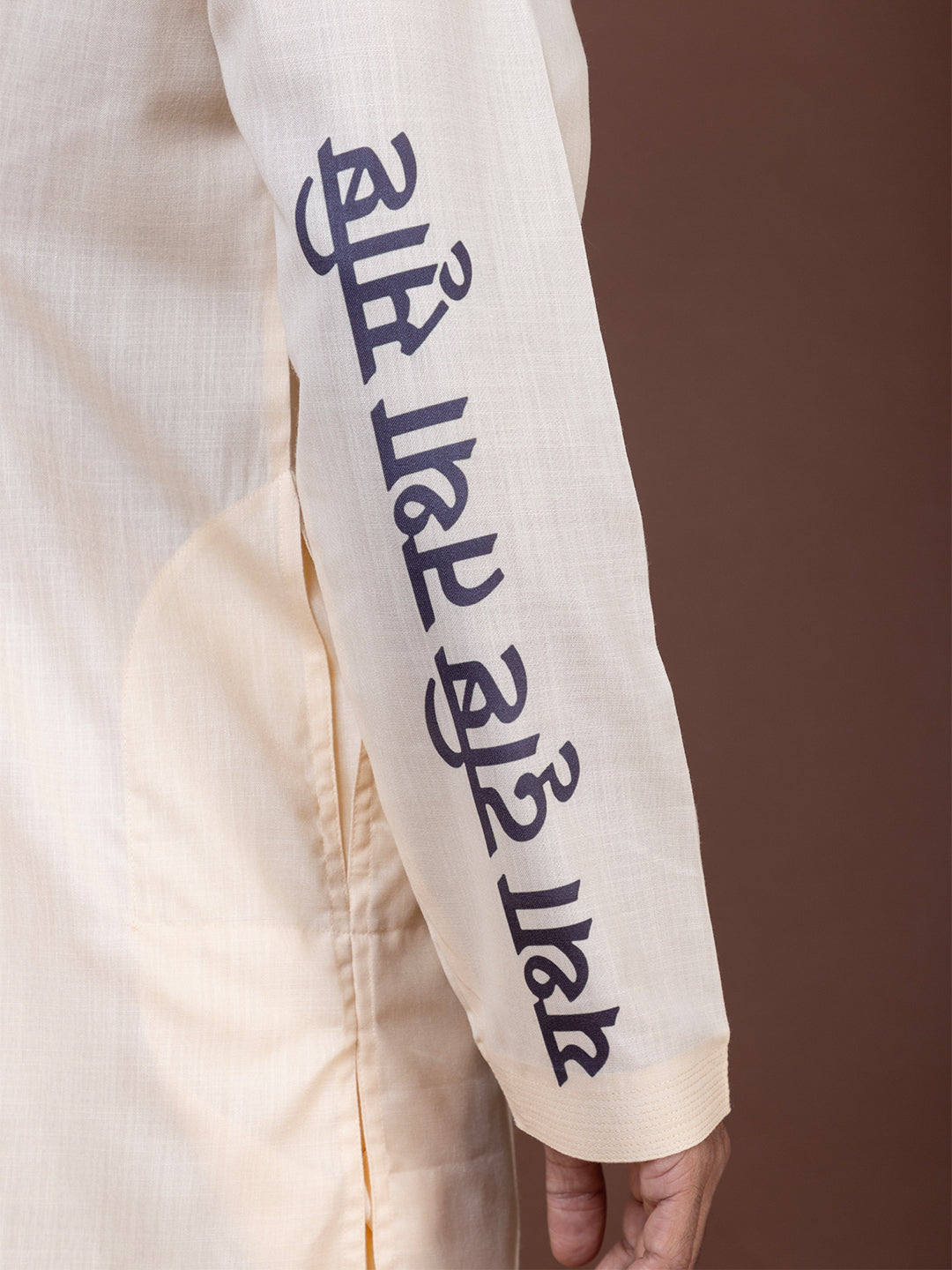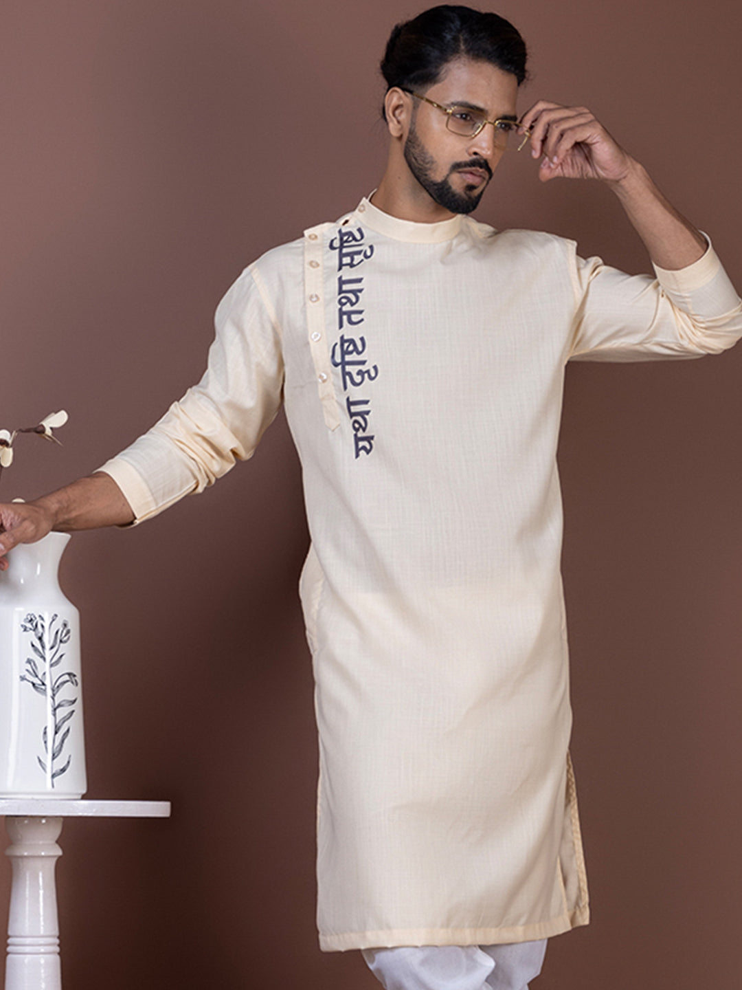 Pair this Beige Cotton Kurta with a contrasting churidar or straight-fit pyjama to achieve a refined ethnic look. Complete the outfit with classic mojaris or leather sandals.
