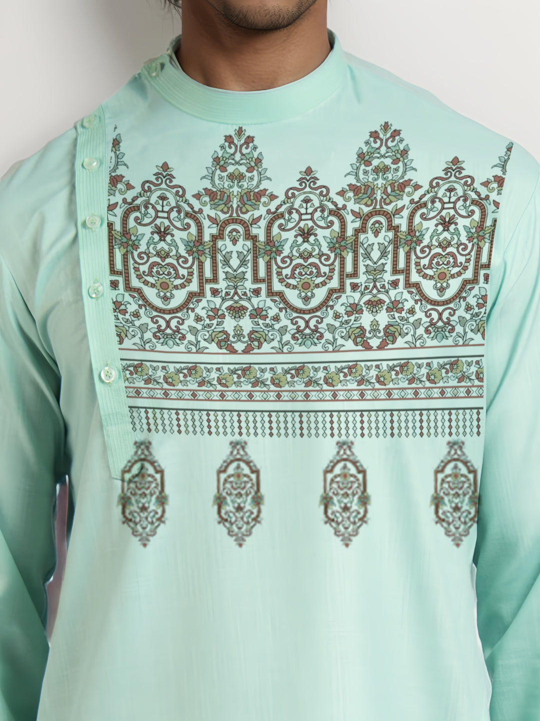 Mens Green Side Placket Printed Kurta With Pyjama Set