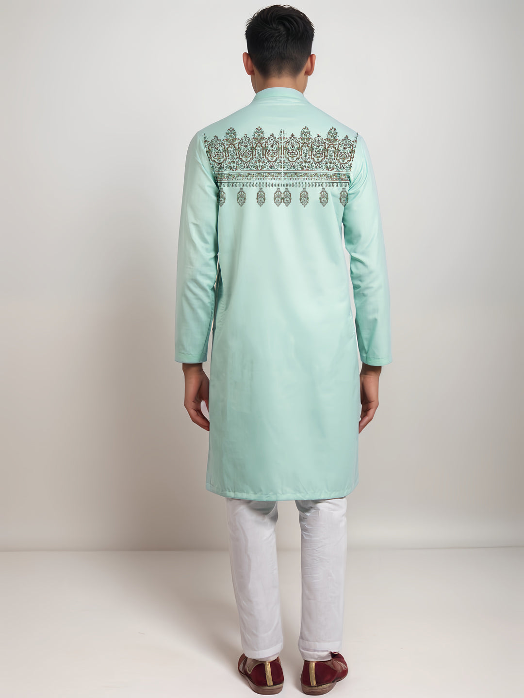 Pair this Green Cotton Kurta with a contrasting churidar or straight-fit pyjama to achieve a refined ethnic look. Complete the outfit with classic mojaris or leather sandals.