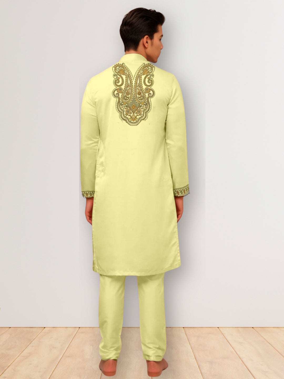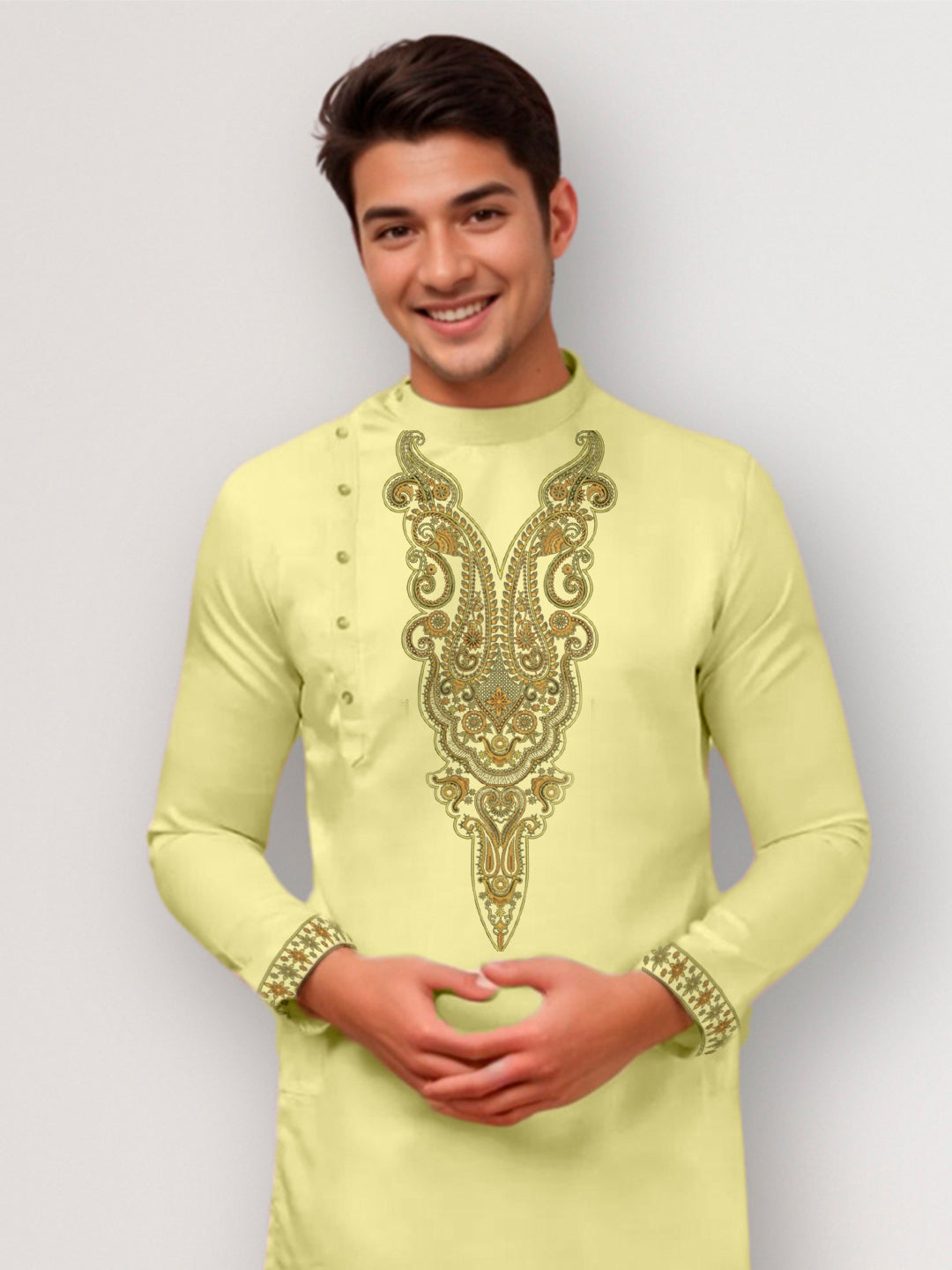 Elevate your ethnic style with this lime green cotton kurta-pyjama set. Designed for comfort and elegance, it's perfect for festive occasions, weddings, and cultural celebrations.