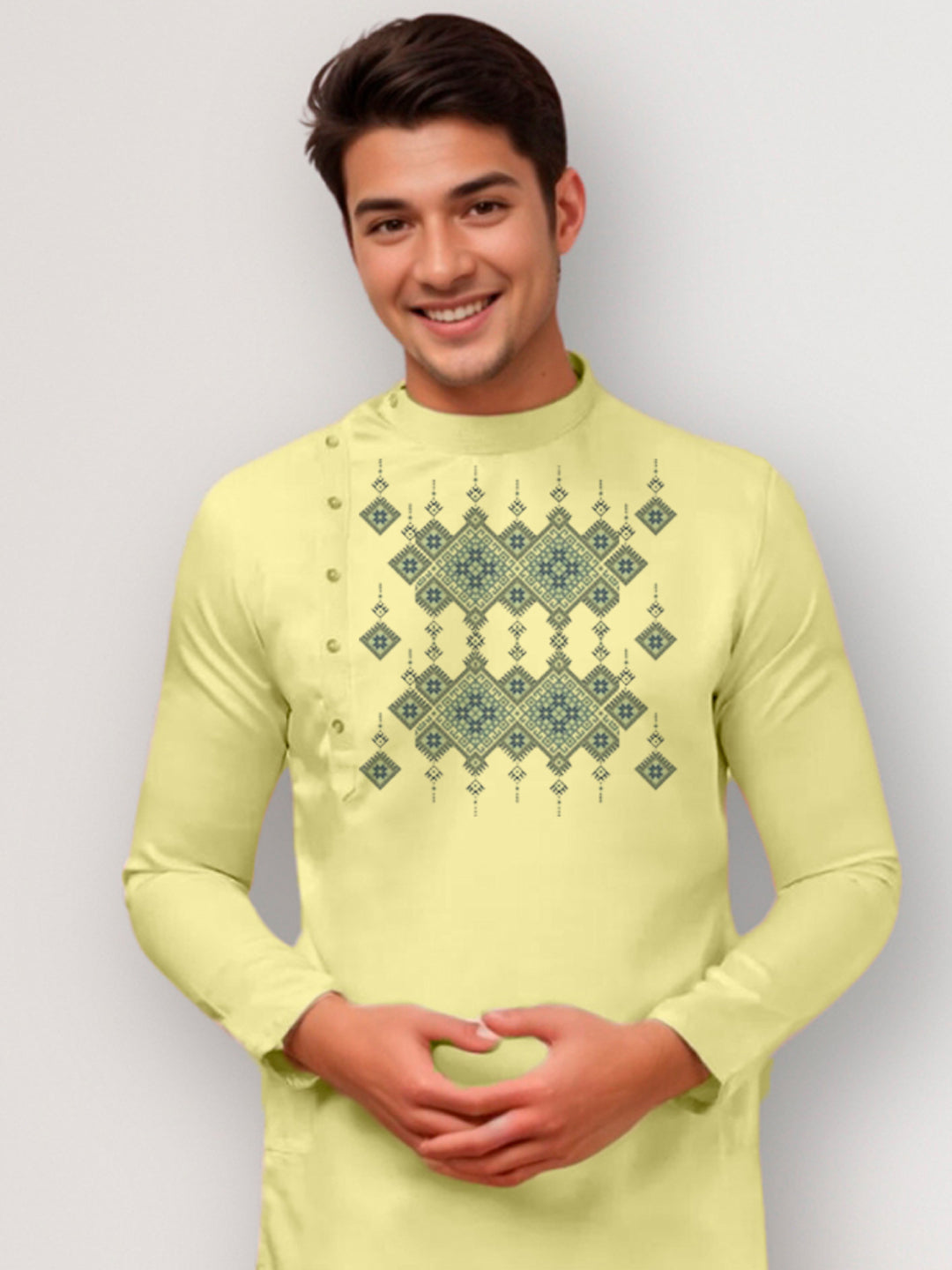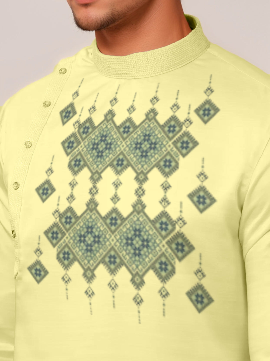 Mens Lime Green Side Placket Printed Kurta Wite Pyjama Set