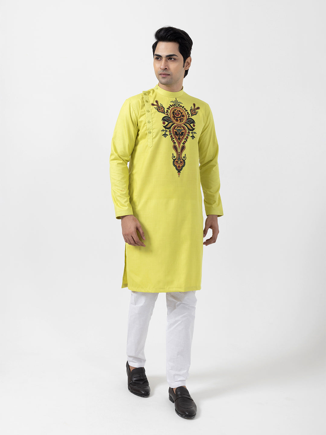 Pair this lime green kurta-pyjama set with classic mojaris or ethnic sandals for a traditional look. Add a contrasting dupatta or embroidered Nehru jacket to enhance your festive charm.