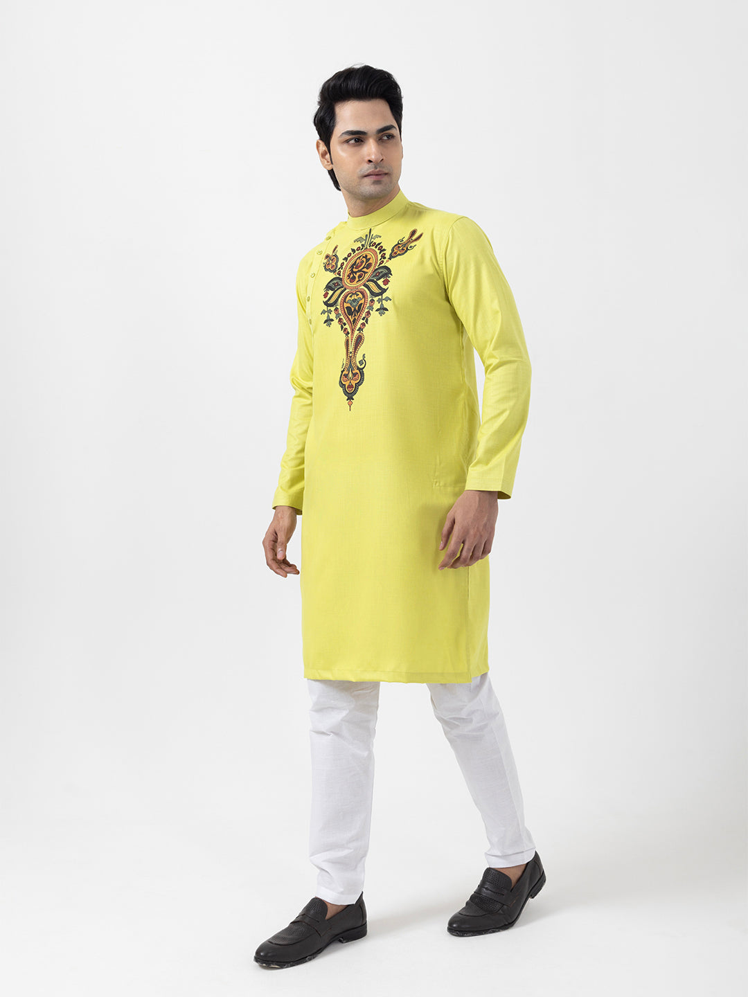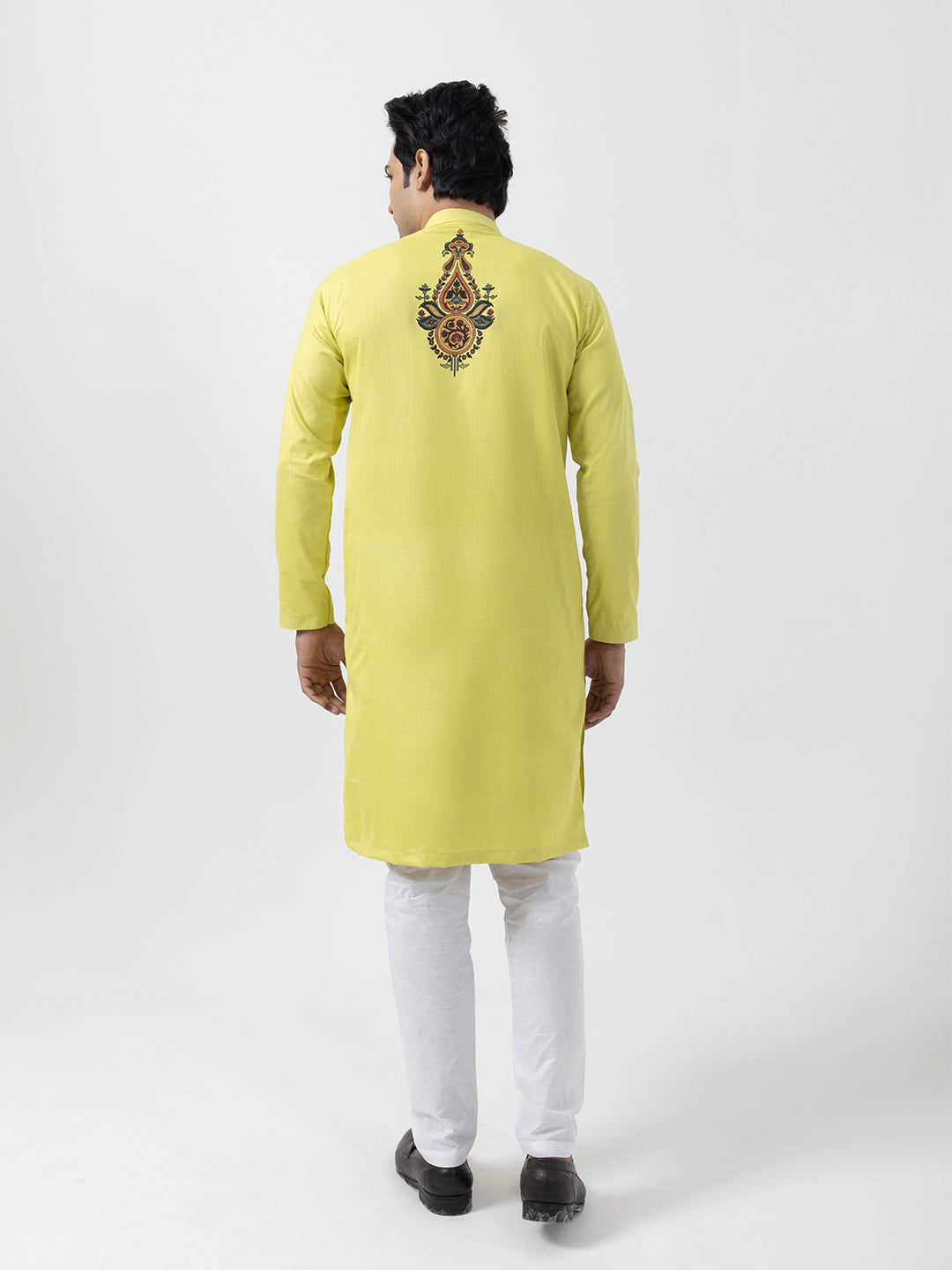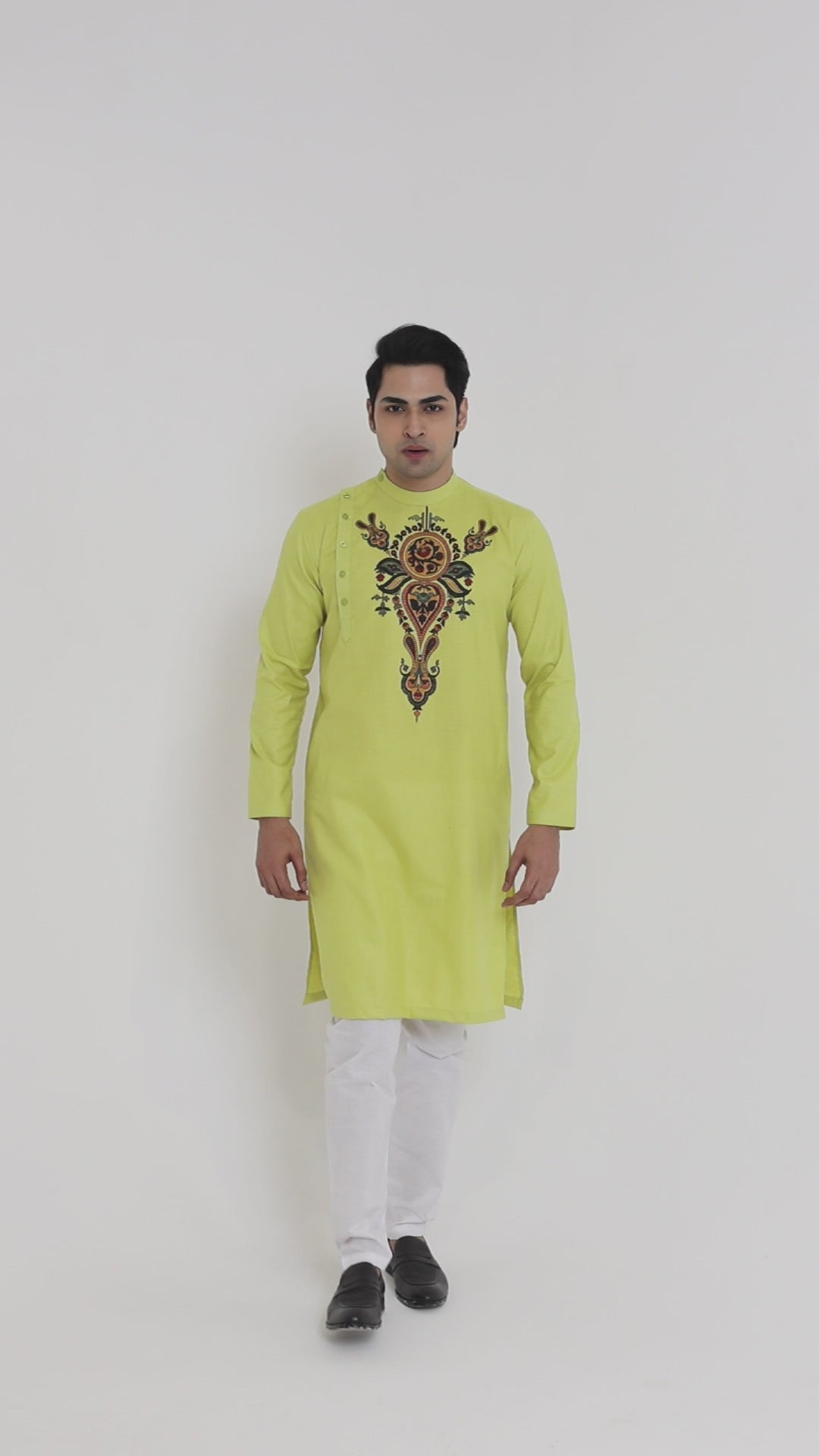Elevate your ethnic style with this lime green cotton kurta-pyjama set. Designed for comfort and elegance, it's perfect for festive occasions, weddings, and cultural celebrations.