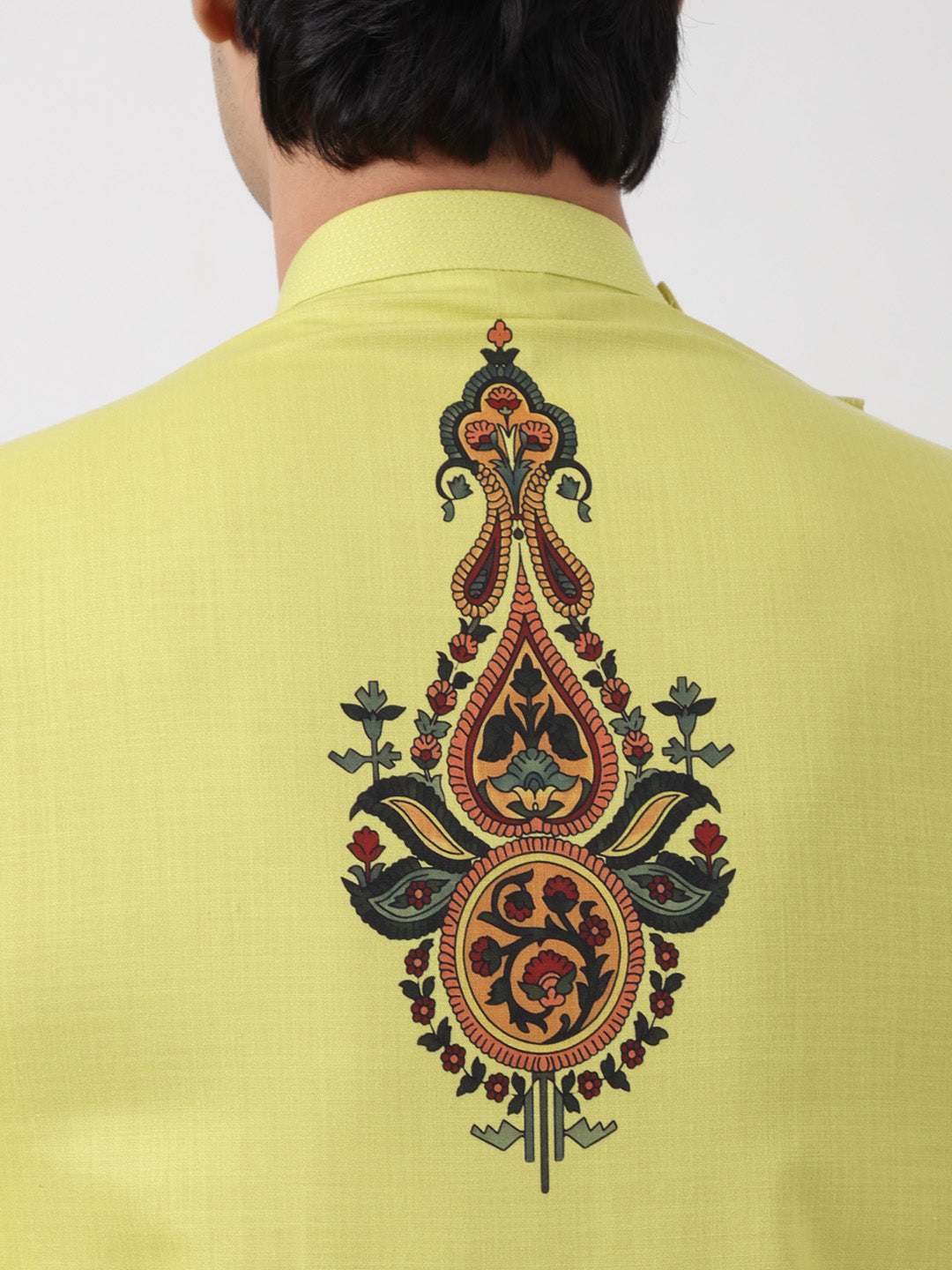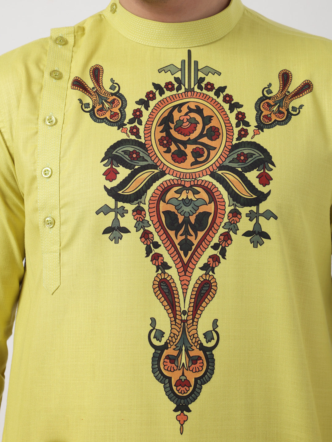 Mens Lime Green Side Placket Printed Kurta Wite Pyjama Set