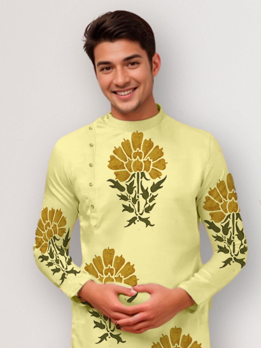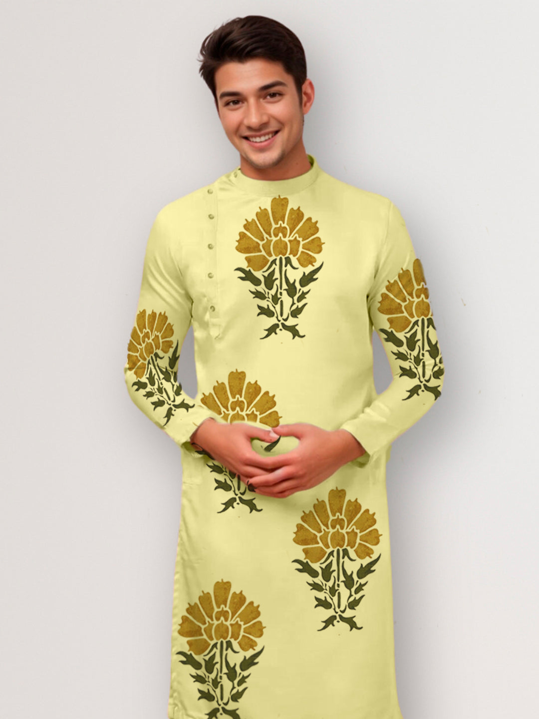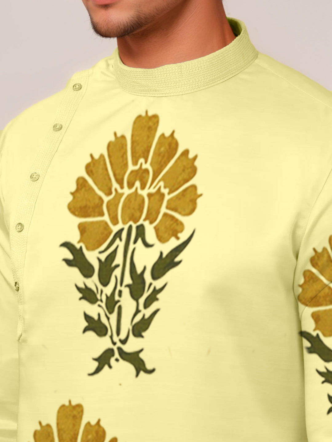 Mens Lime Green Side Placket Printed Kurta Wite Pyjama Set