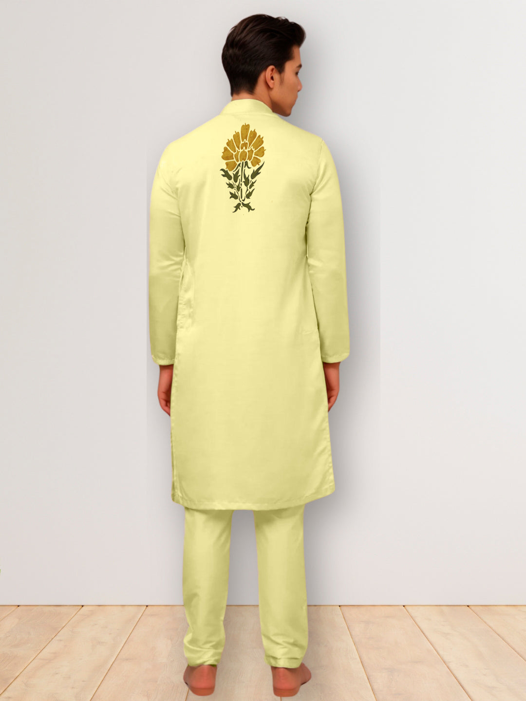 Elevate your ethnic style with this lime green cotton kurta-pyjama set. Designed for comfort and elegance, it's perfect for festive occasions, weddings, and cultural celebrations.