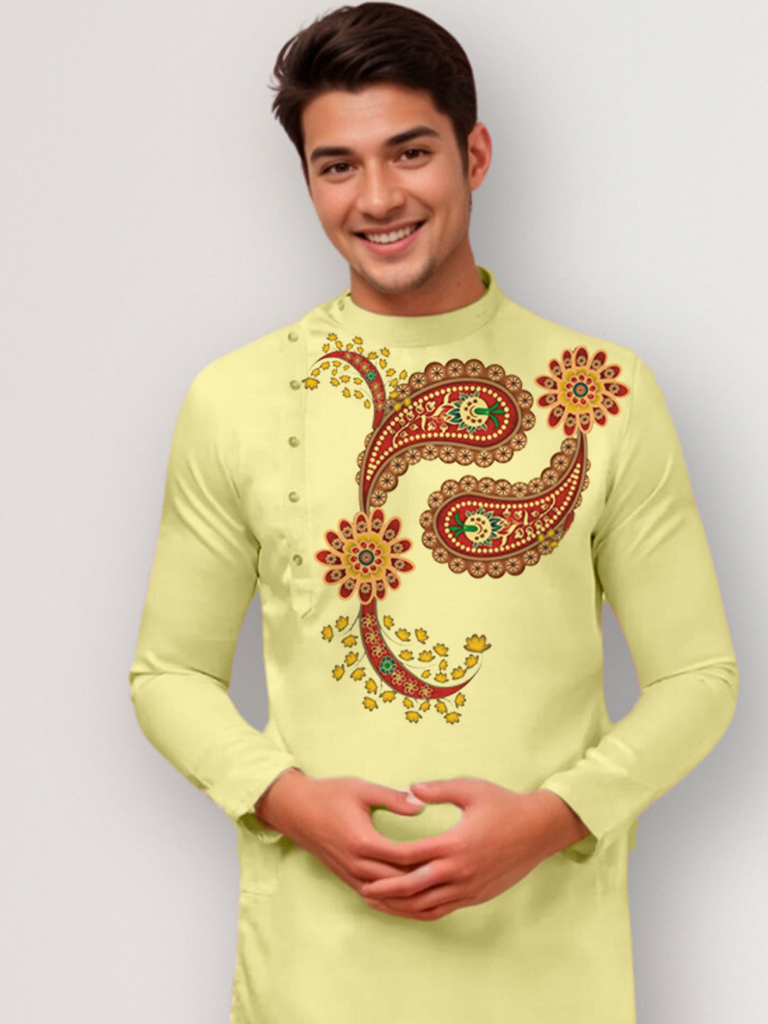 Mens Lime Green Side Placket Printed Kurta Wite Pyjama Set