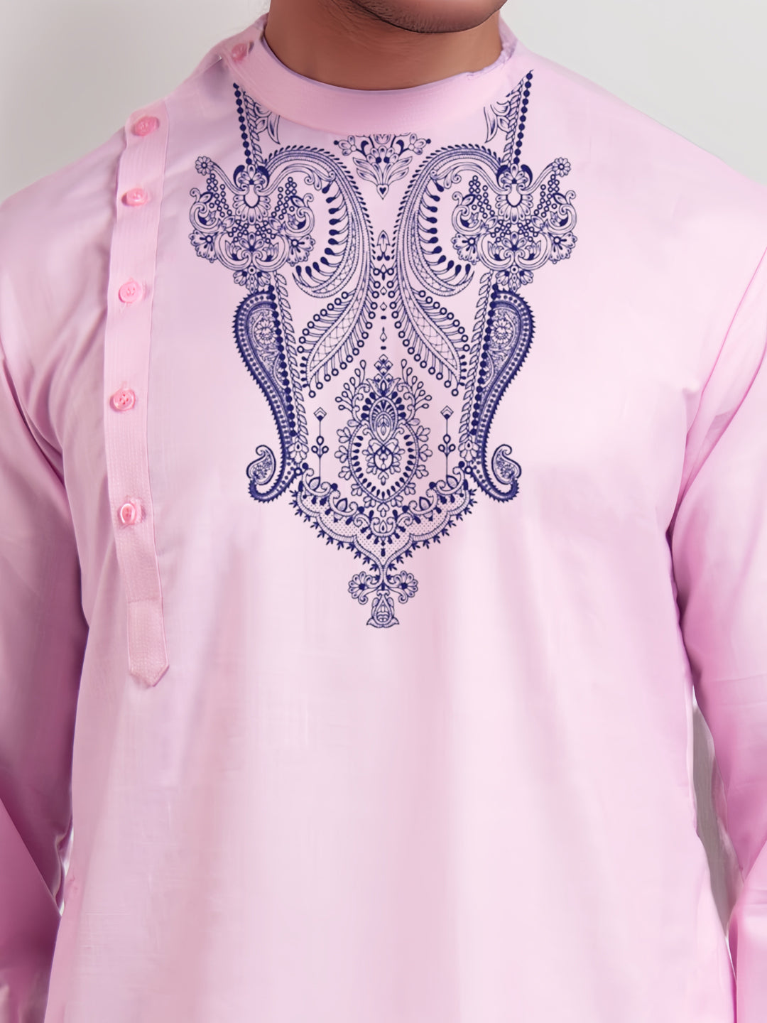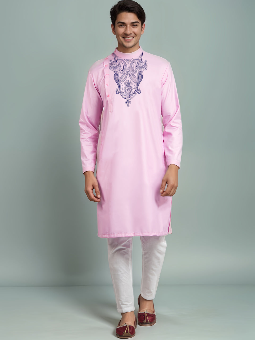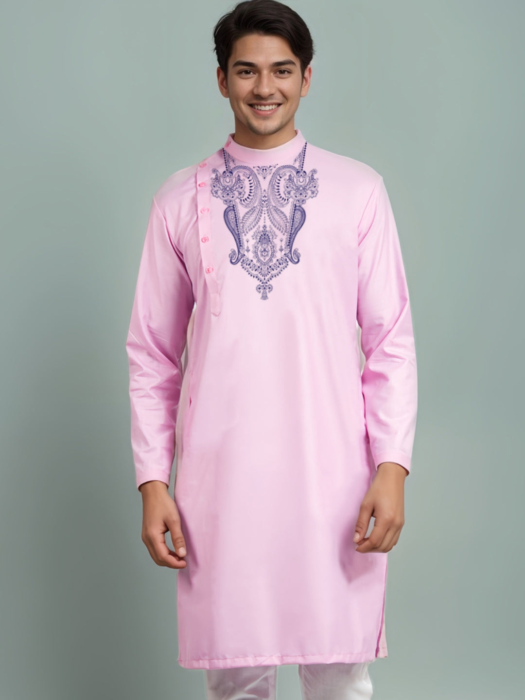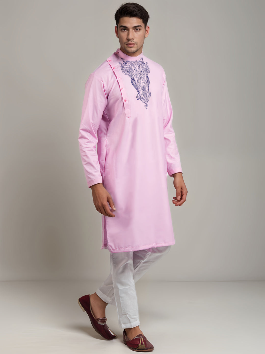 Pair this pink kurta with white churidar or slim-fit trousers for a sophisticated ethnic look. Complete the ensemble with traditional juttis or leather loafers for a refined and elegant appearance.