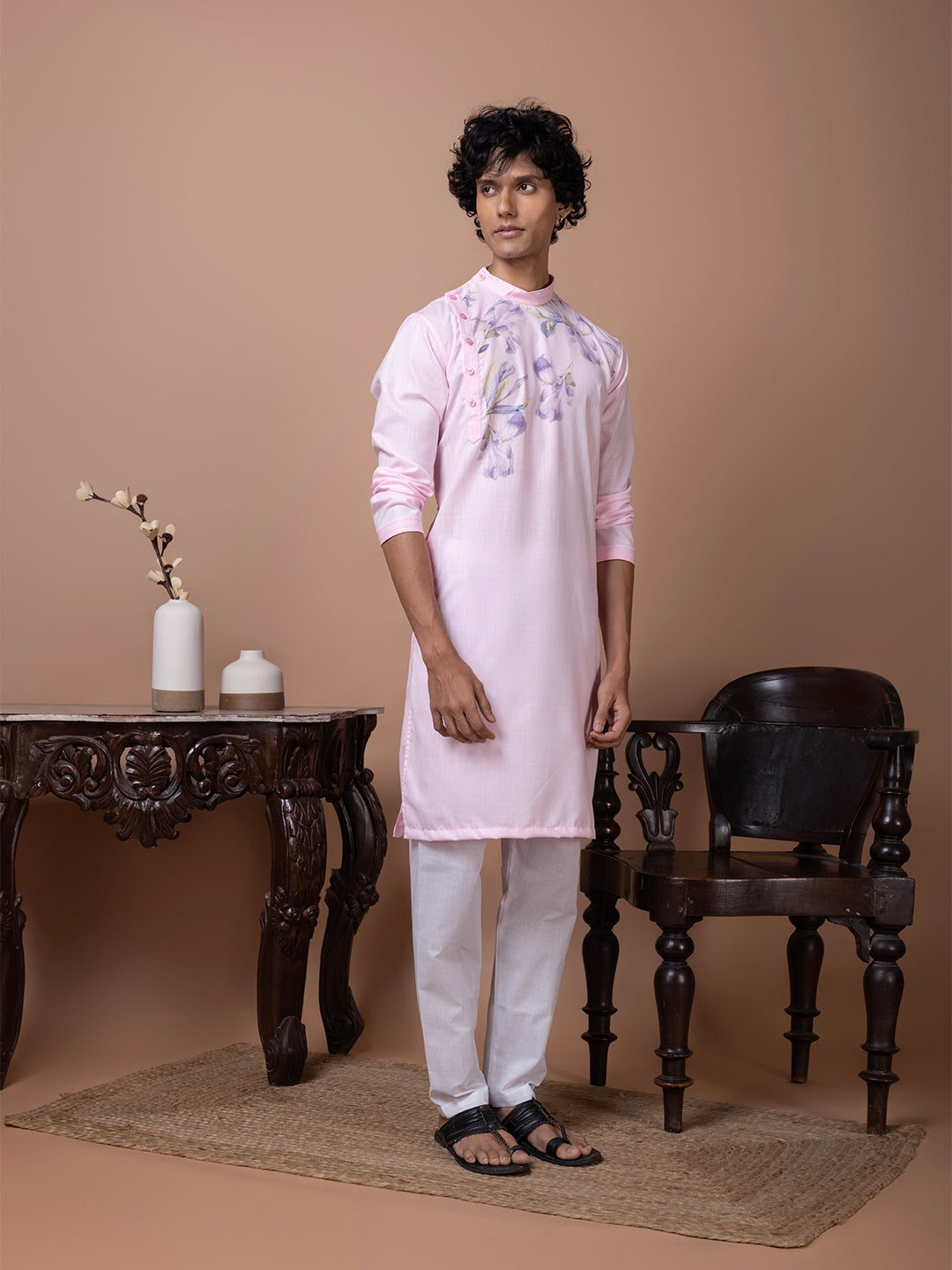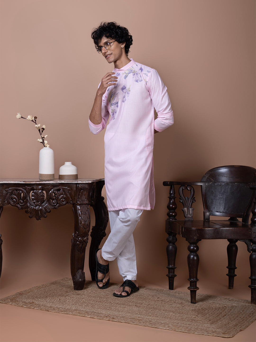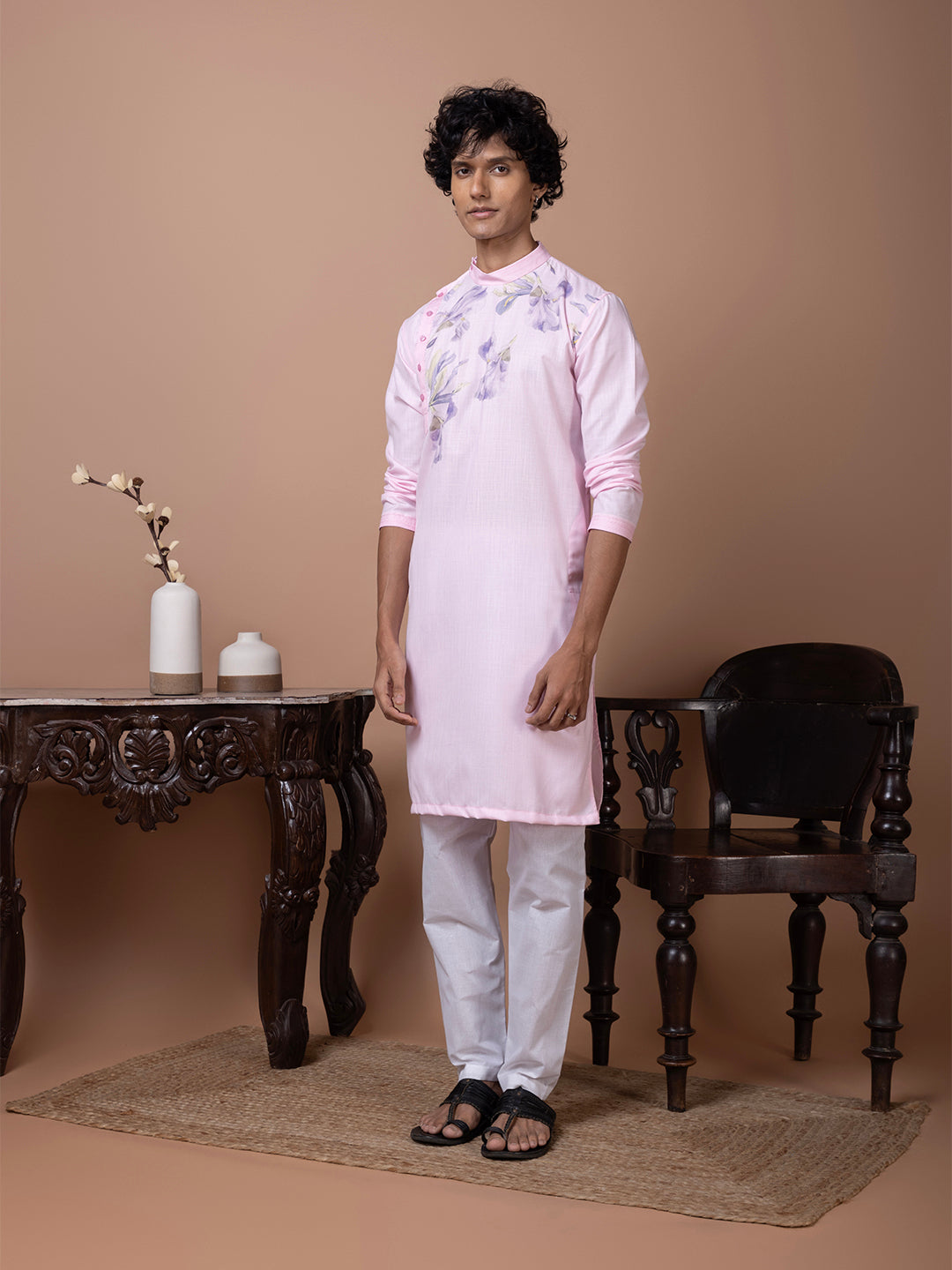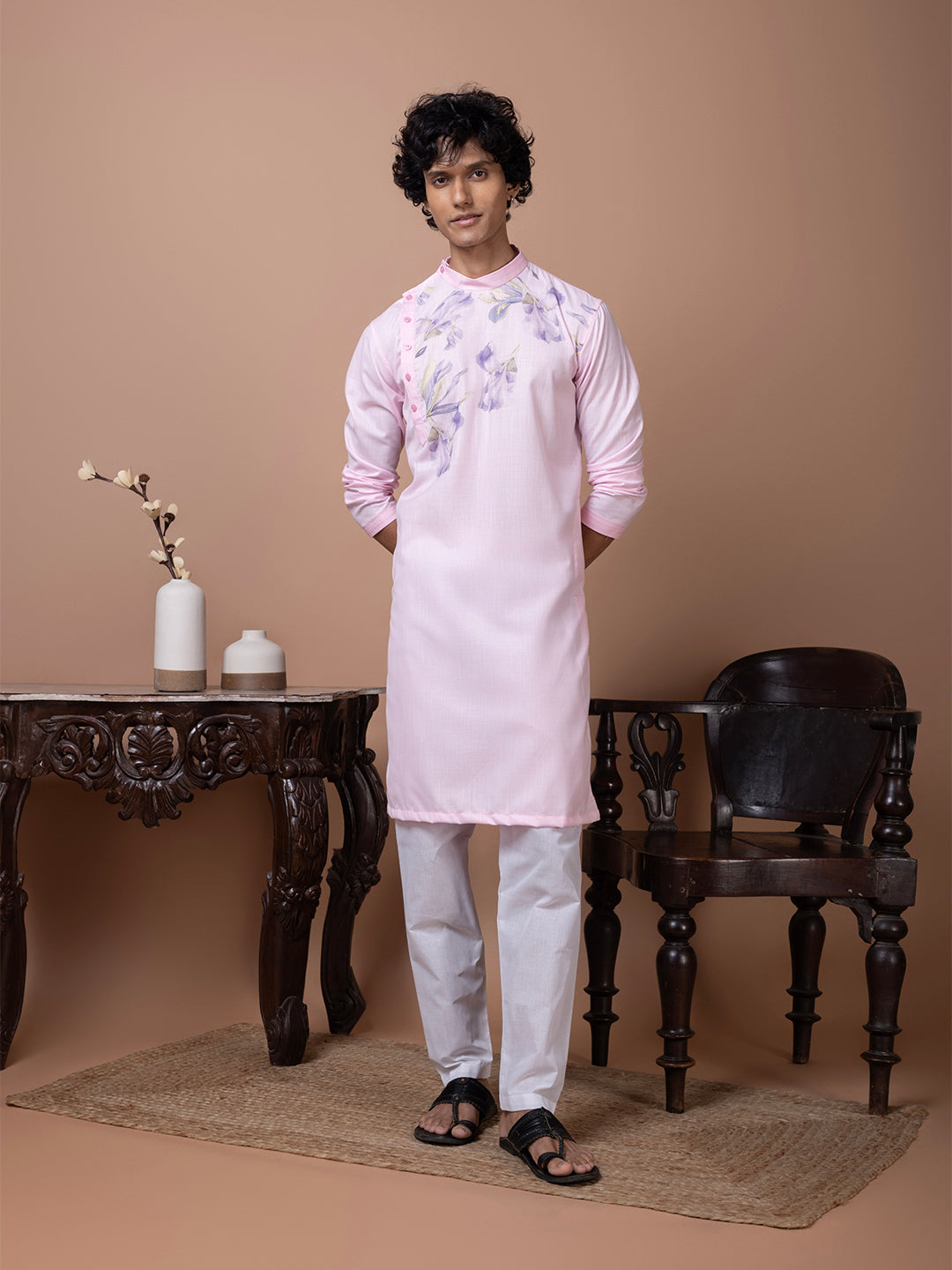 Pair this pink cotton kurta with white churidar or trousers for a polished ethnic look. The subtle printed design enhances its elegance, making it perfect for special occasions and festivities.