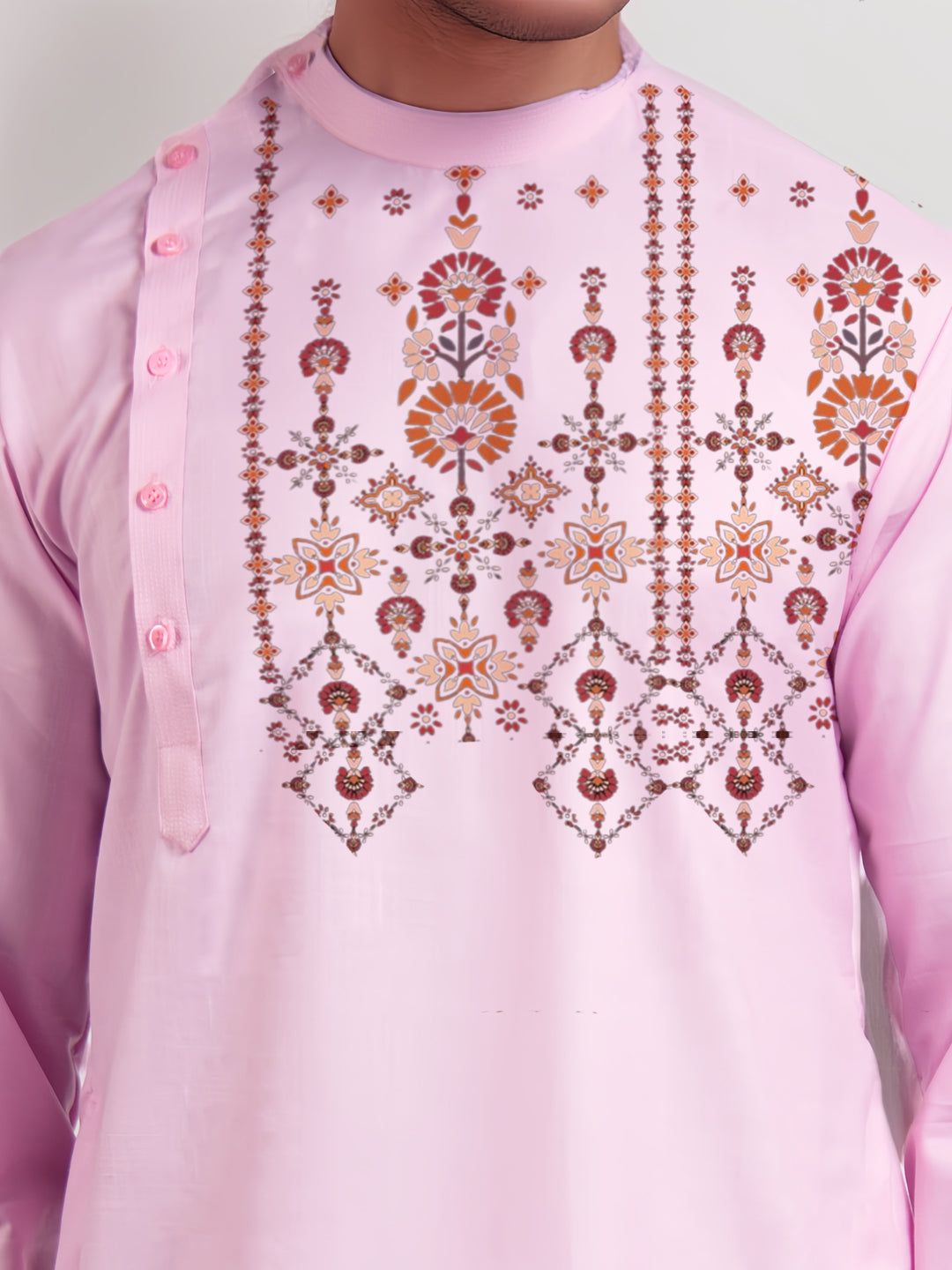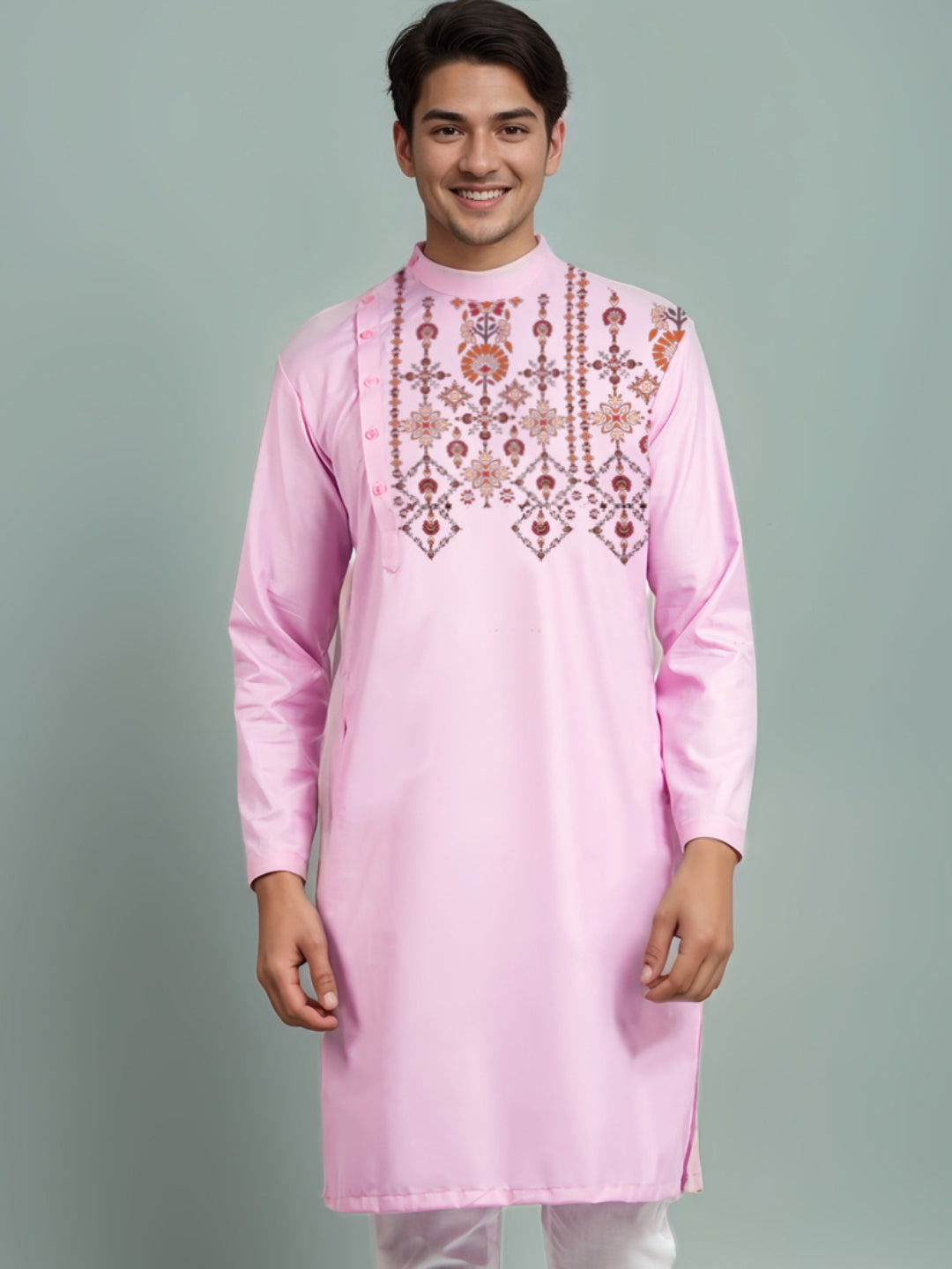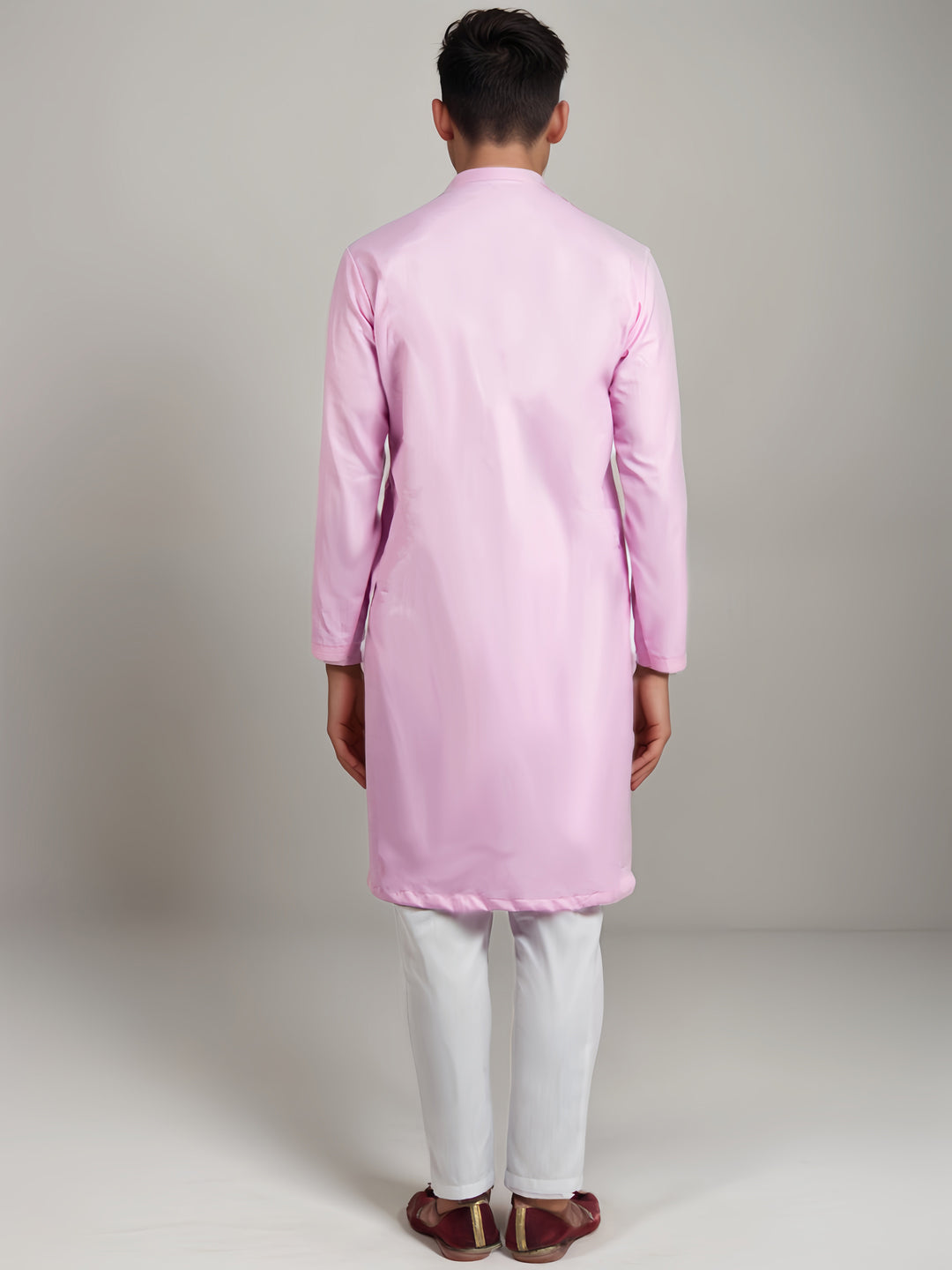 Pair this pink kurta with white churidar or slim-fit trousers for a sophisticated ethnic look. Complete the ensemble with traditional juttis or leather loafers for a refined and elegant appearance.