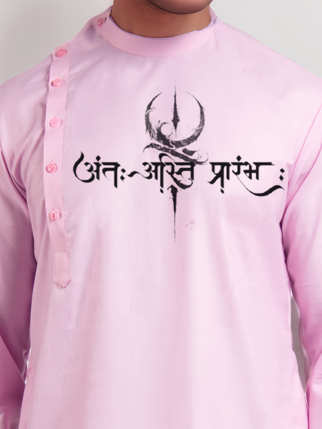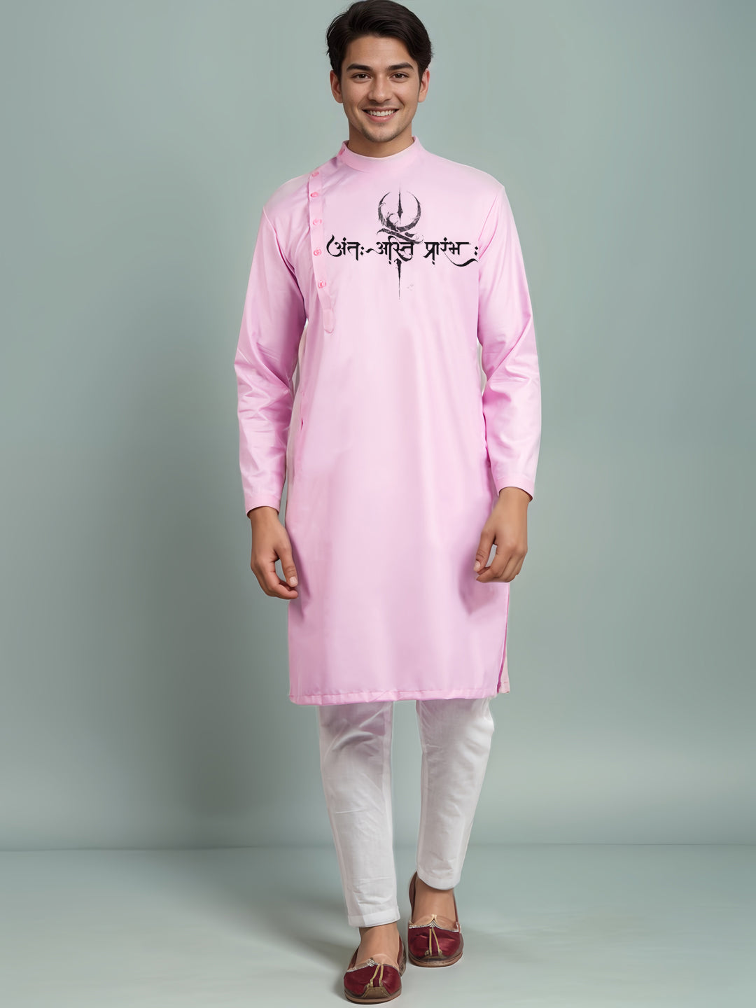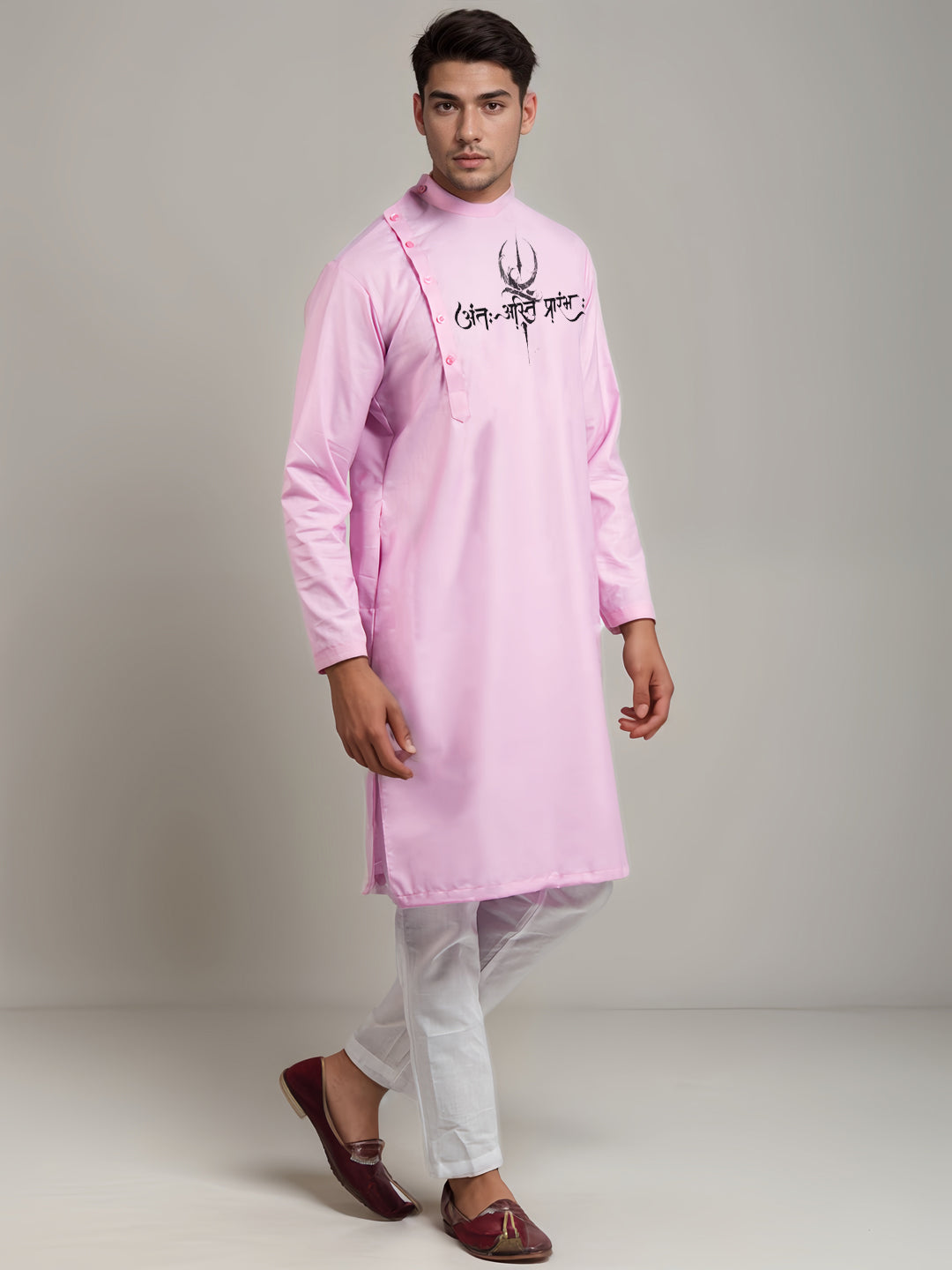 Pair this pink kurta with white churidar or slim-fit trousers for a sophisticated ethnic look. Complete the ensemble with traditional juttis or leather loafers for a refined and elegant appearance.