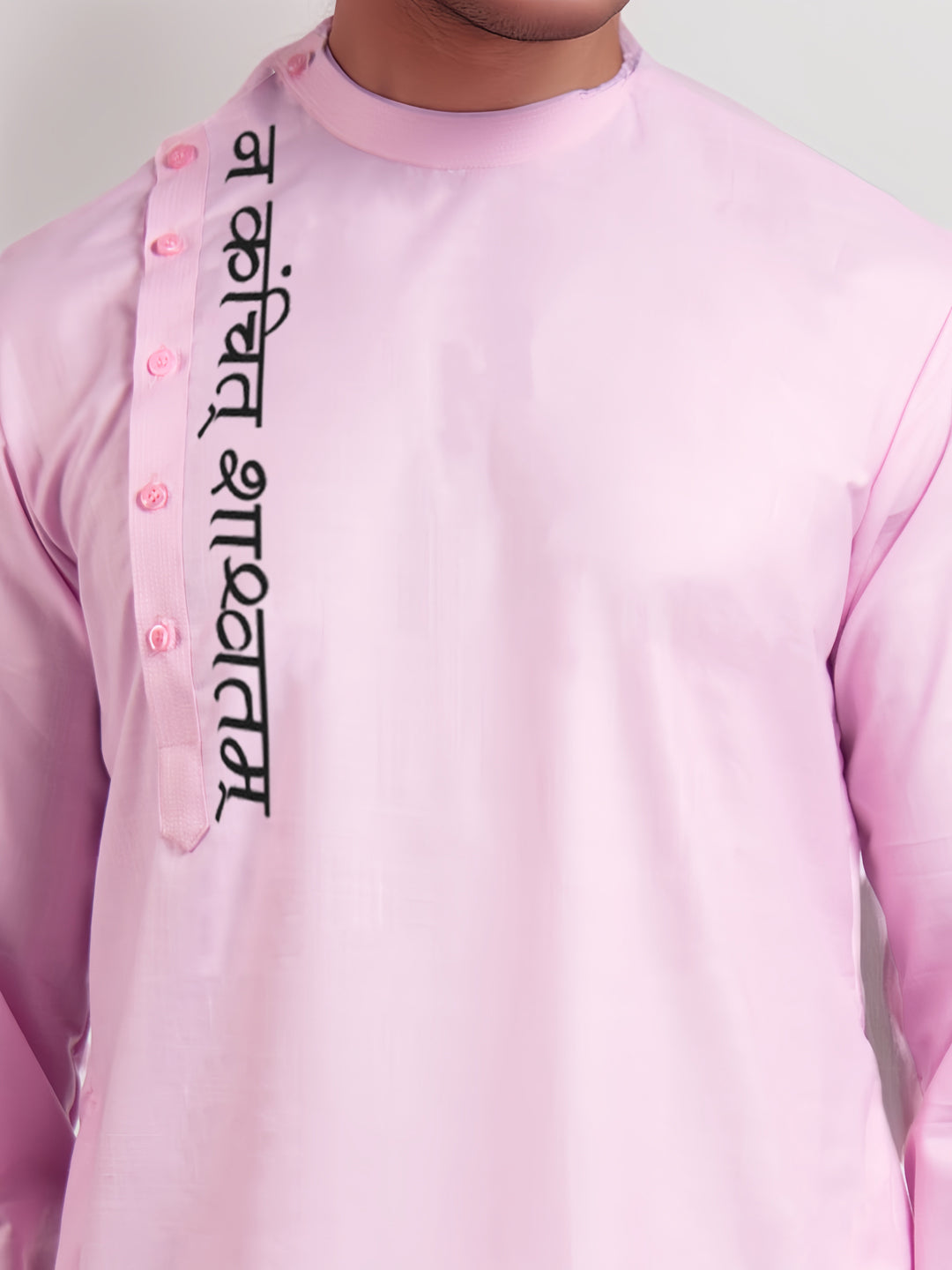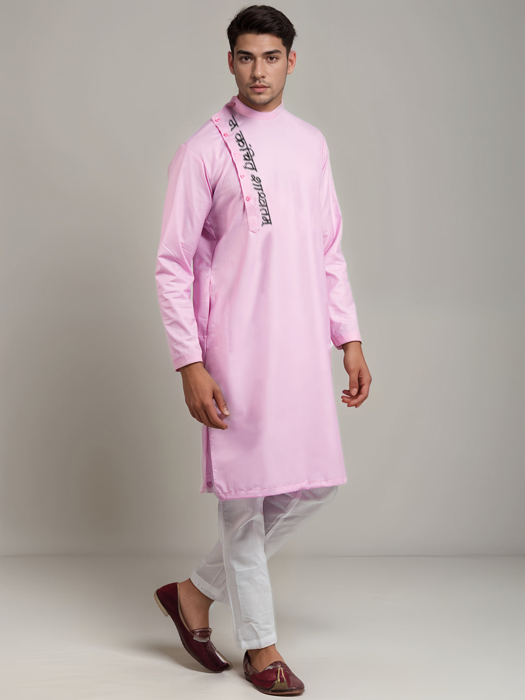 Pair this pink kurta with white churidar or slim-fit trousers for a sophisticated ethnic look. Complete the ensemble with traditional juttis or leather loafers for a refined and elegant appearance.