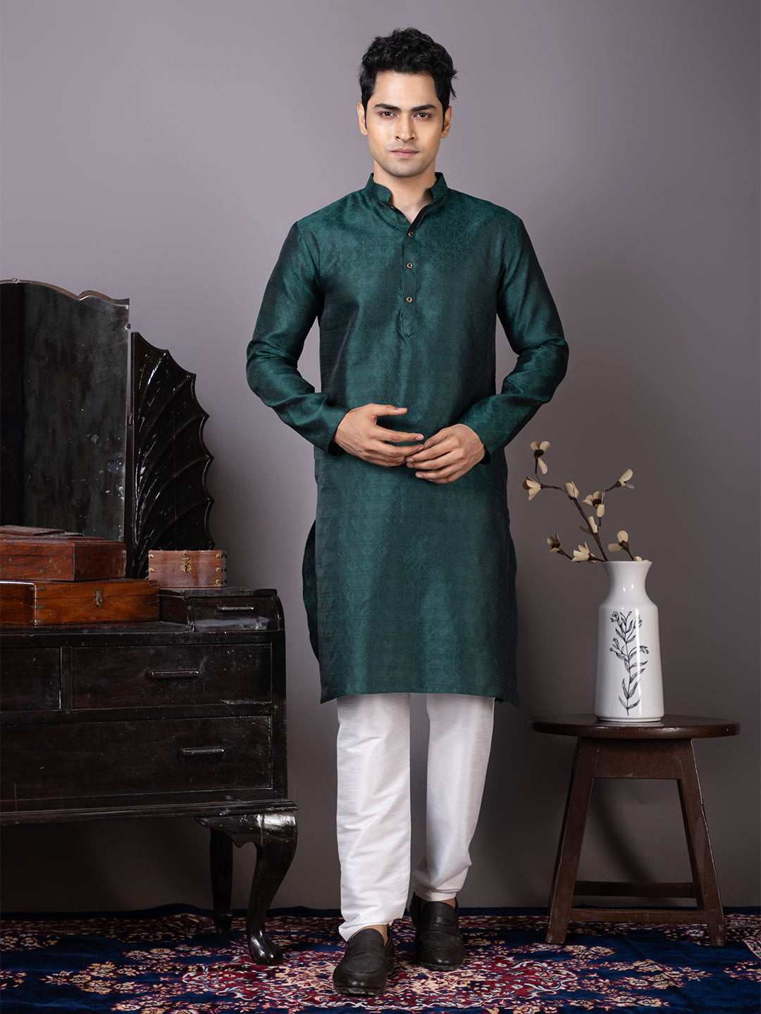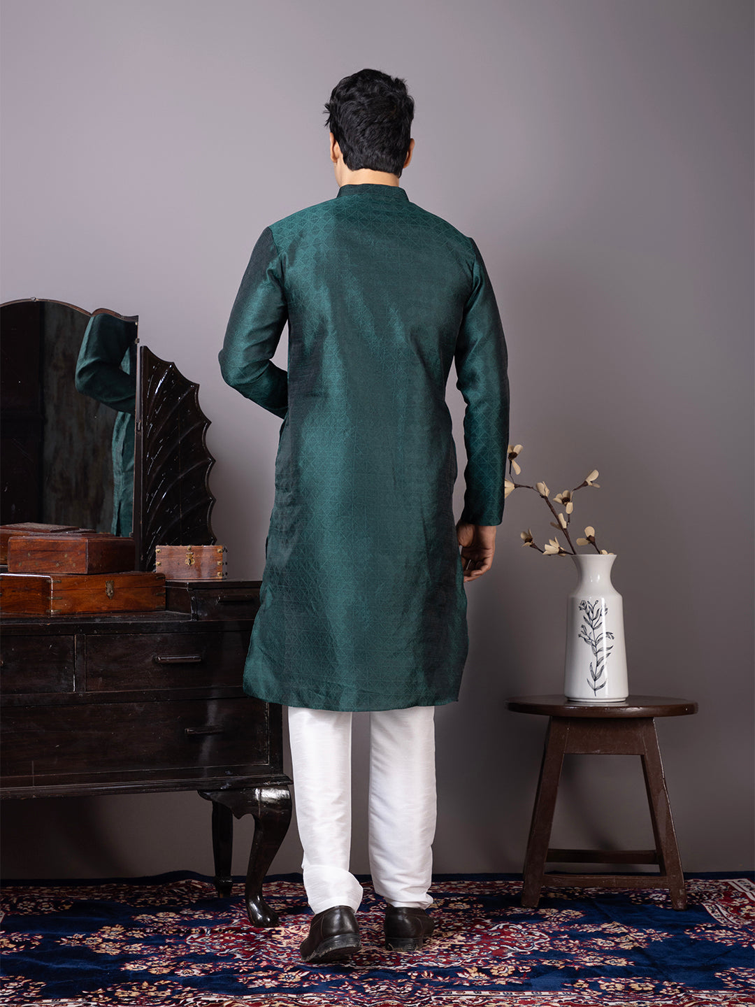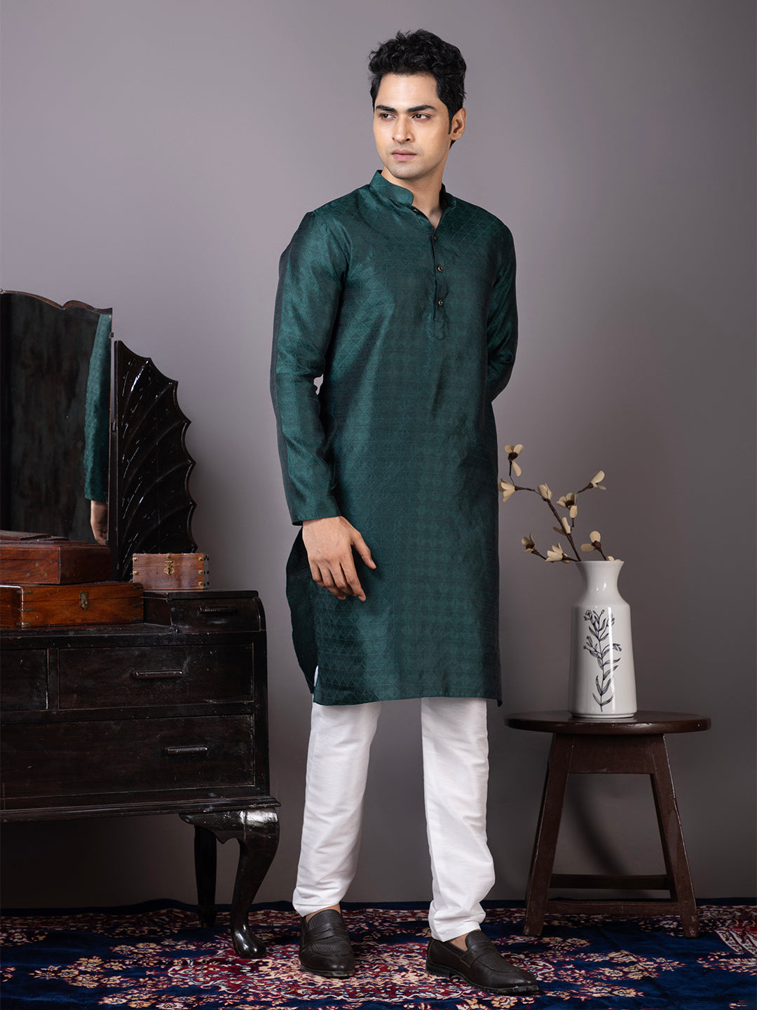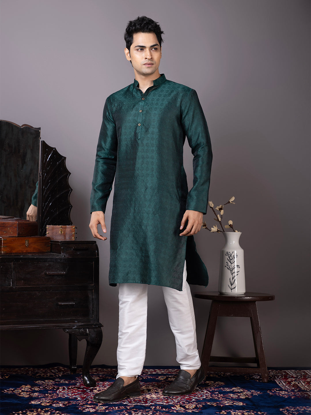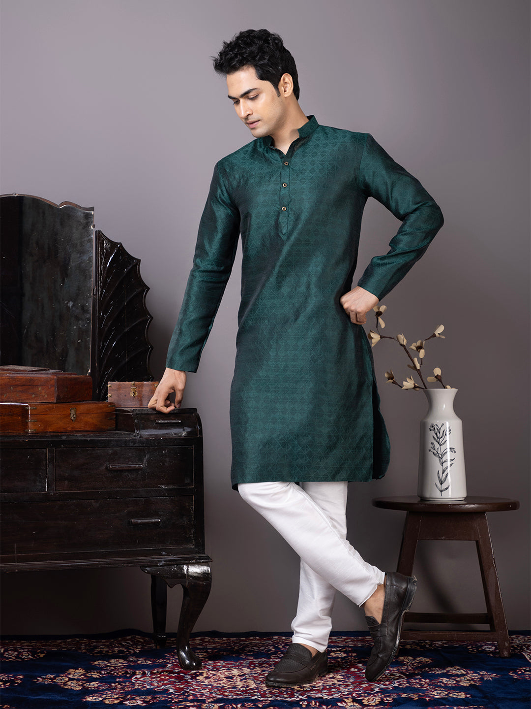 Pair this Green Jacquard kurta with white churidar or trousers for a bold yet sophisticated ethnic look. Perfectly suited for evening parties and traditional celebrations.