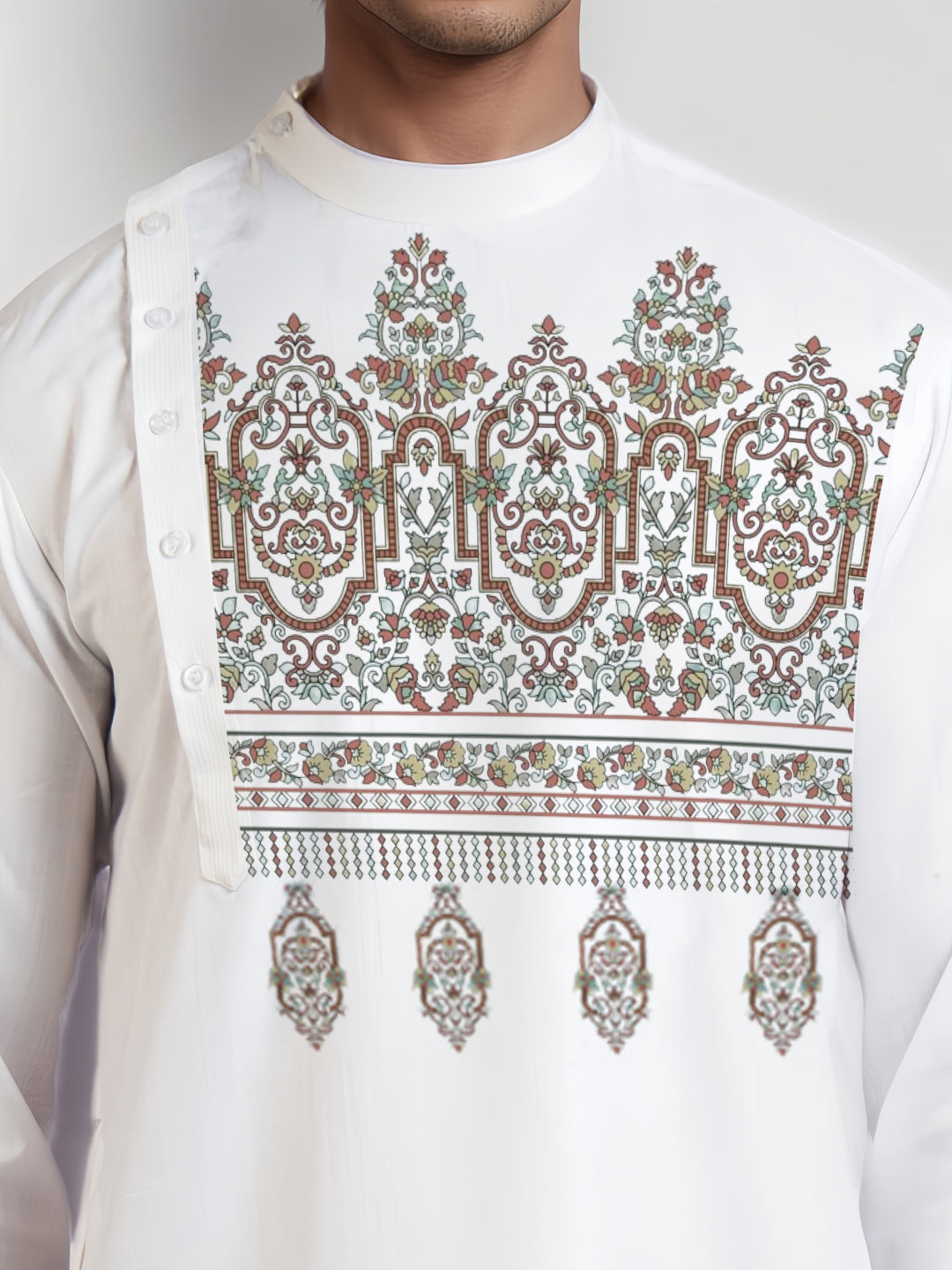 Mens White Side Placket Printed Kurta With Pyjama Set
