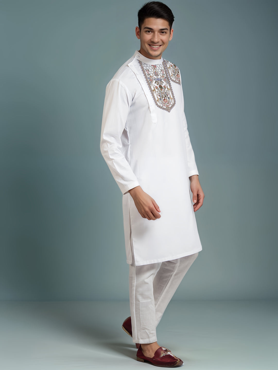 Pair this White Cotton Kurta with a contrasting churidar or straight-fit pyjama to achieve a refined ethnic look. Complete the outfit with classic mojaris or leather sandals.