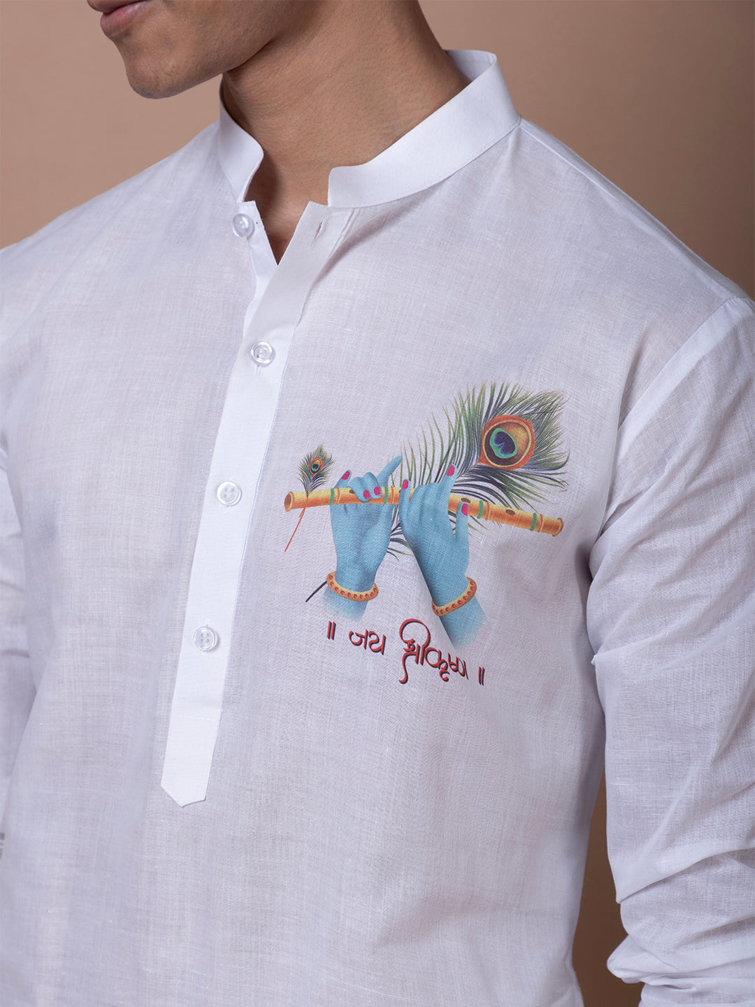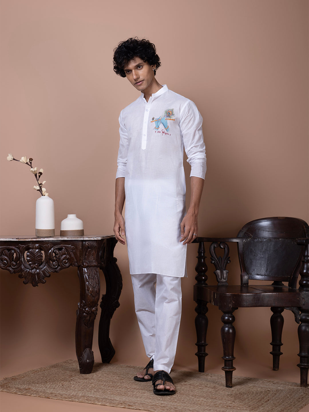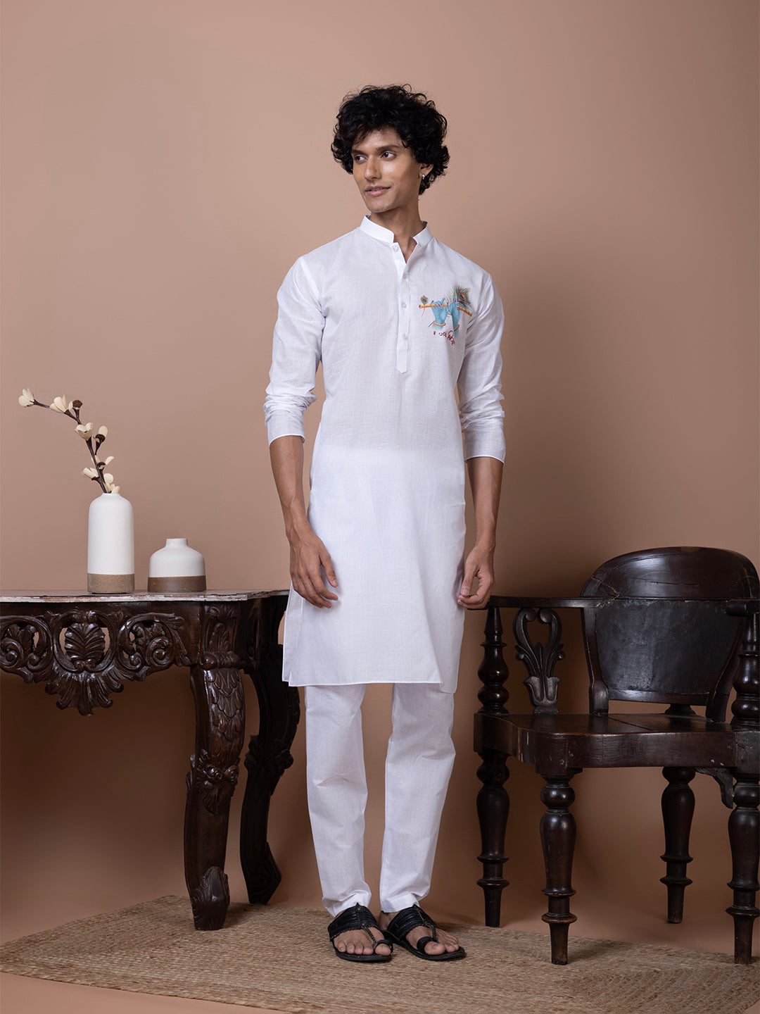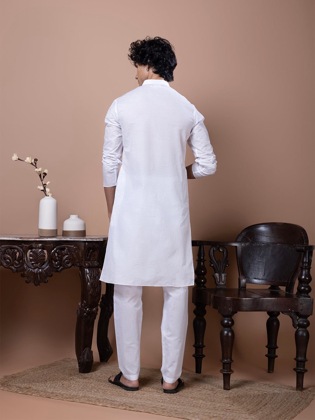 "Elevate your ethnic style with this White cotton kurta and white pyjama set. Designed for comfort and elegance, it features a subtle print and a mandarin collar, perfect for festive and cultural occasions."