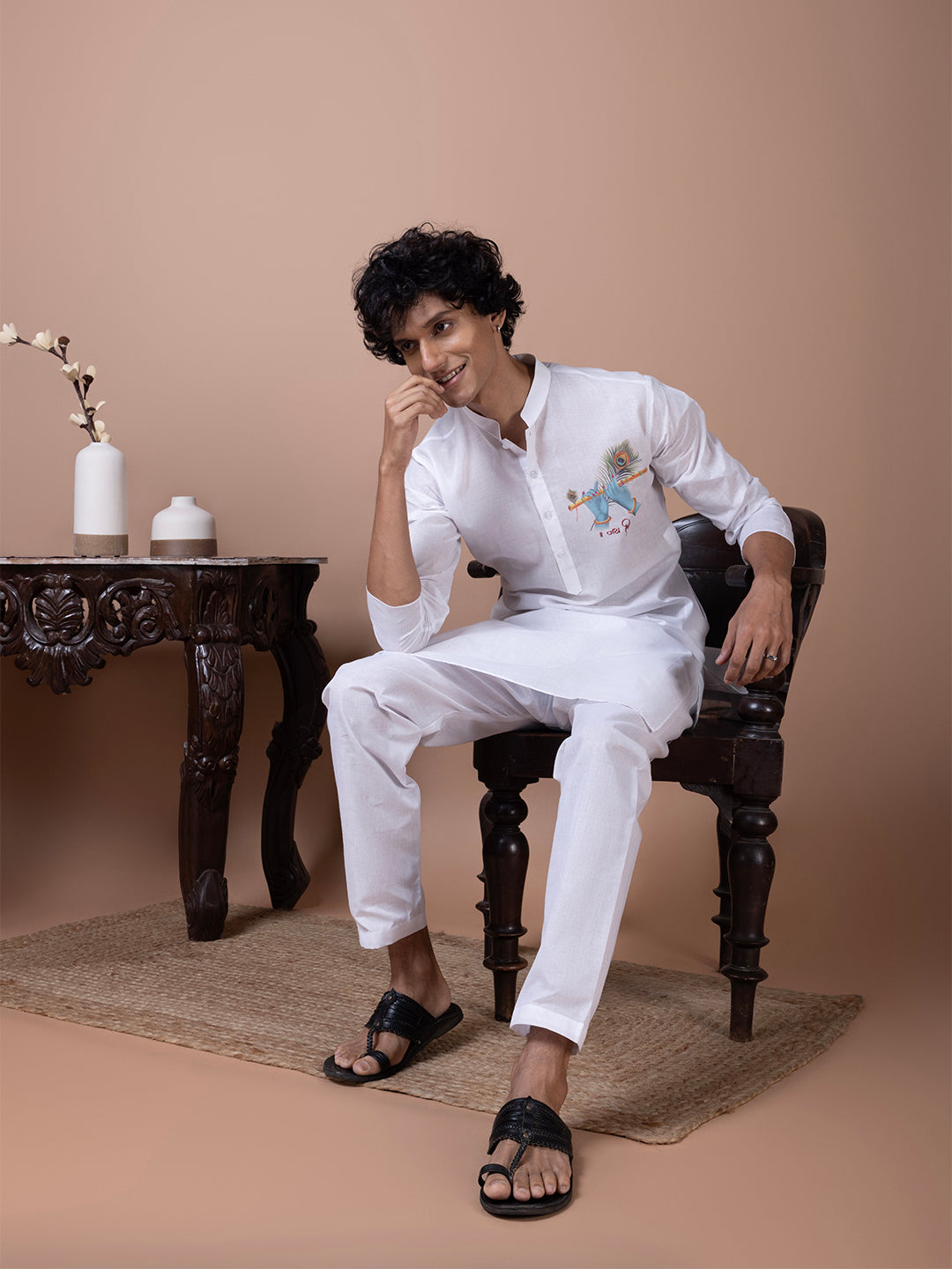 Pair this White kurta with white churidar or slim-fit trousers for a timeless ethnic look. Complete the outfit with leather loafers or traditional juttis to make a bold style statement.