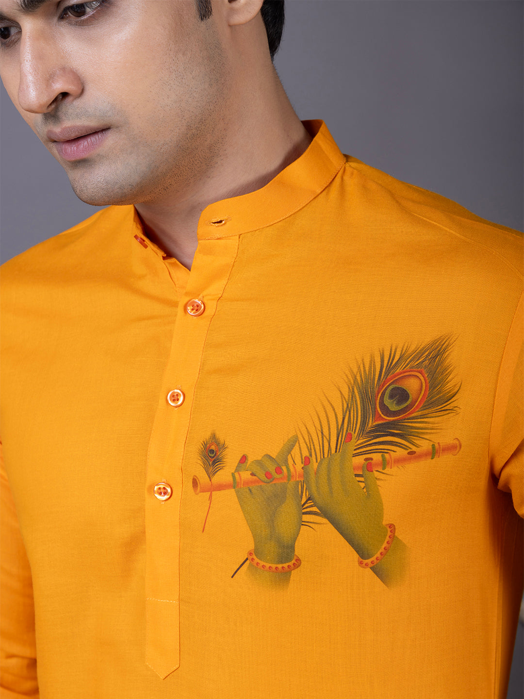"Elevate your ethnic style with this Orange cotton kurta and white pyjama set. Designed for comfort and elegance, it features a subtle print and a mandarin collar, perfect for festive and cultural occasions."
