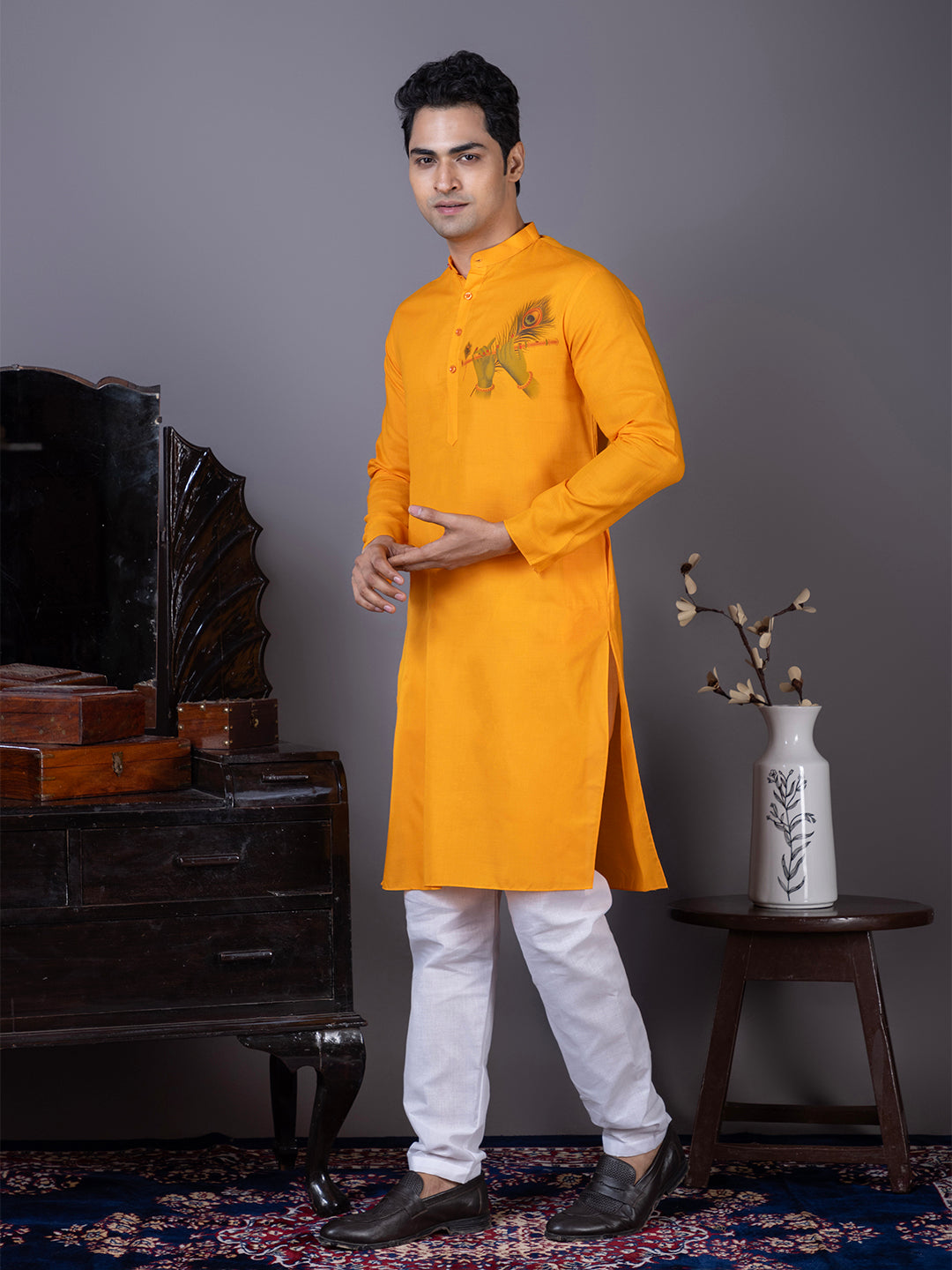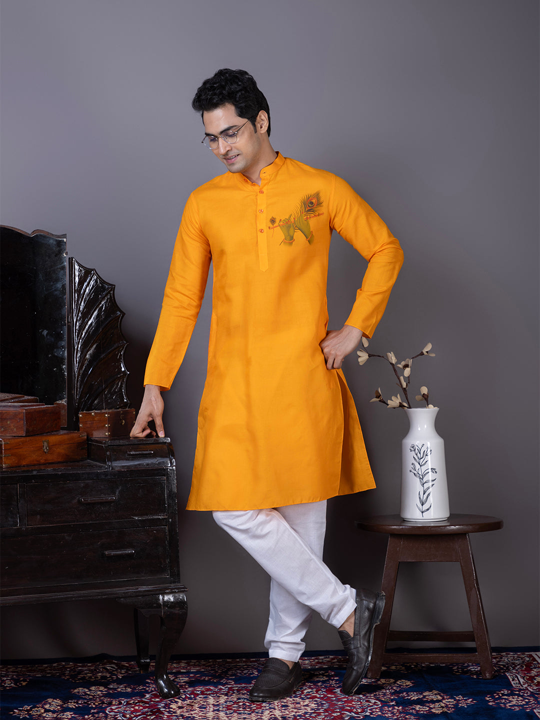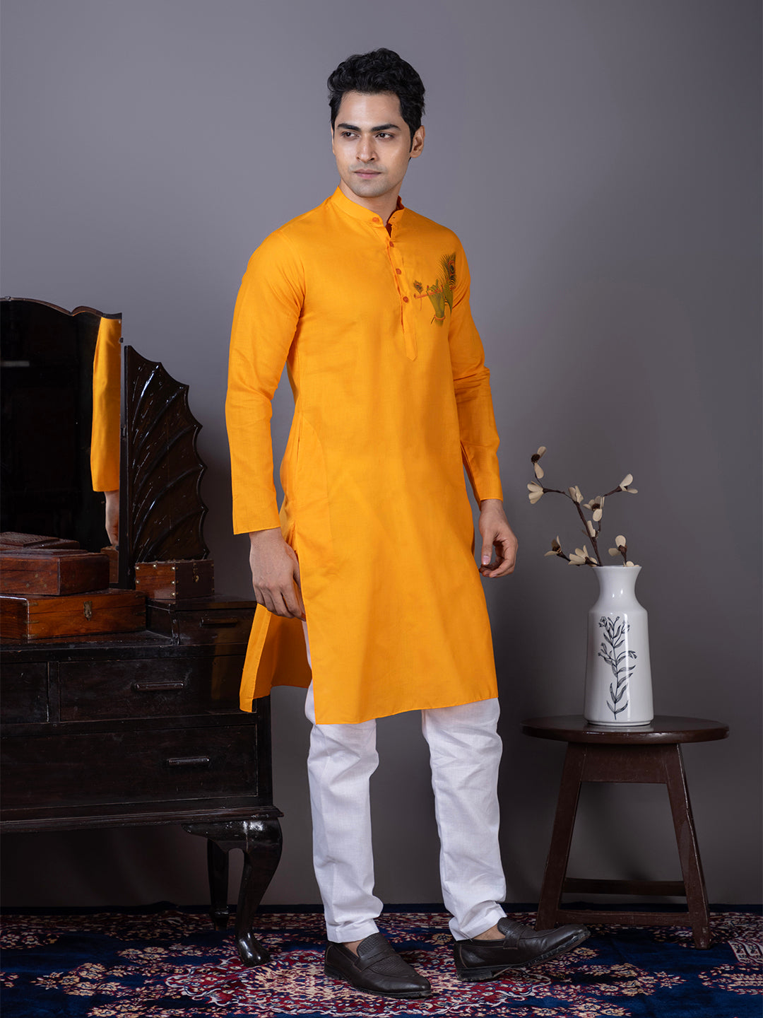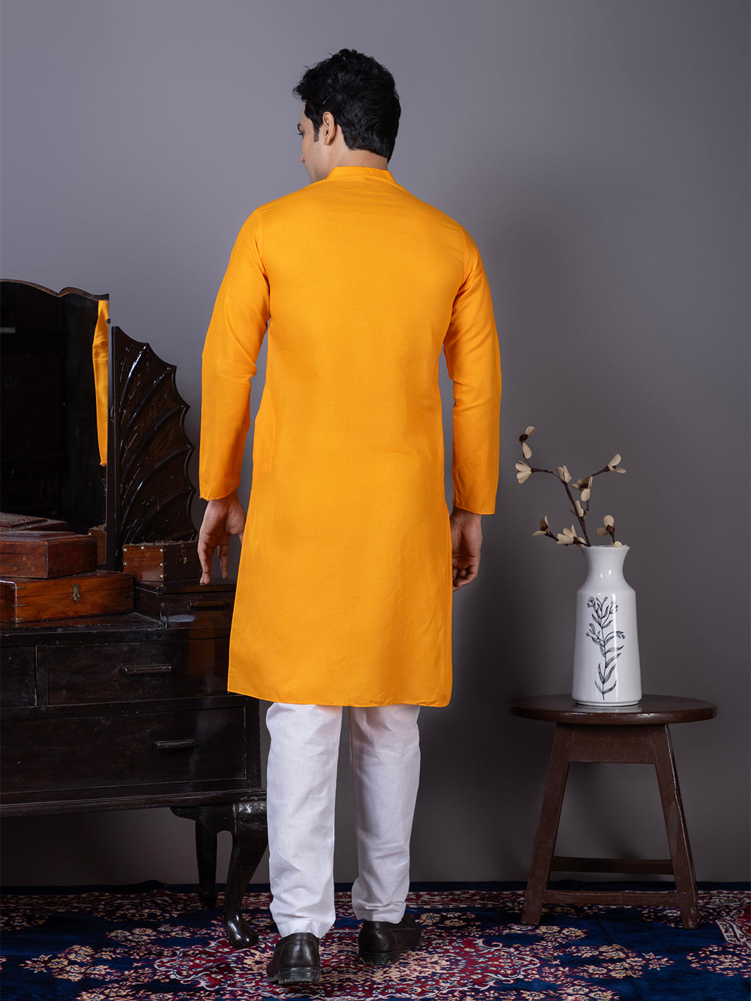 Pair this Orange kurta with white churidar or slim-fit trousers for a timeless ethnic look. Complete the outfit with leather loafers or traditional juttis to make a bold style statement.
