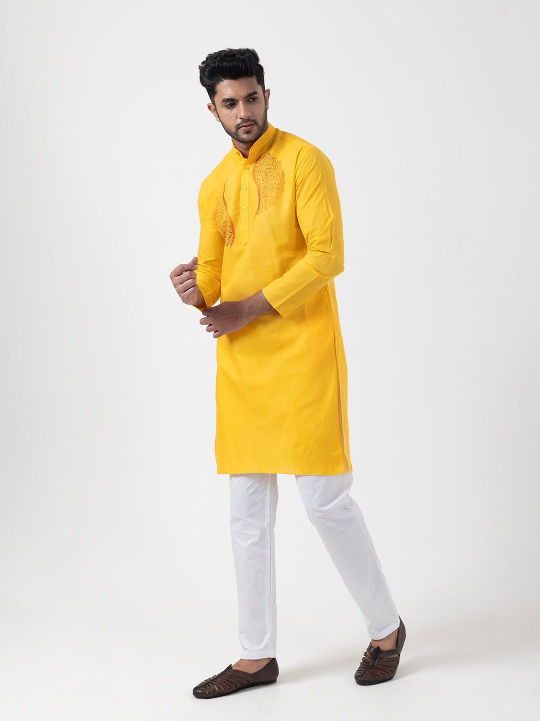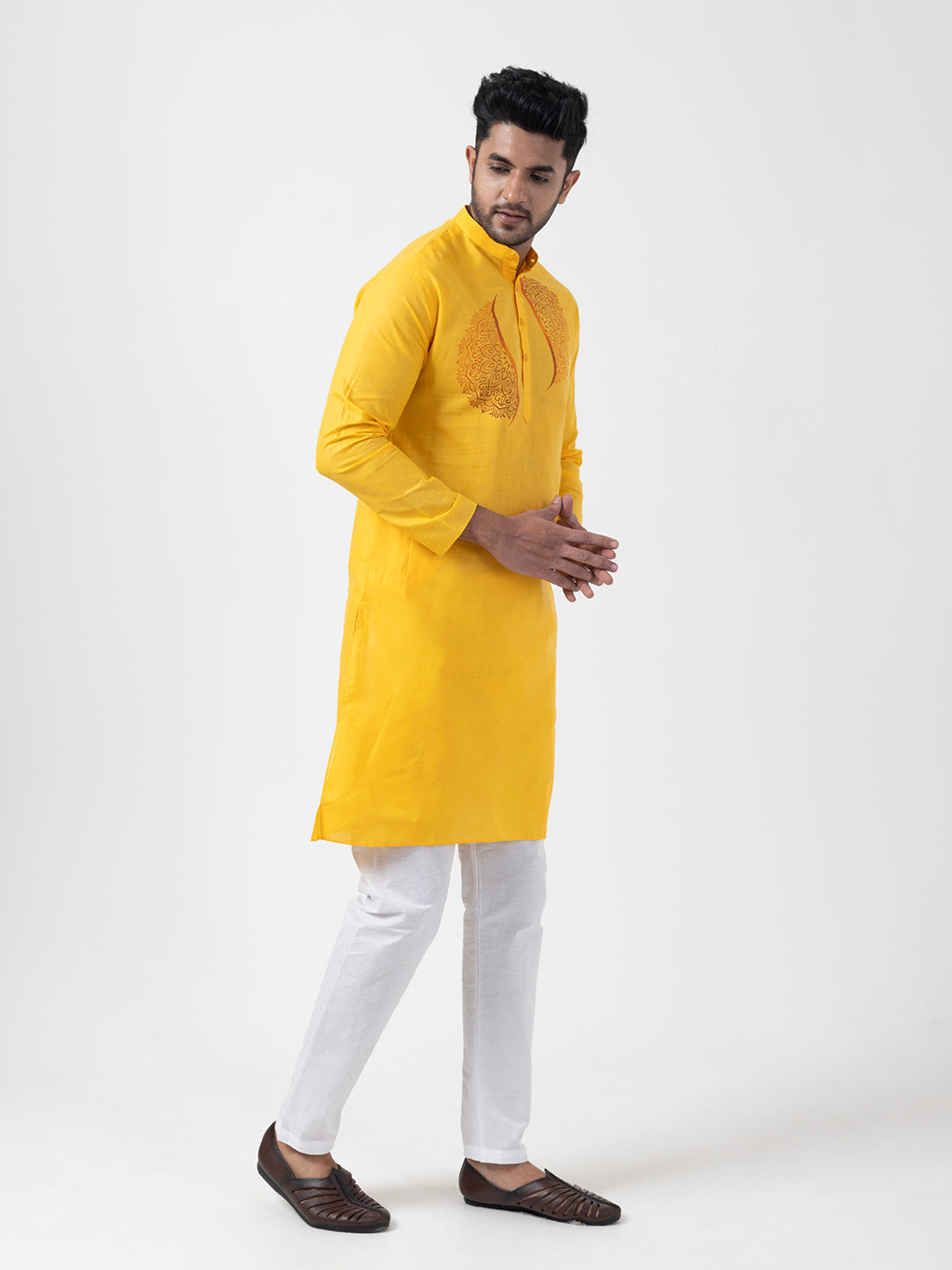 Pair this yellow kurta with white churidar or slim-fit trousers for a timeless ethnic look. Complete the outfit with leather loafers or traditional juttis to make a bold style statement.