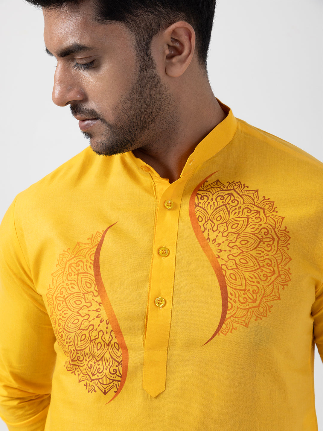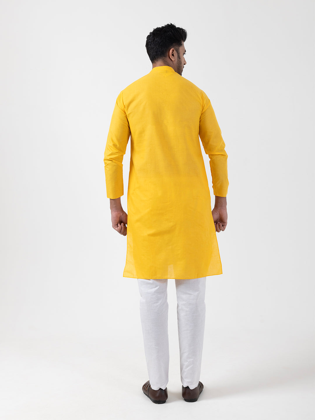 "Elevate your ethnic style with this yellow cotton kurta and white pyjama set. Designed for comfort and elegance, it features a subtle print and a mandarin collar, perfect for festive and cultural occasions."