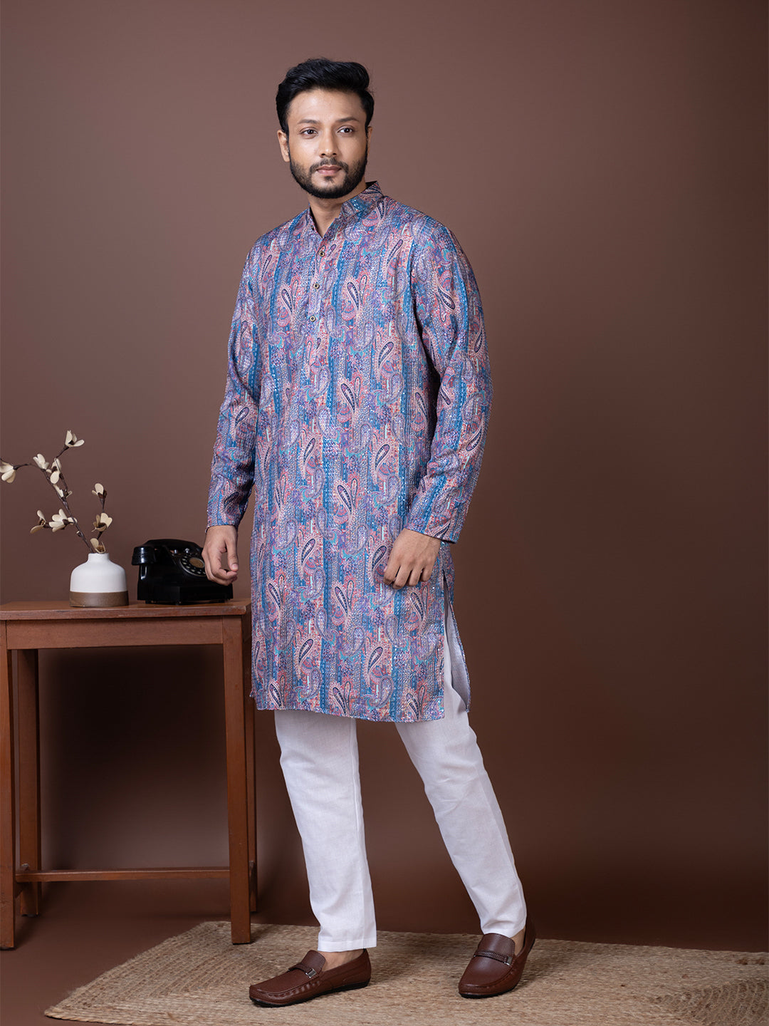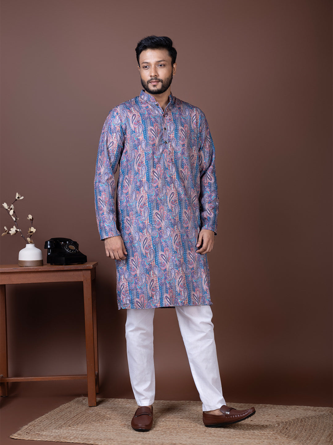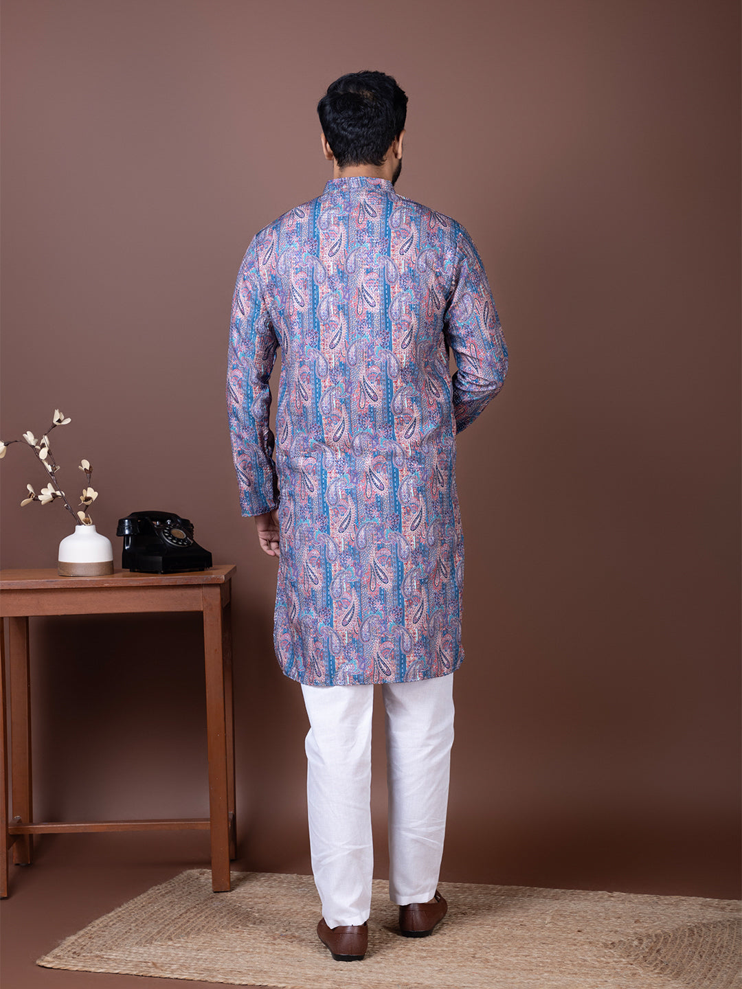 "Elevate your ethnic style with this Multi cotton kurta and white pyjama set. Designed for comfort and elegance, it features a subtle print and a mandarin collar, perfect for festive and cultural occasions."
