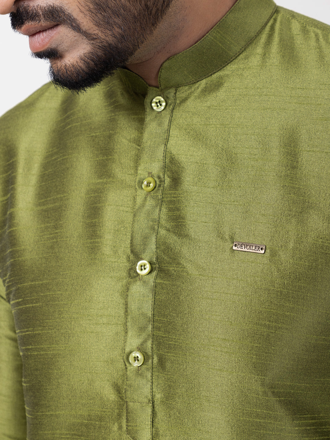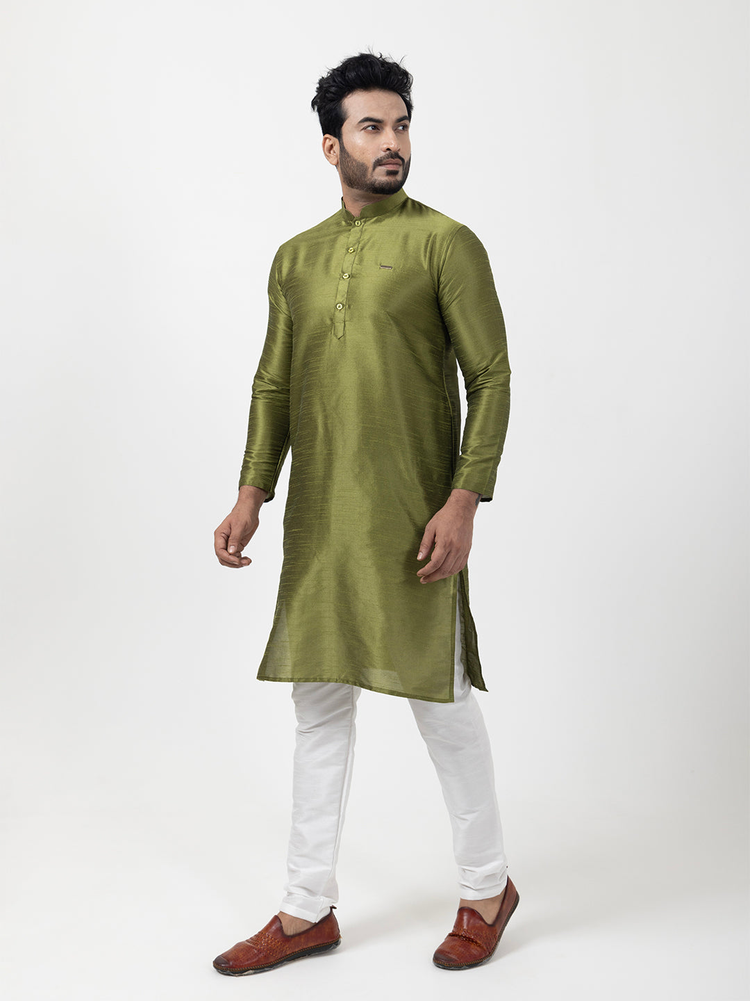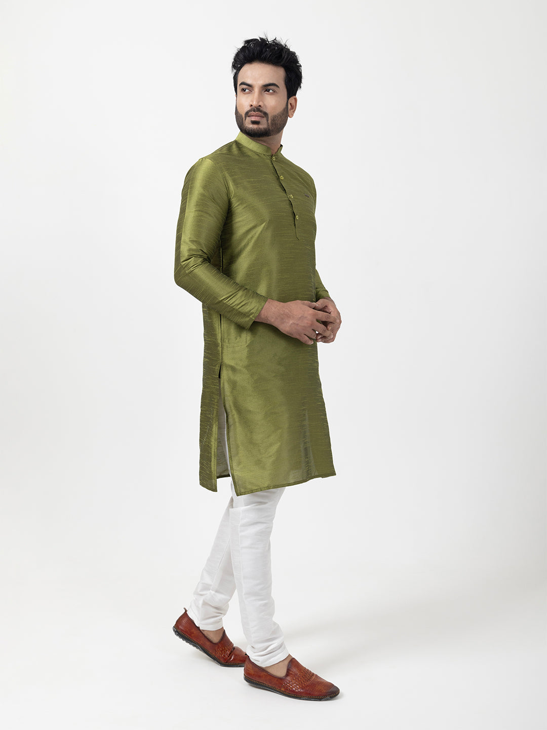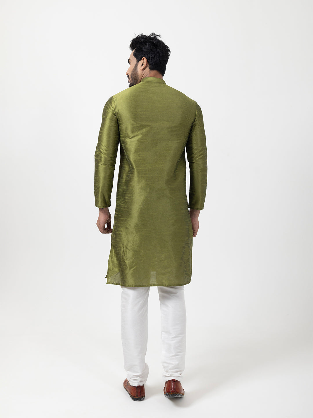 Elevate your ethnic style with this Green Dupion Silk Kurta and White pyjama set. Crafted from premium fabric, it offers a regal look with a refined finish. Perfect for festive occasions and celebrations.
