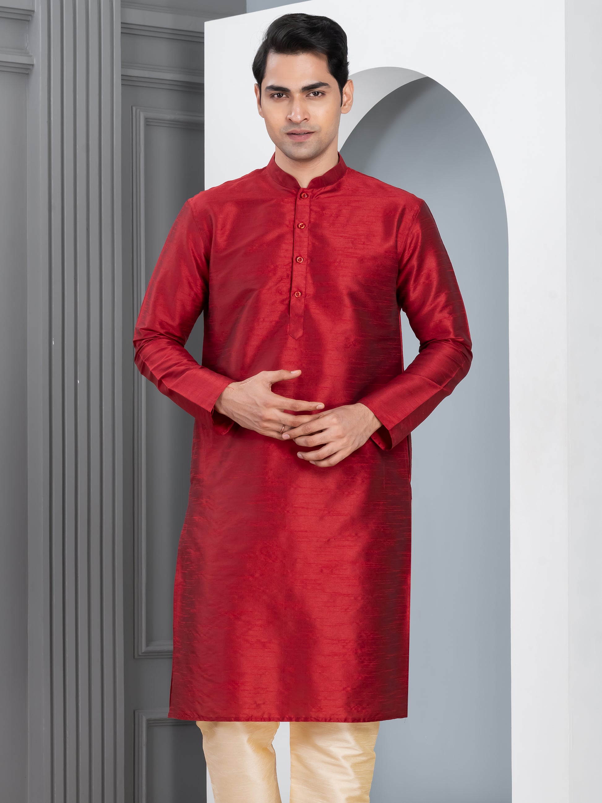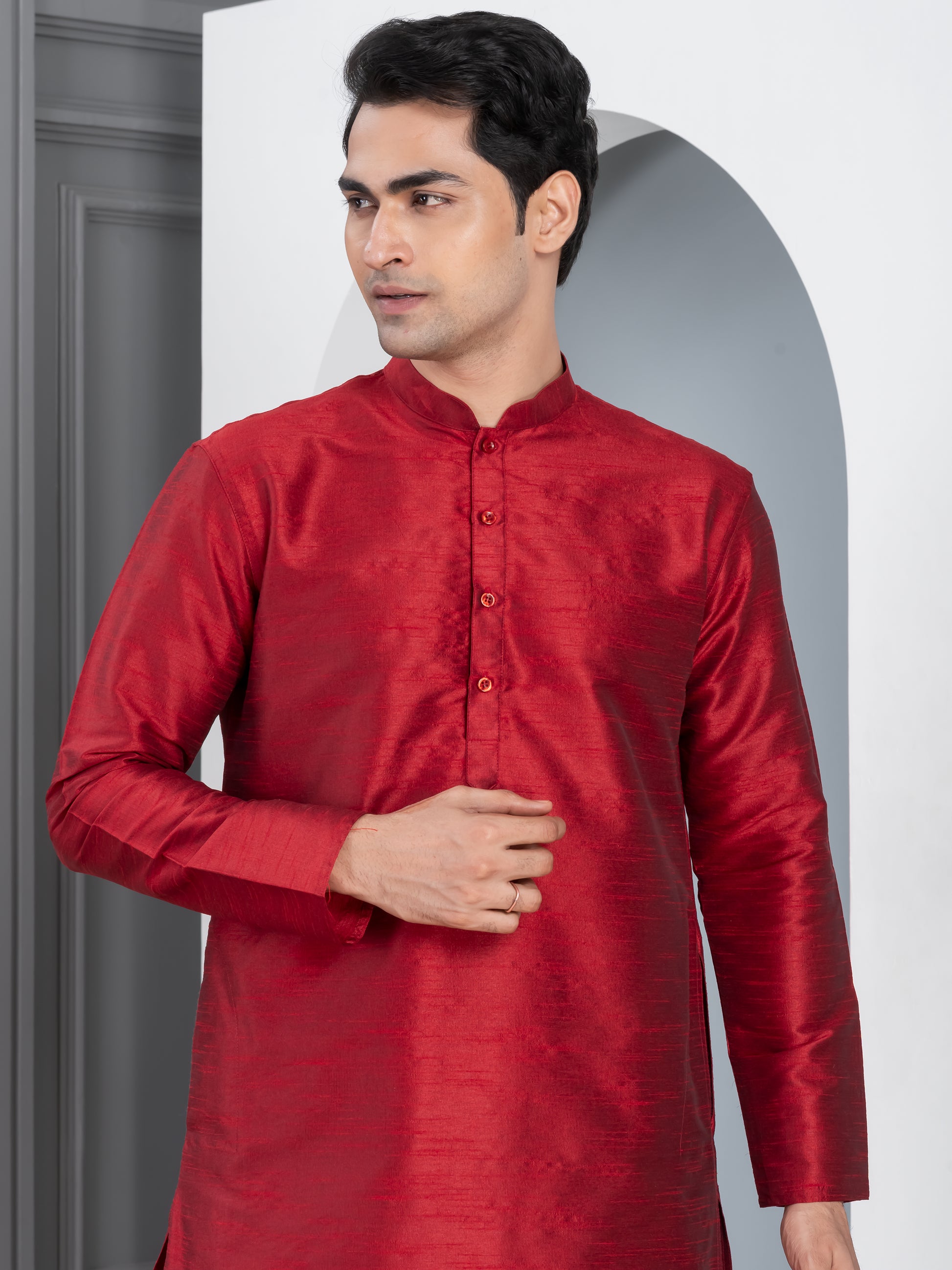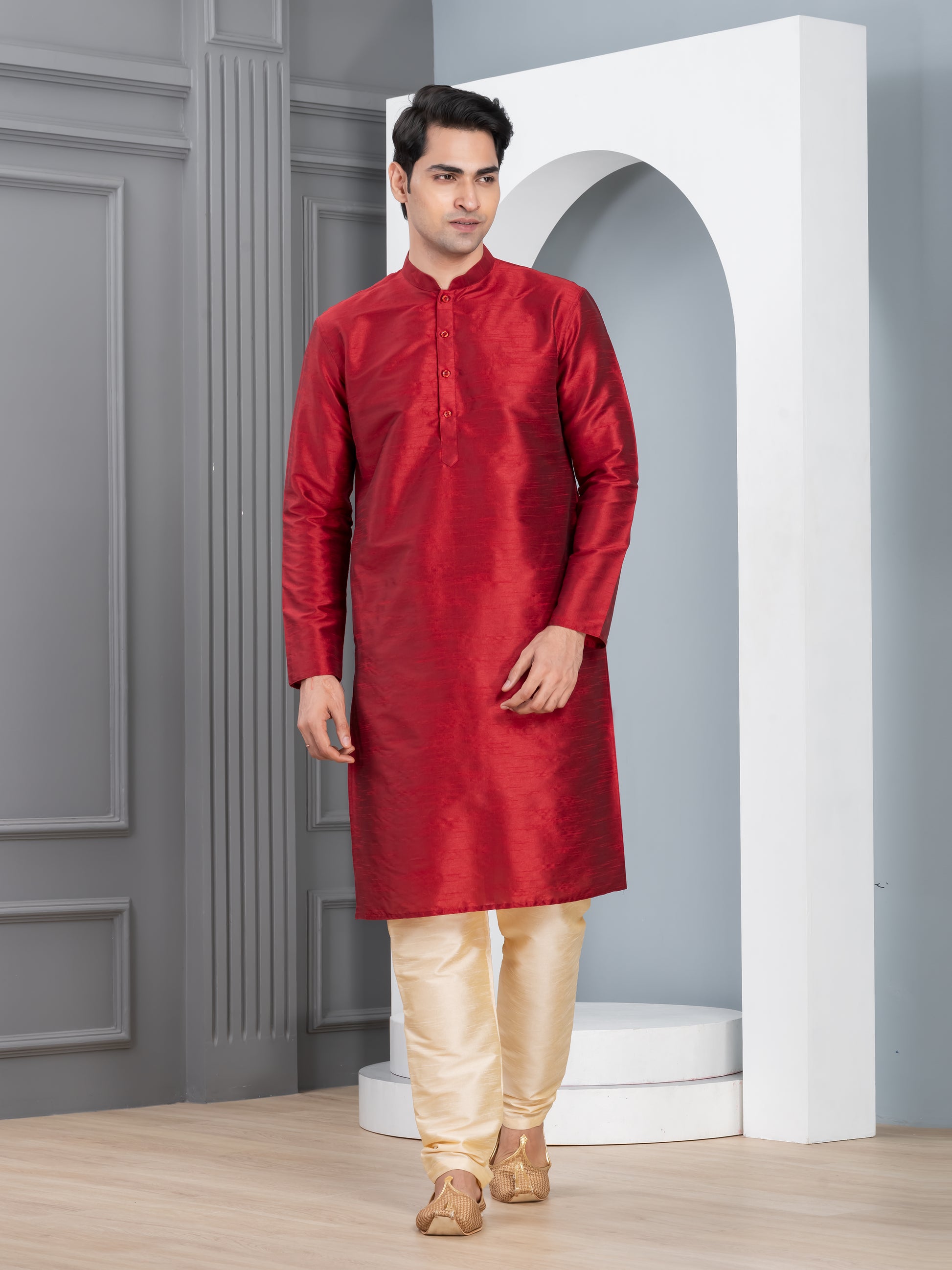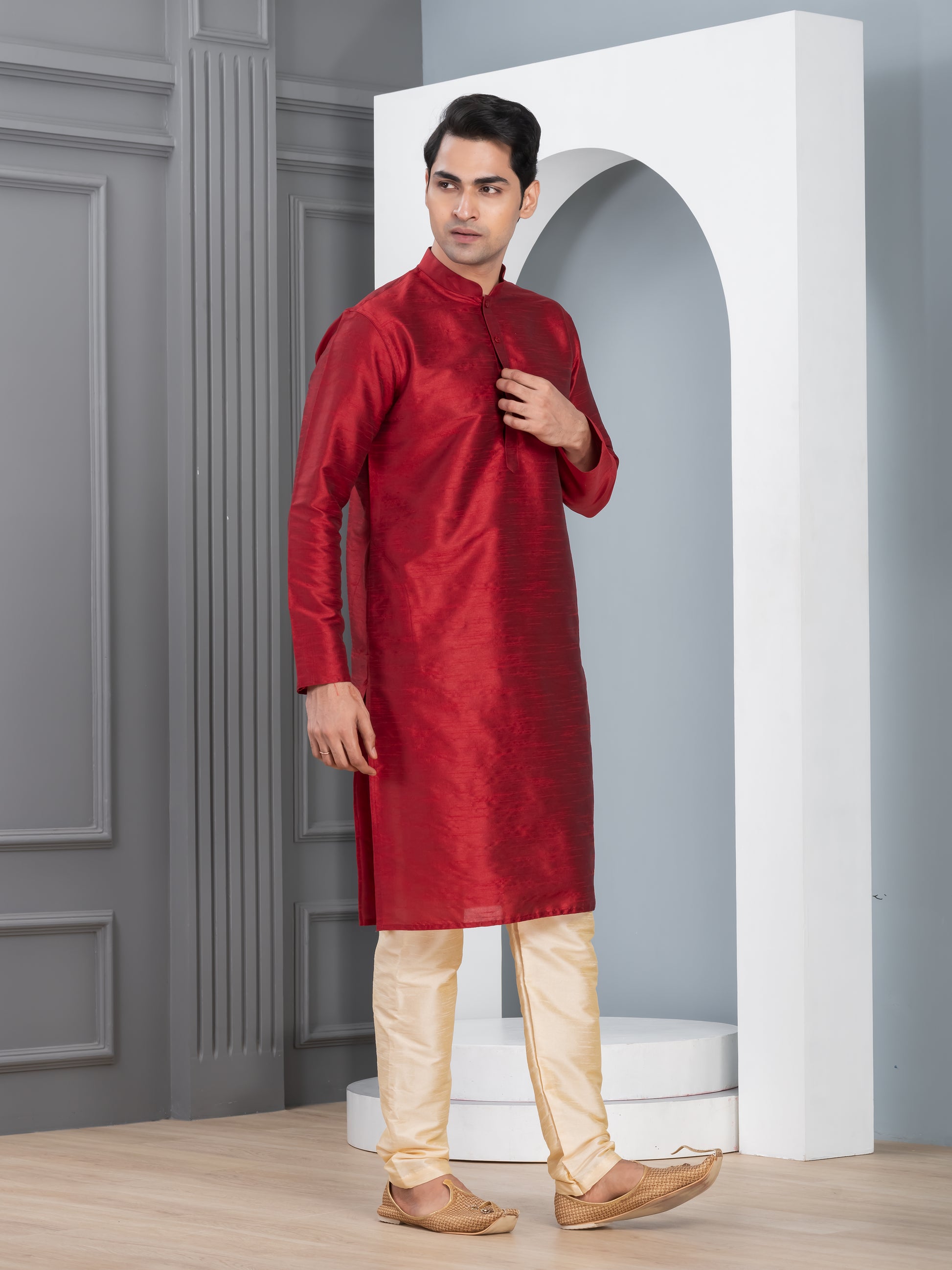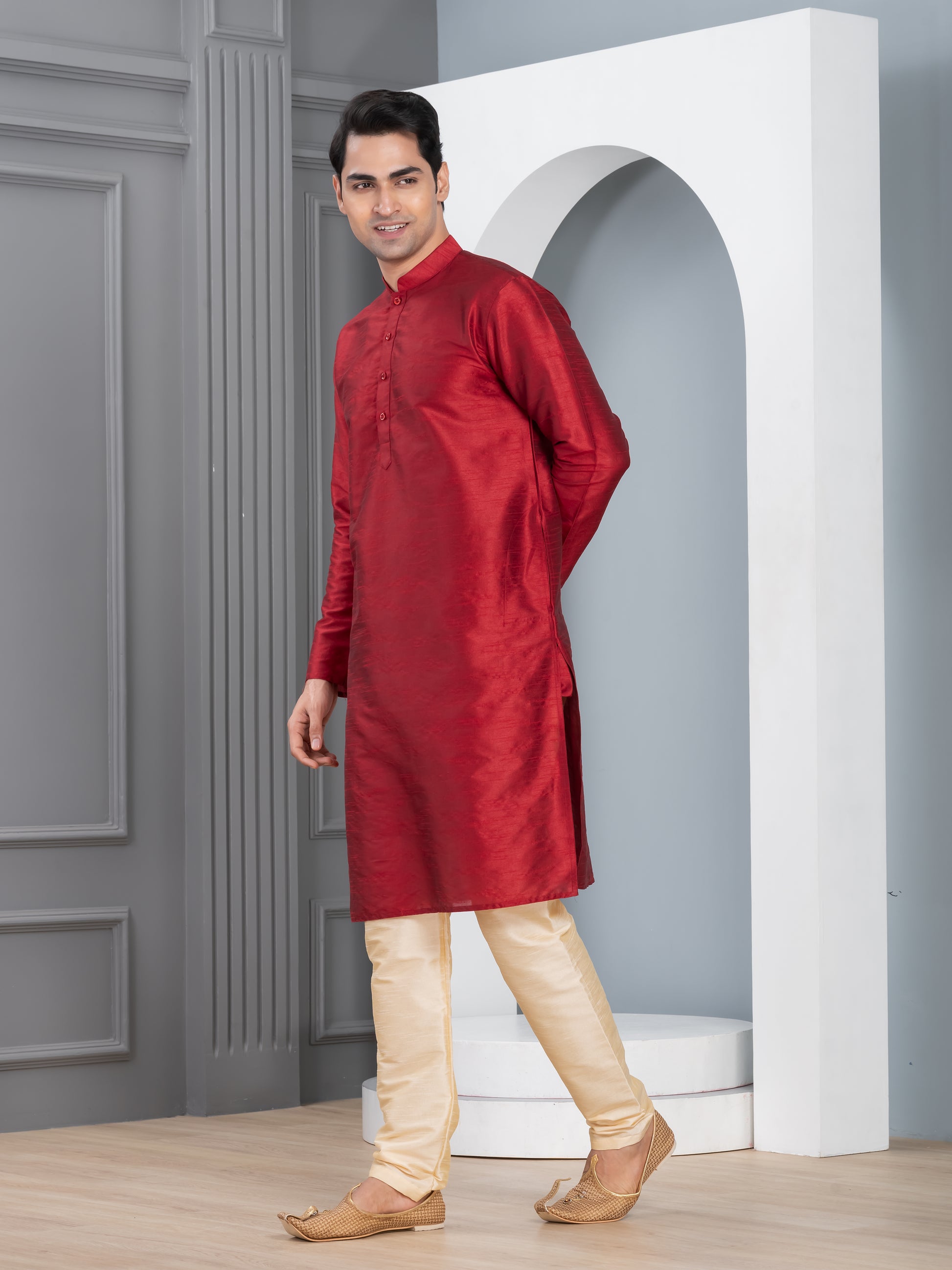 Elevate your ethnic style with this Maroon Dupion Silk Kurta and White pyjama set. Crafted from premium fabric, it offers a regal look with a refined finish. Perfect for festive occasions and celebrations.
