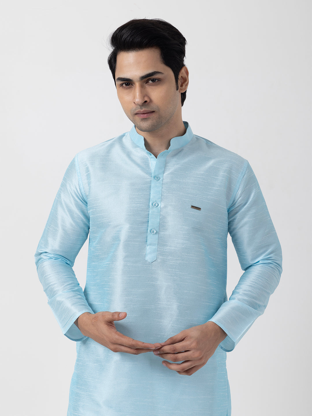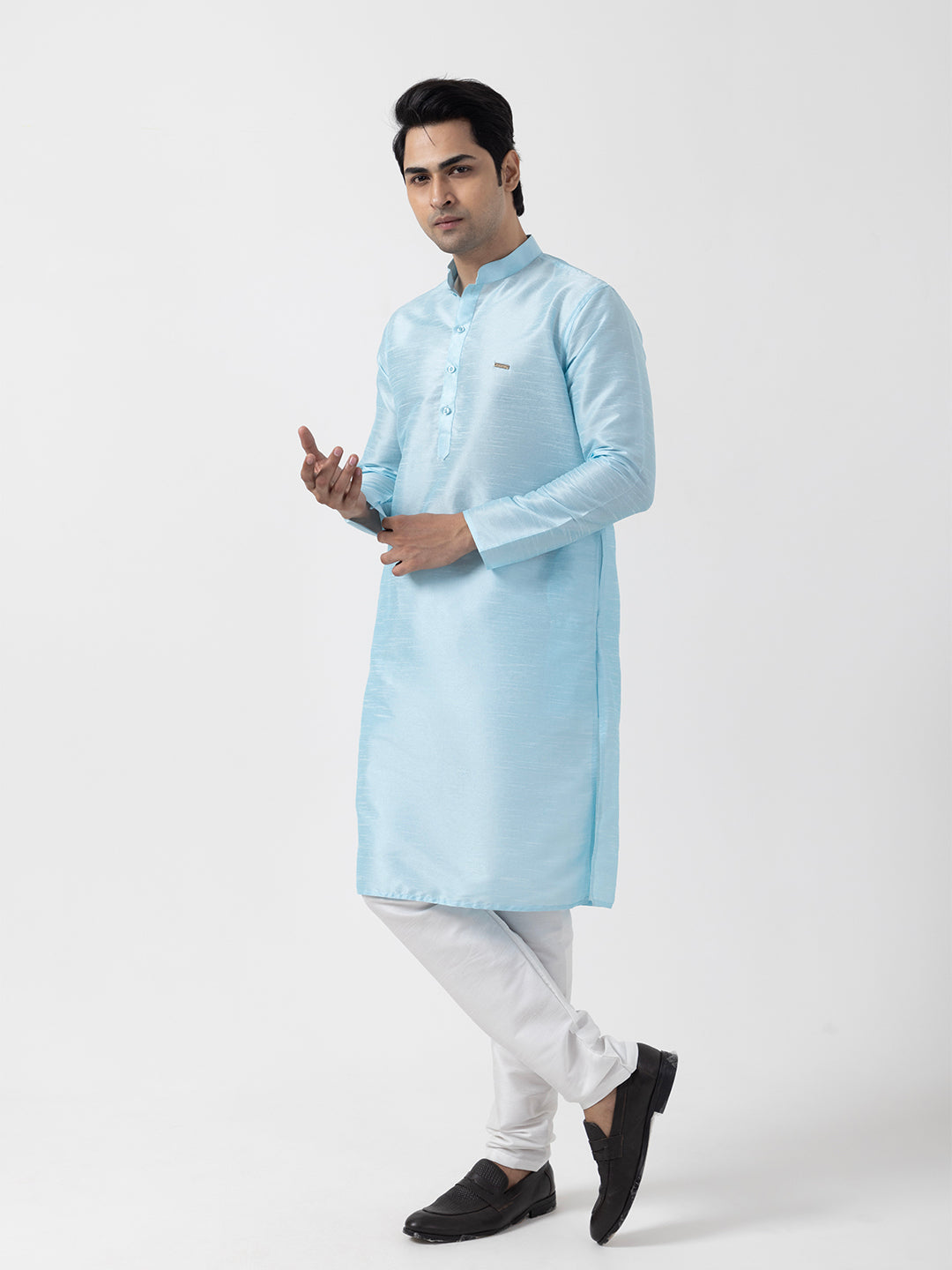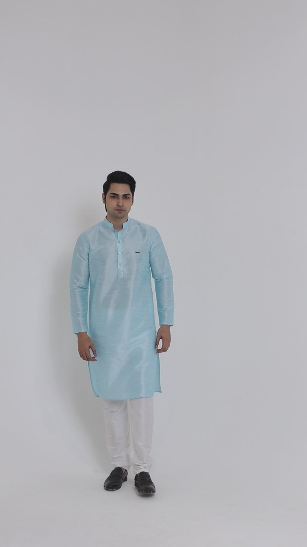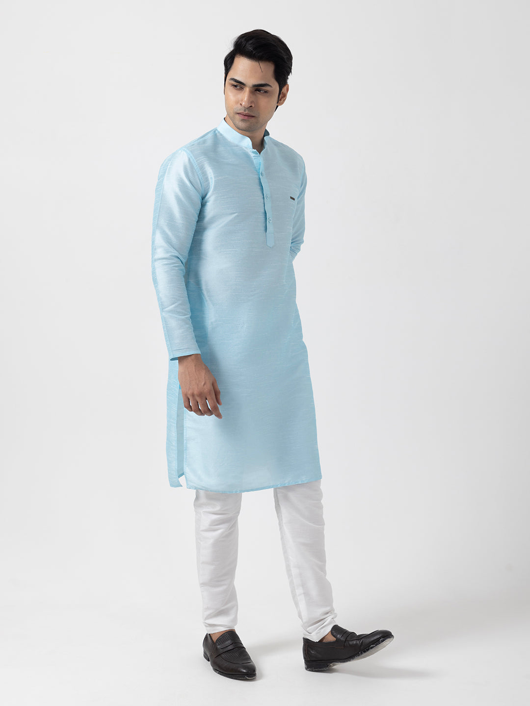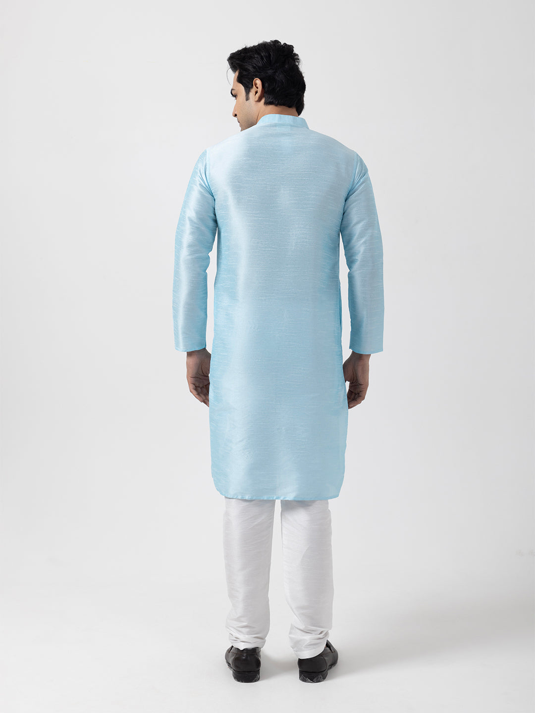 Elevate your ethnic style with this Blue Dupion Silk Kurta and White pyjama set. Crafted from premium fabric, it offers a regal look with a refined finish. Perfect for festive occasions and celebrations.