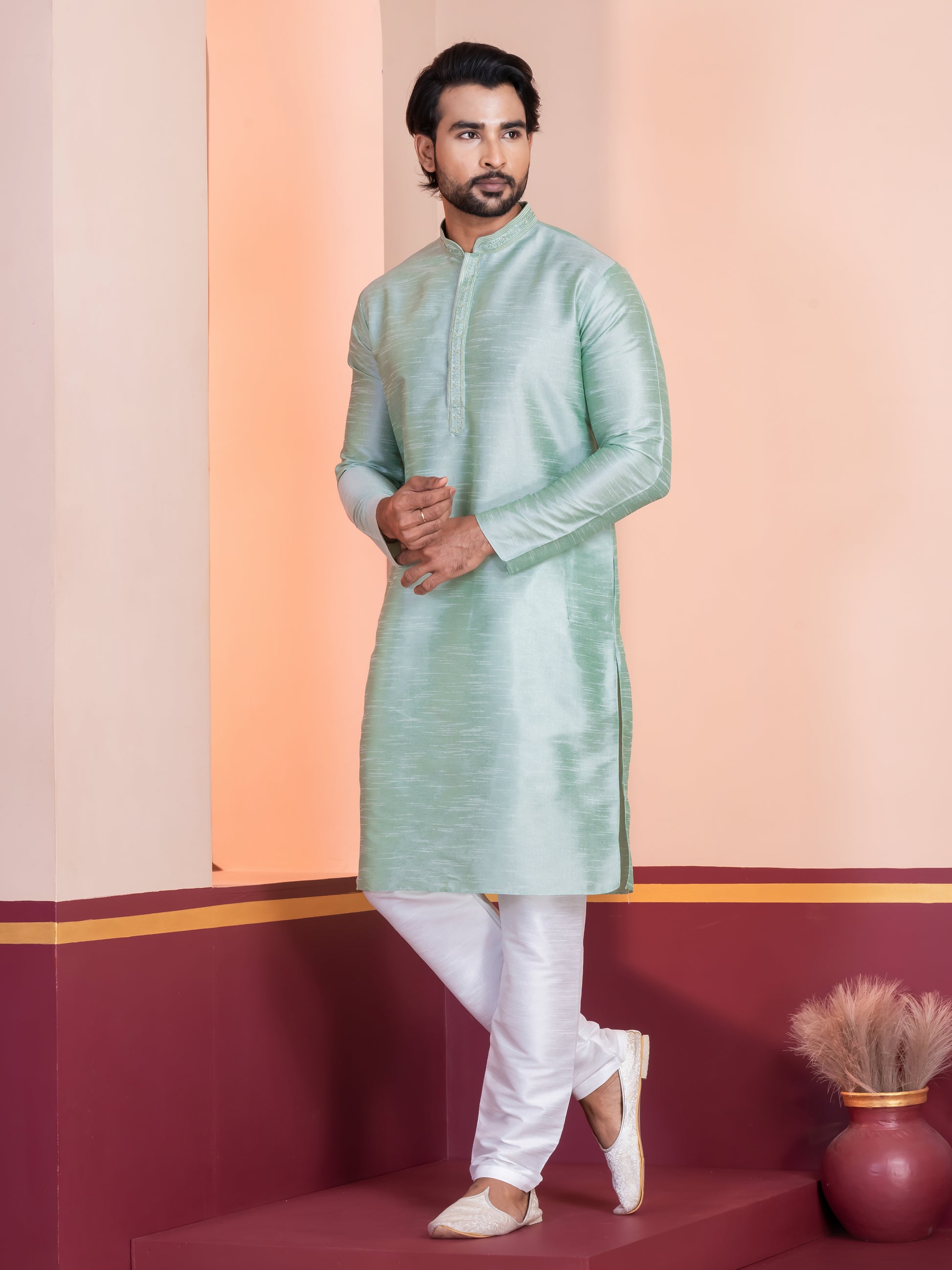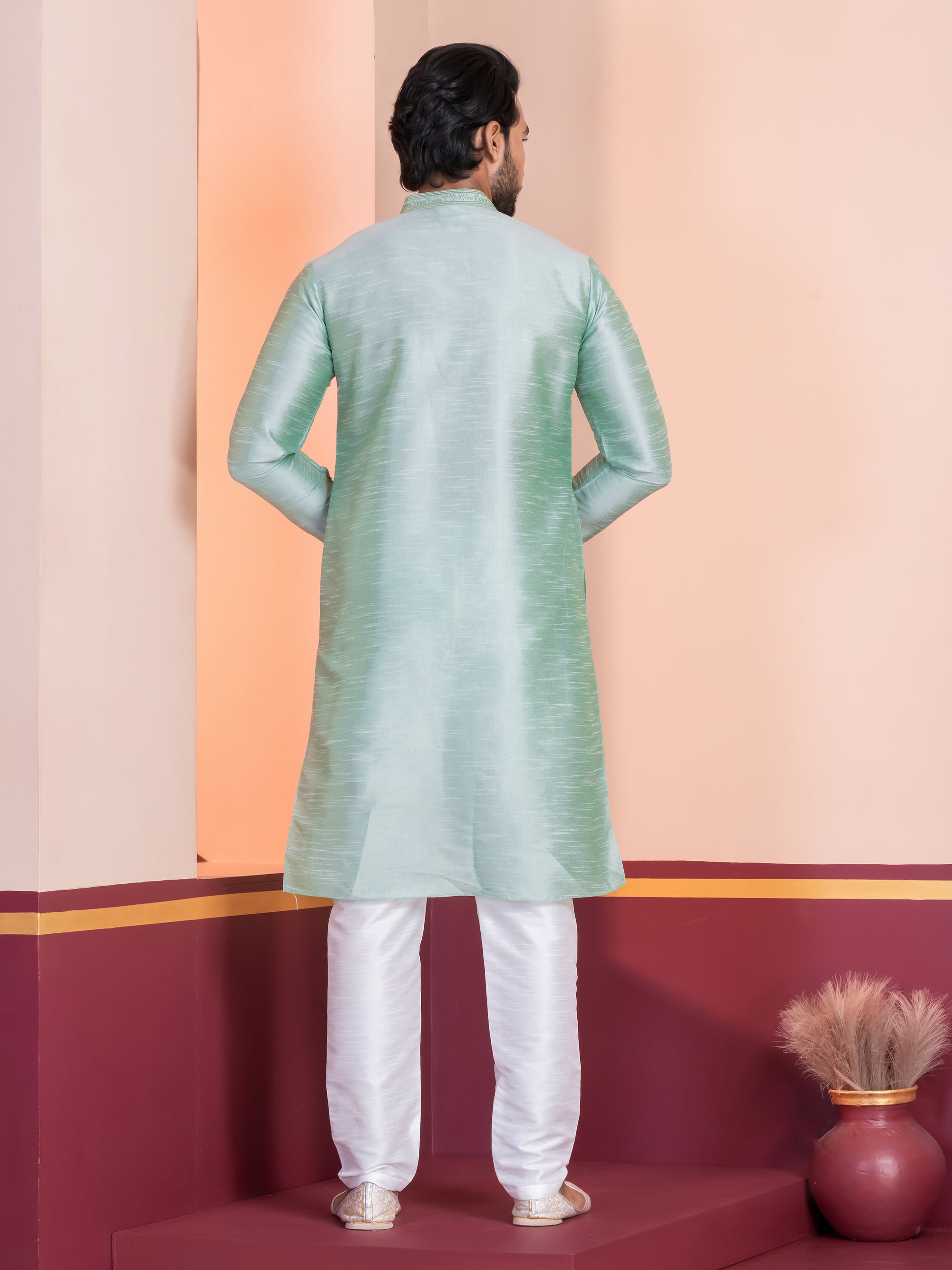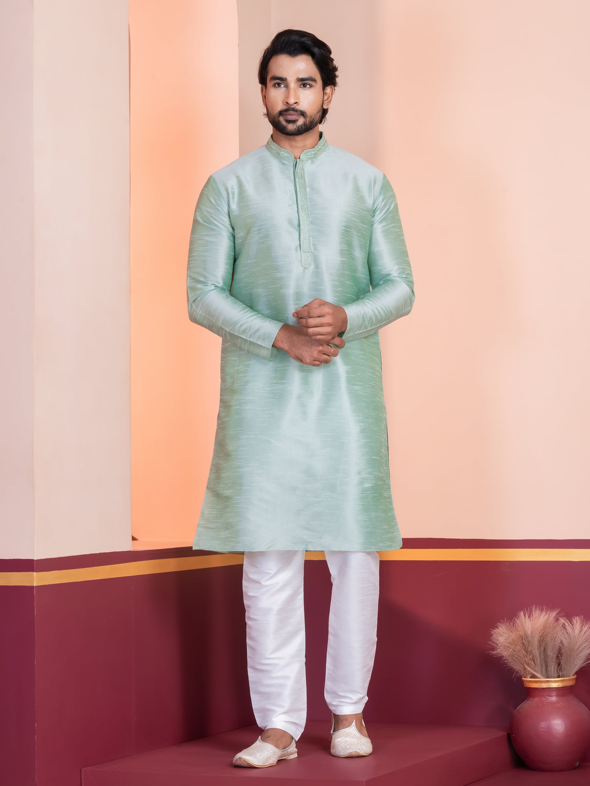 Elevate your ethnic style with this Green Dupion Silk Kurta and White pyjama set. Crafted from premium fabric, it offers a regal look with a refined finish. Perfect for festive occasions and celebrations.
