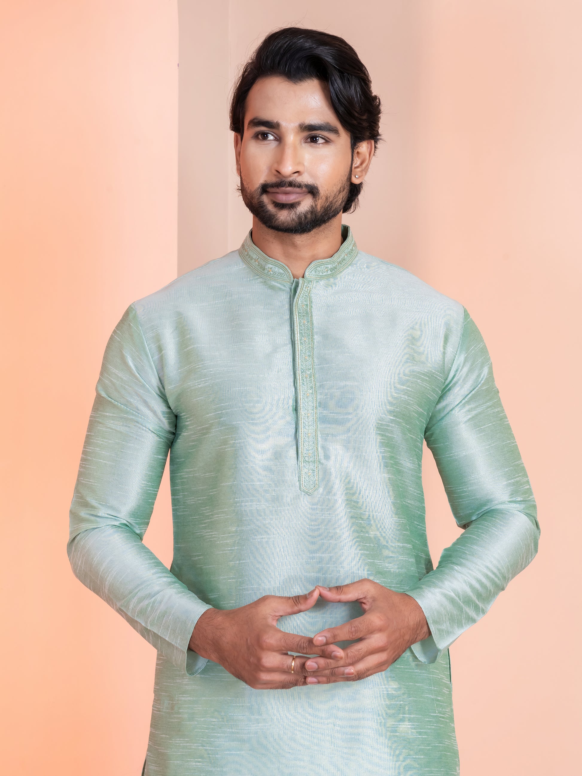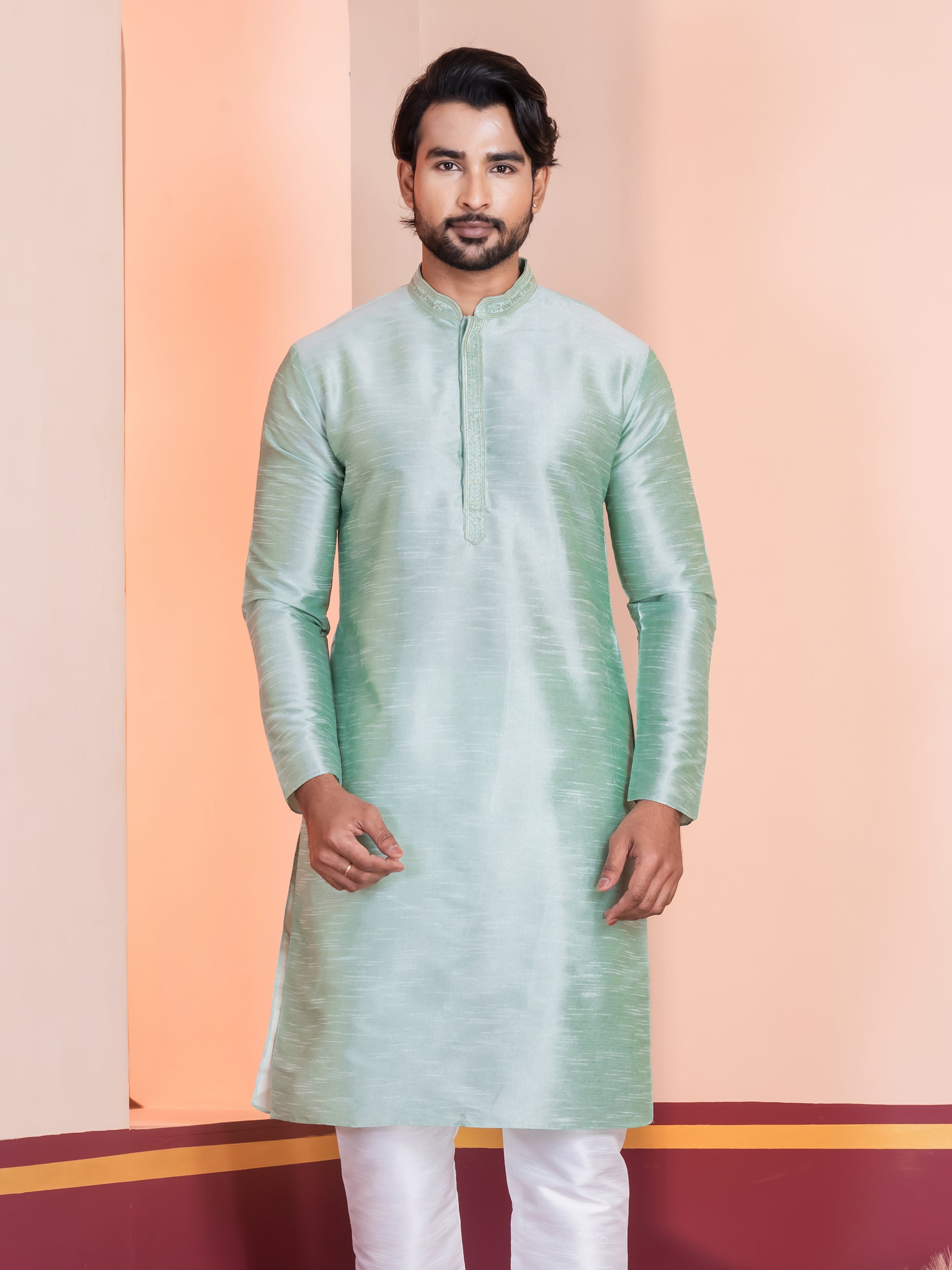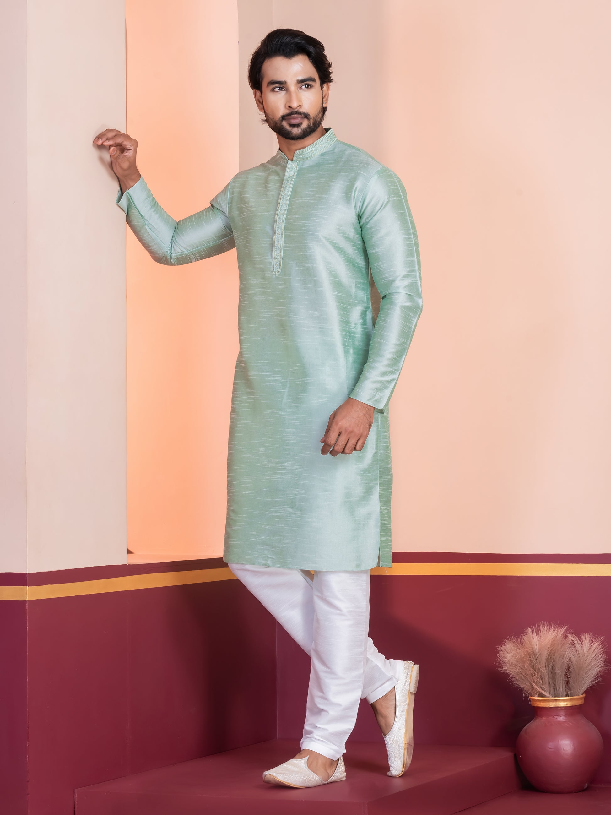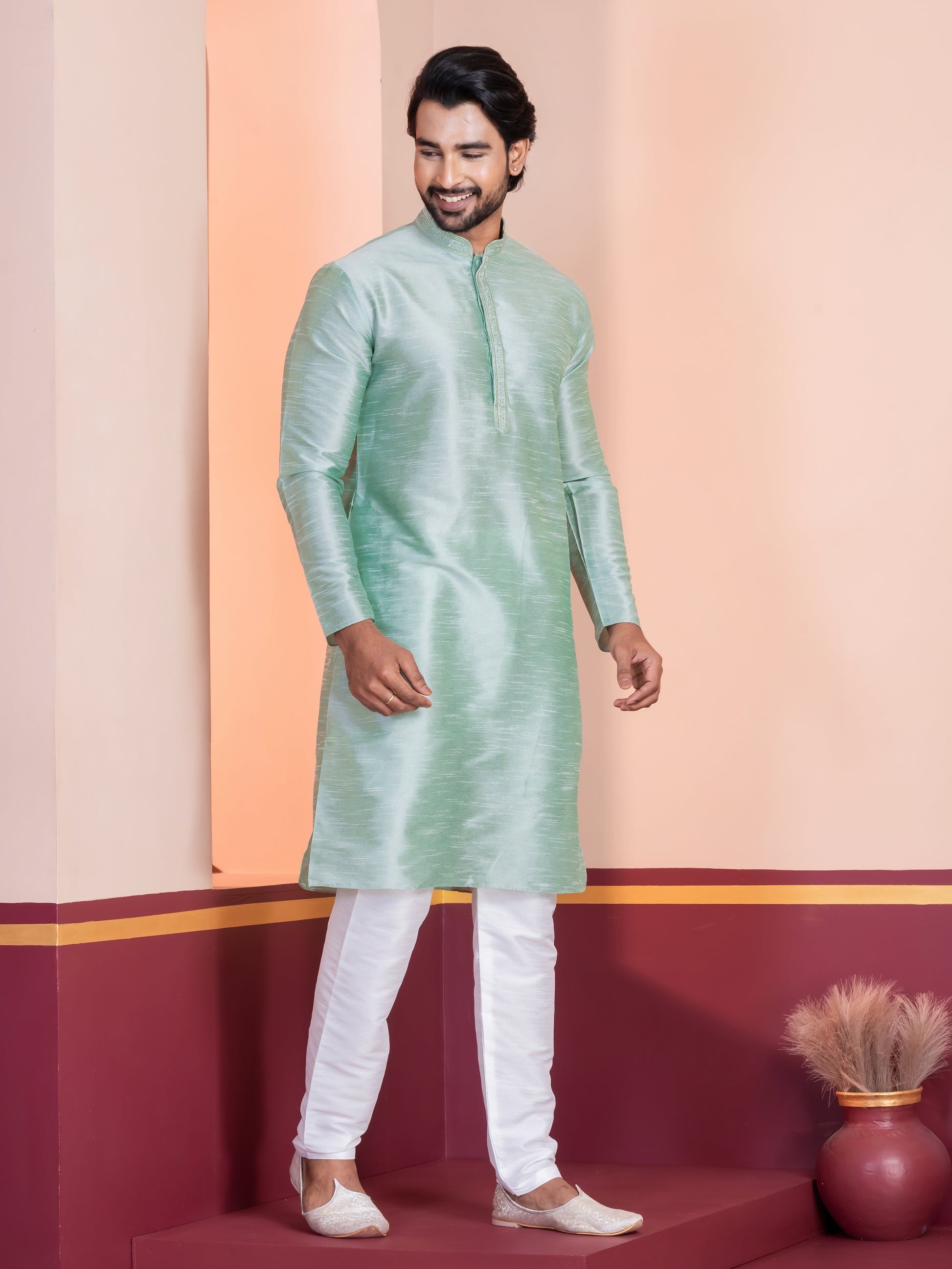 Elevate your ethnic style with this Green Dupion Silk Kurta and White pyjama set. Crafted from premium fabric, it offers a regal look with a refined finish. Perfect for festive occasions and celebrations.